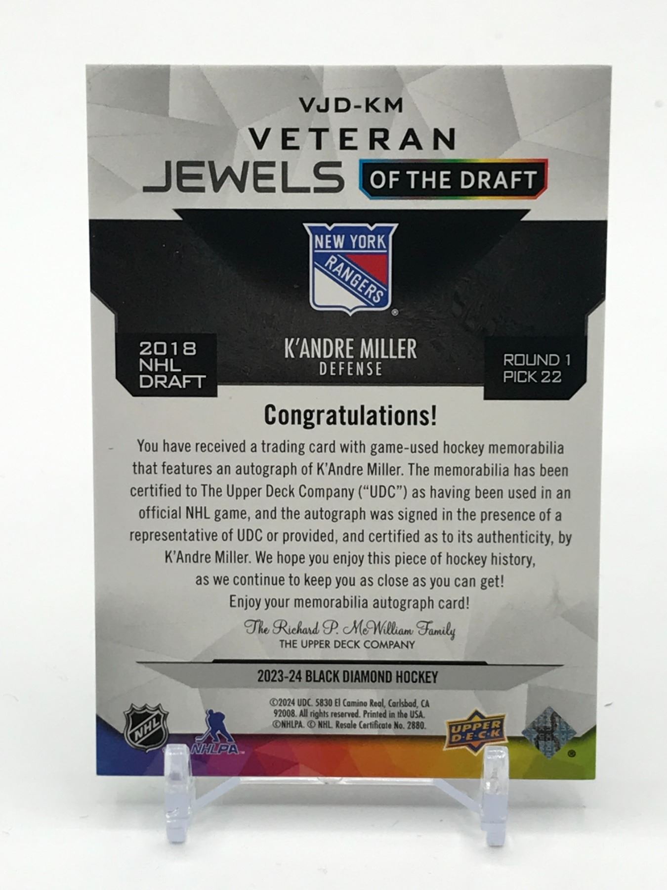 Lot 457 2023-24 UPPER DECK BLACK DIAMOND HOCKEY K'ANDRE MILLER SIGNED PATCH TRADING CARD