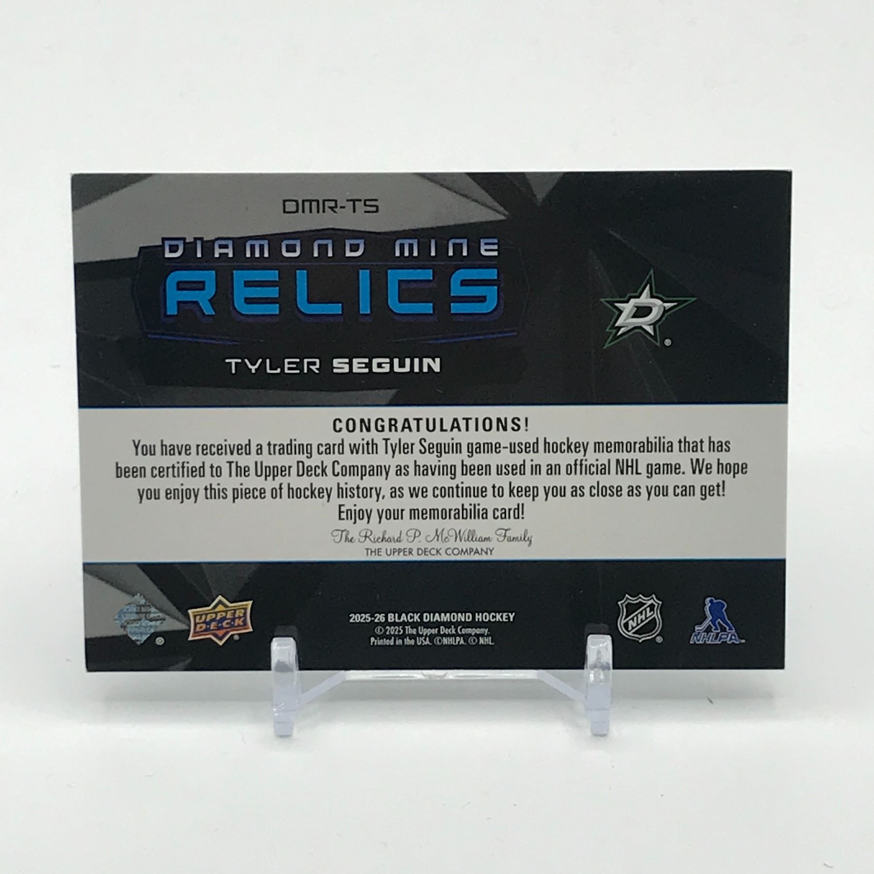 Lot 459 2025-26 UPPER DECK BLACK DIAMOND HOCKEY RELICS TYLER SEQUIN PATCH TRADING CARD
