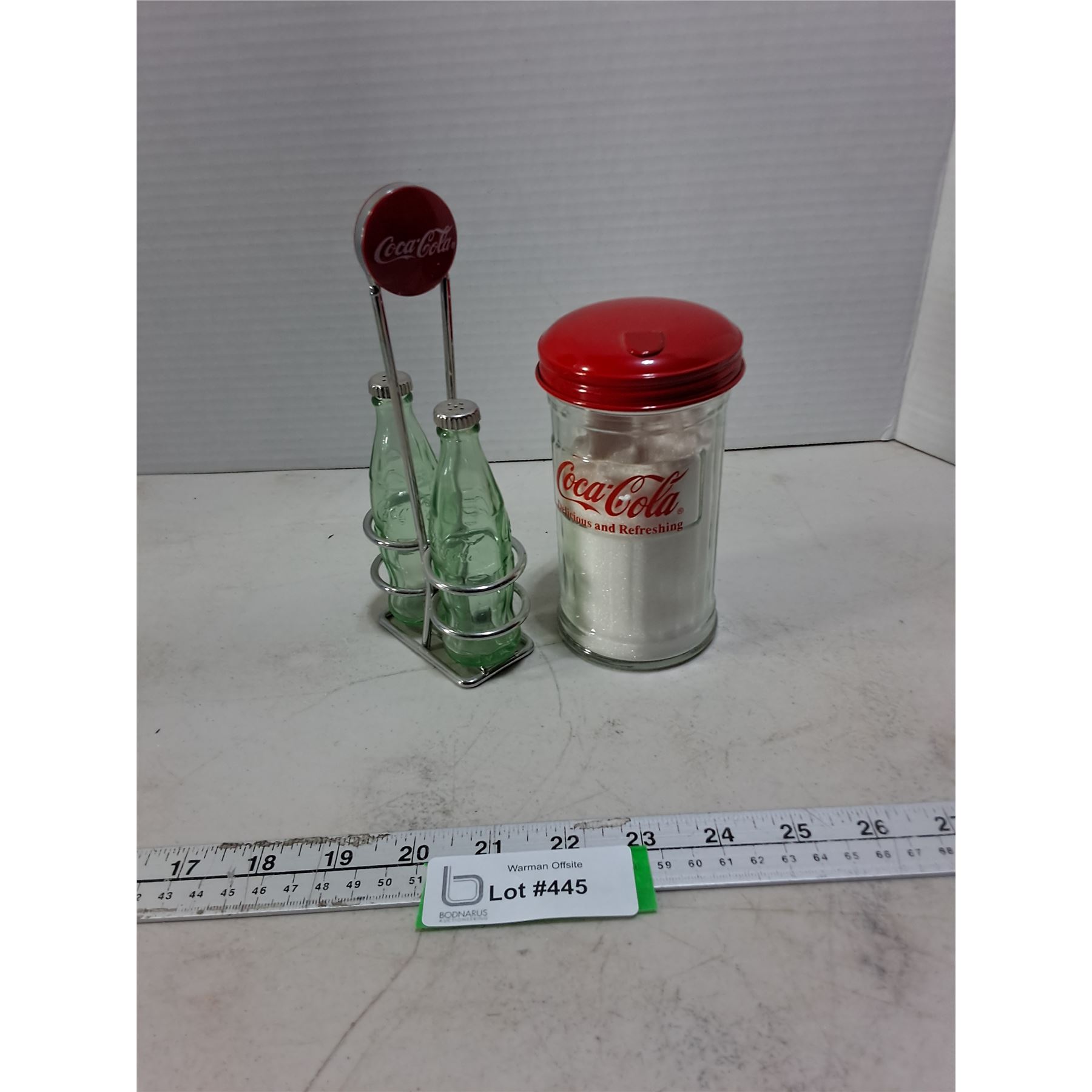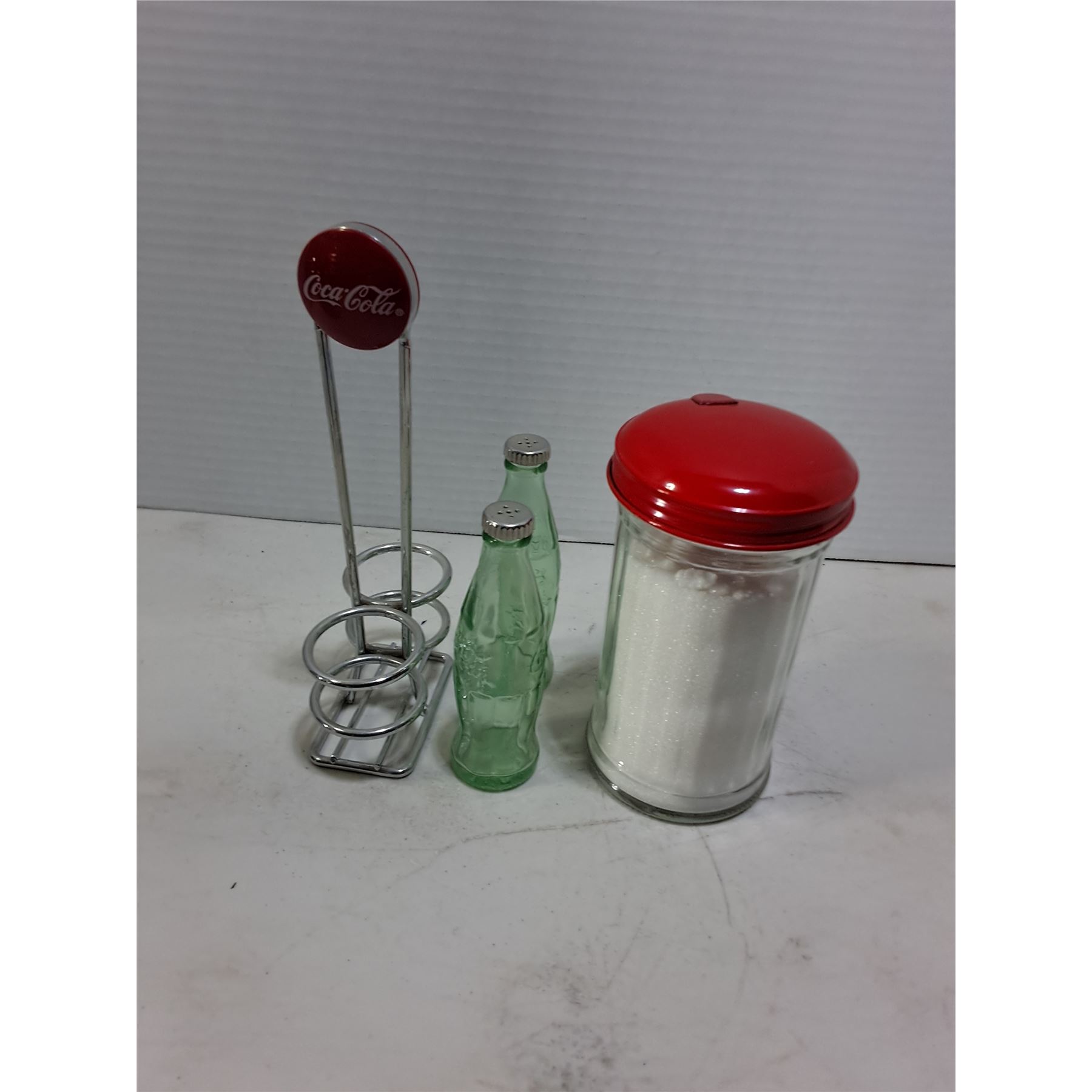 Lot 445 Coca-Cola Shakers & Caddy, Sugar Dispenser