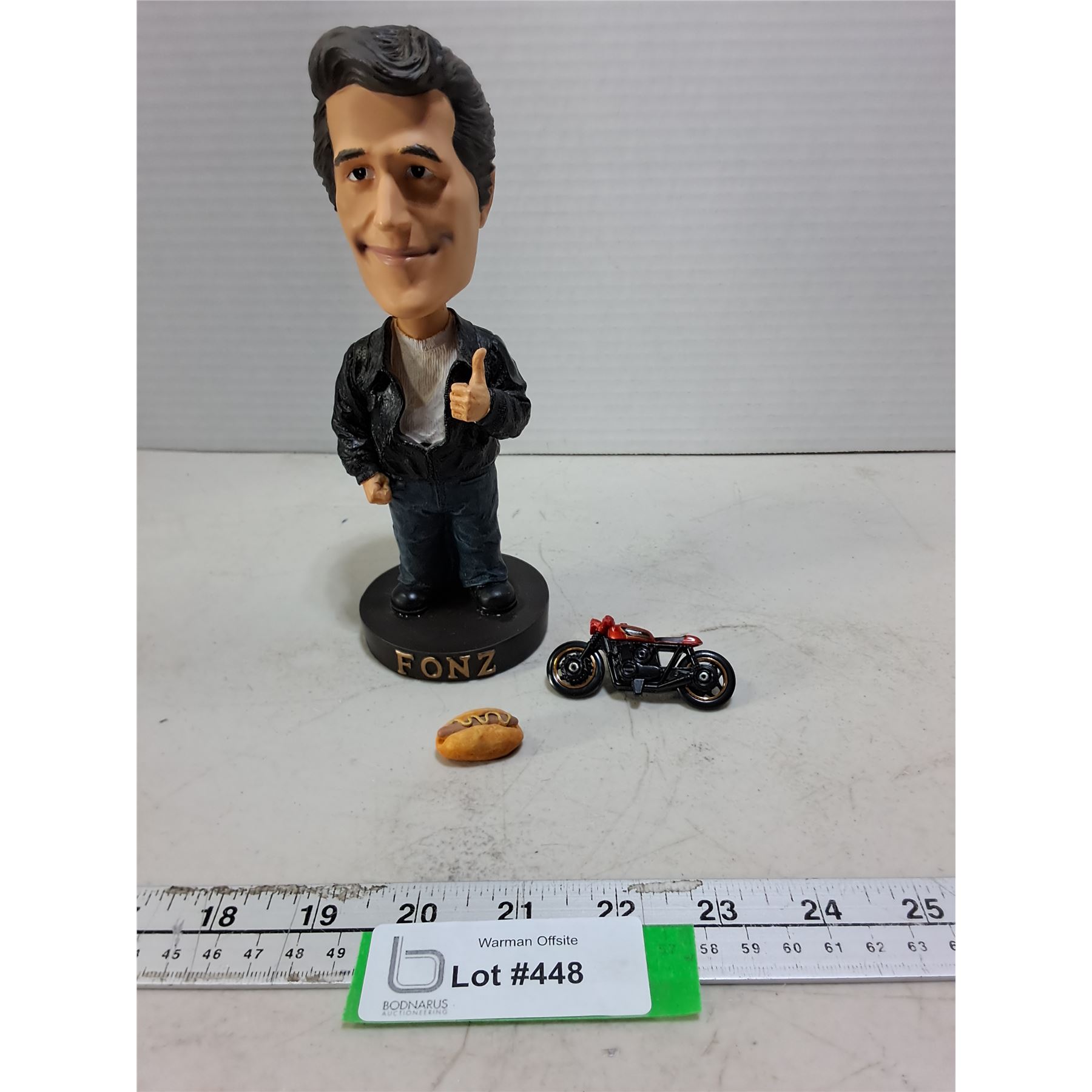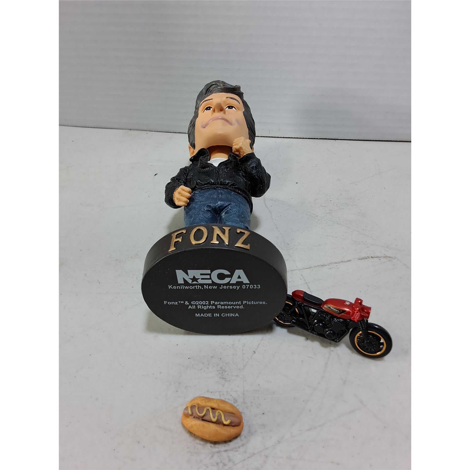 Lot 448 Neca Happy Days "The Fonz" Bobblehead, Ornamental Honda Motorcycle & Dressed Hot Dog