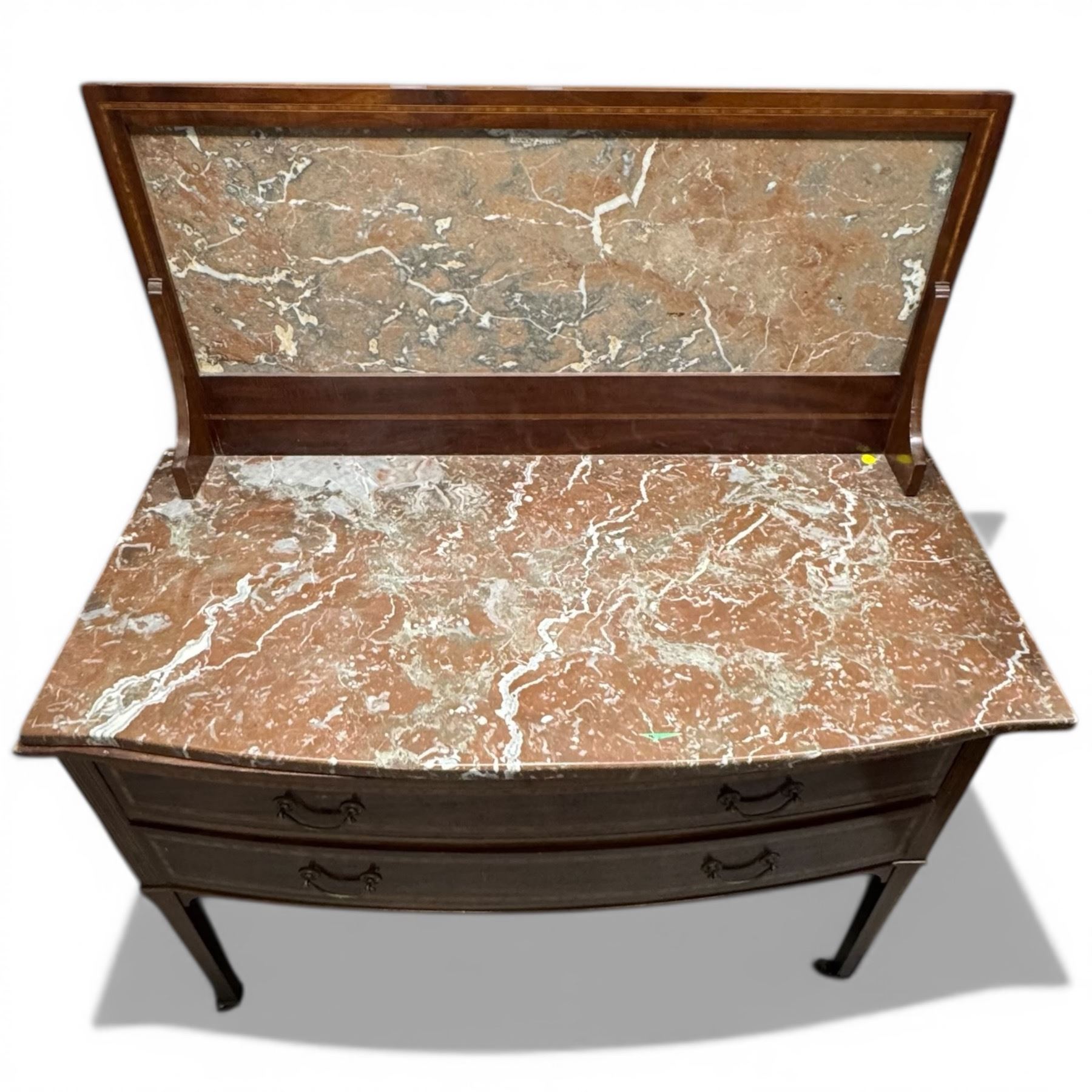Lot 1023 Antique Wooden Washstand Featuring a Marble Top and Backsplash 42.5x20.5x47"