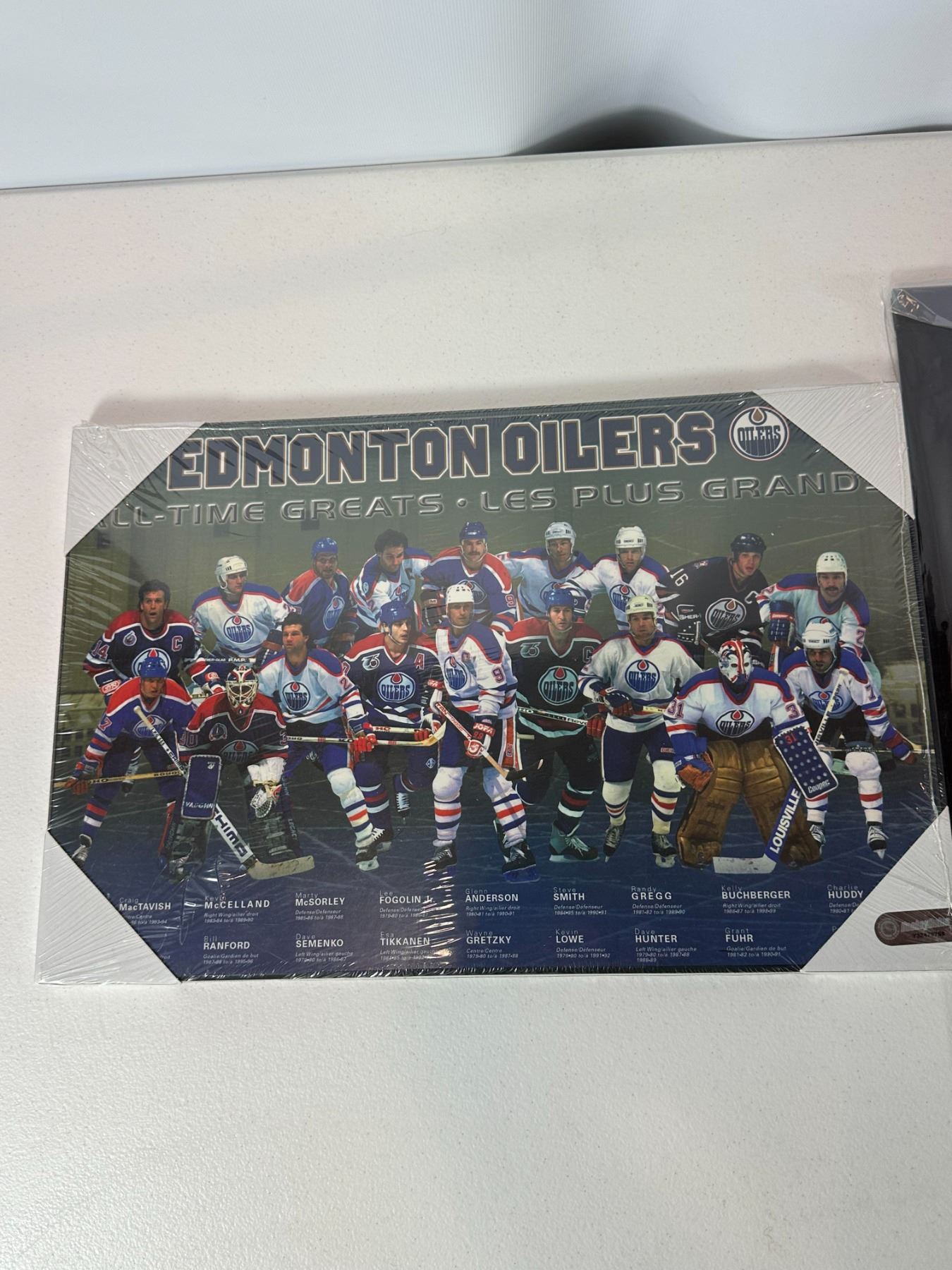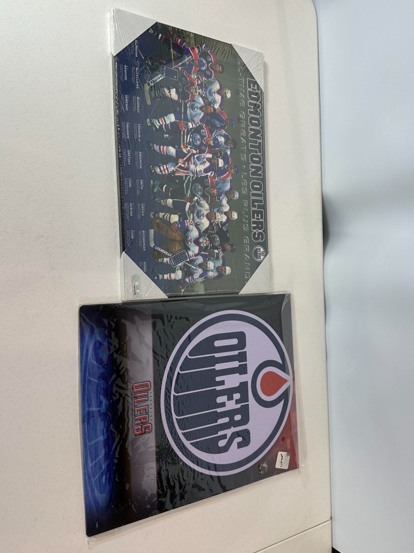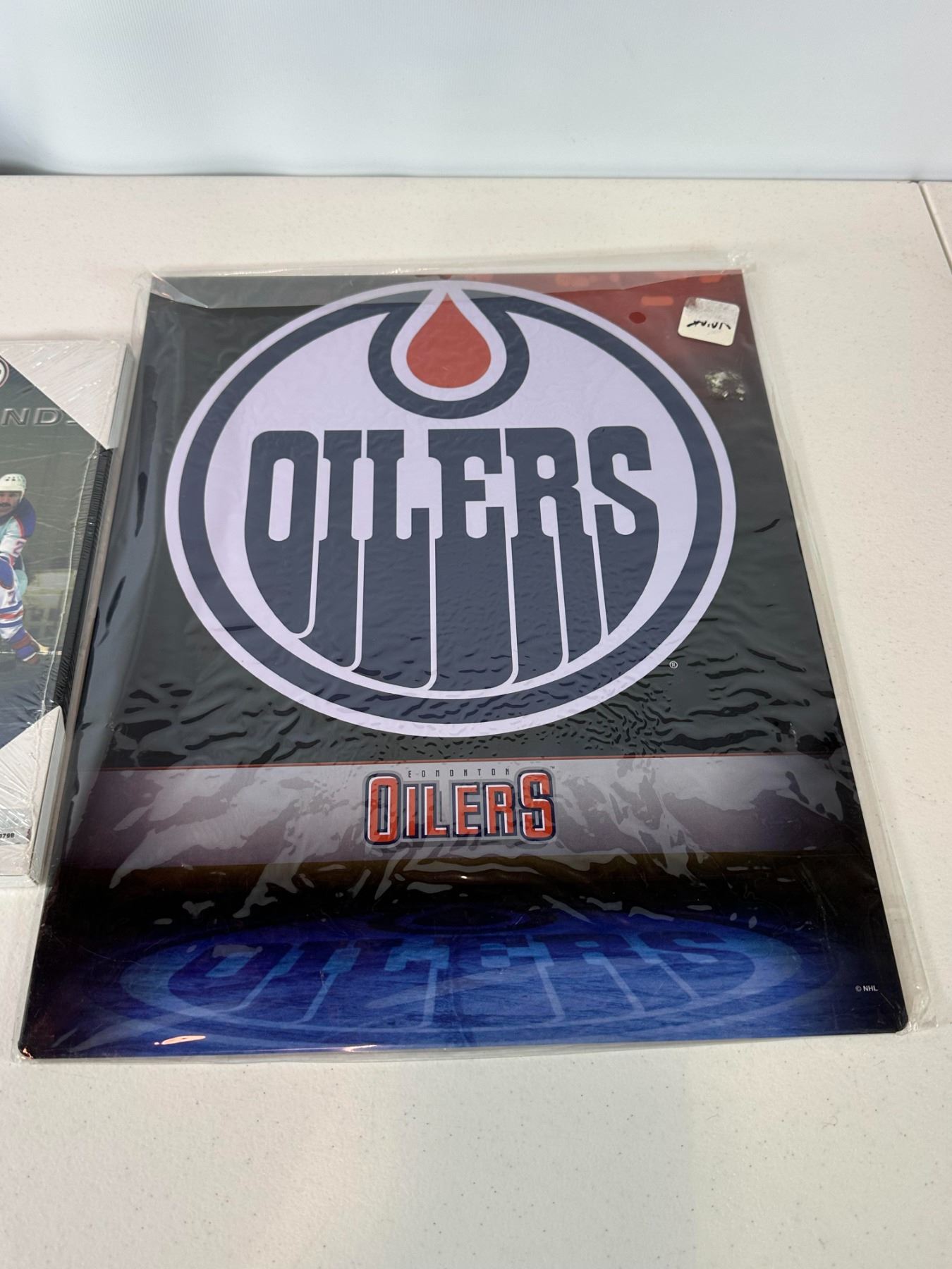 Set of two Edmonton Oilers signs, including a 'Captains' themed piece featuring notable team leaders and a separate metal Oilers logo sign. Both items are new in packaging and make great additions for fans or collectors of NHL memorabilia.
