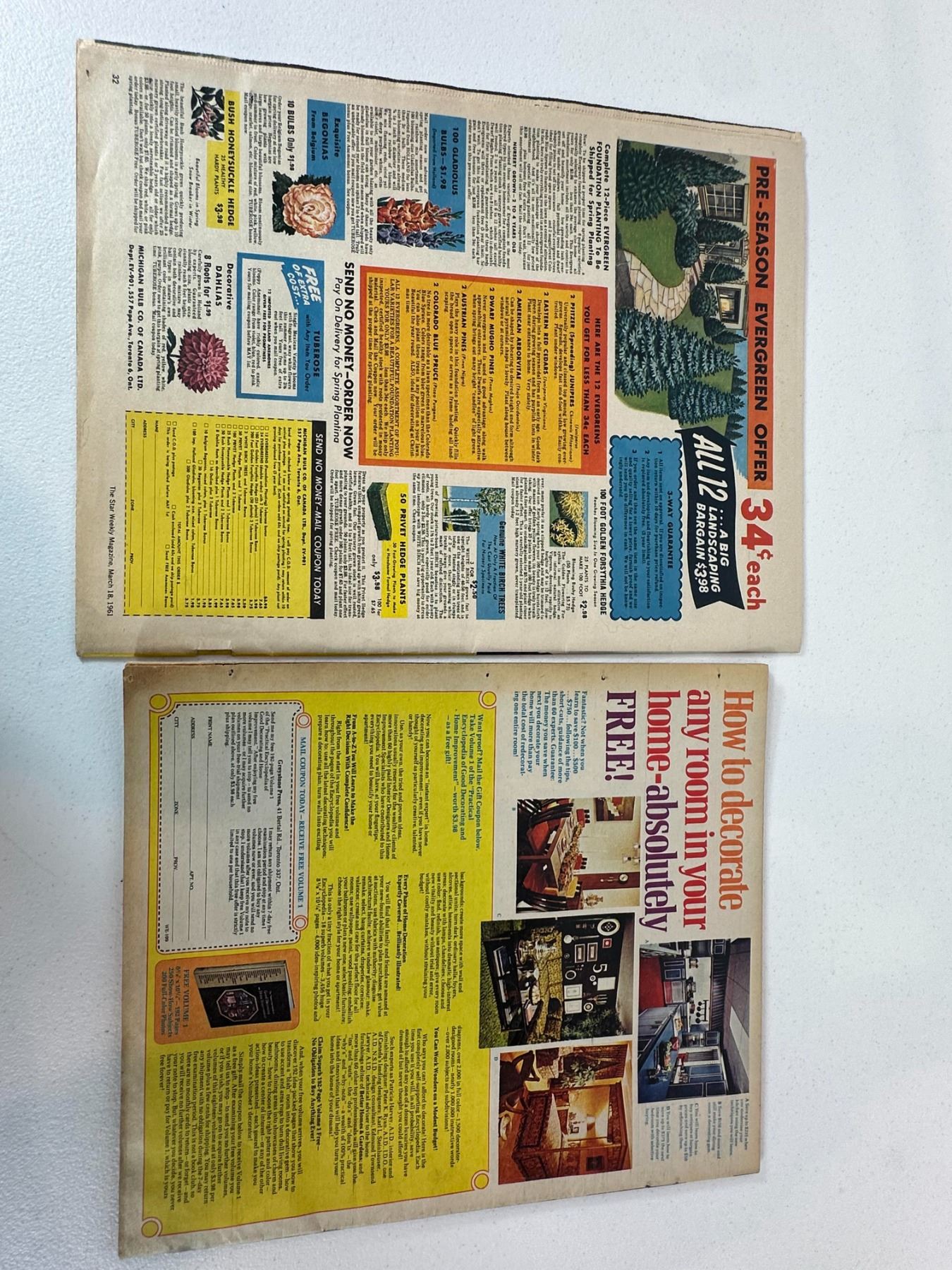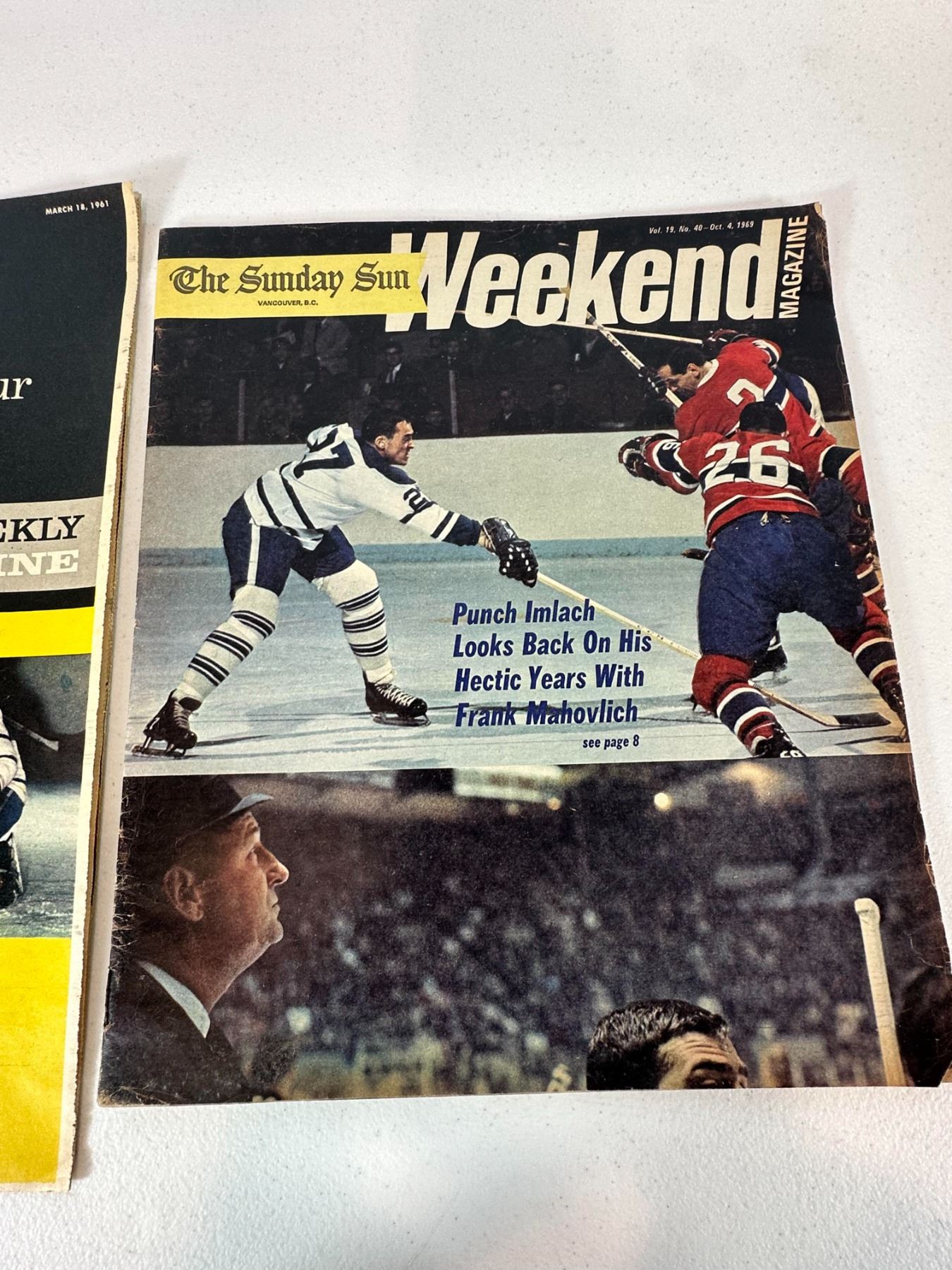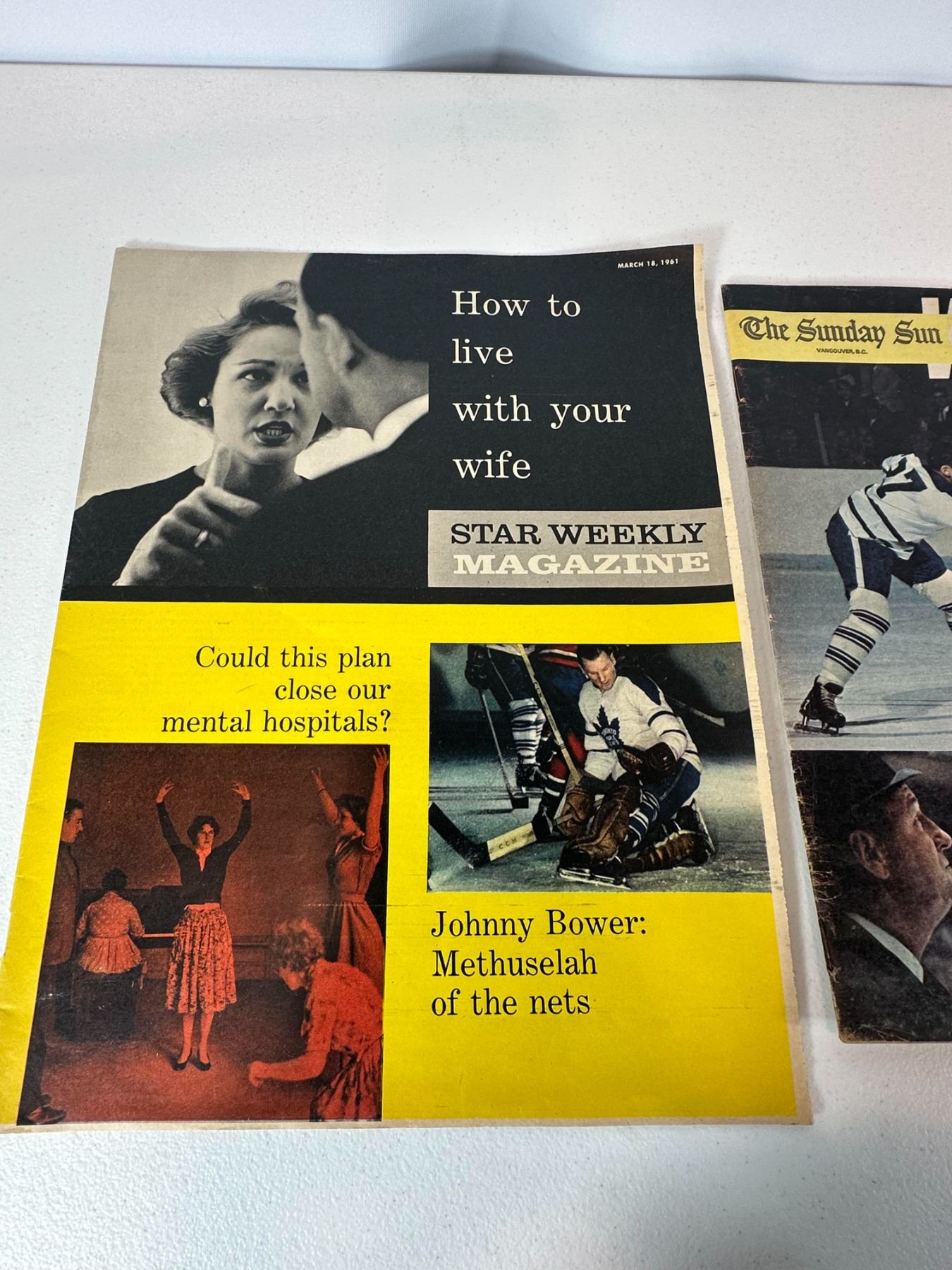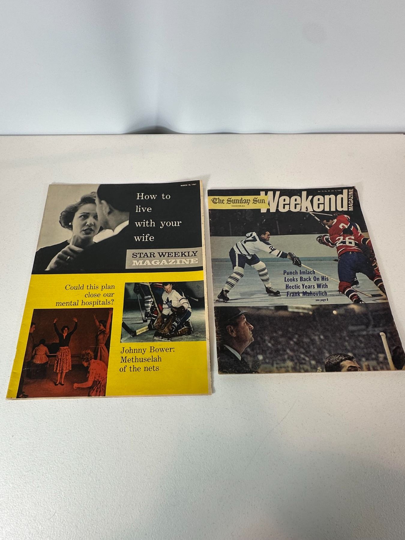 Pair of vintage 1960s hockey magazines including Star Weekly Magazine featuring Johnny Bower ('Methuselah of the nets') and The Sunday Sun Weekend Magazine highlighting Frank Mahovlich. Both publications showcase classic NHL-era photography and articles, offering strong nostalgic appeal for hockey collectors and vintage sports memorabilia enthusiasts.