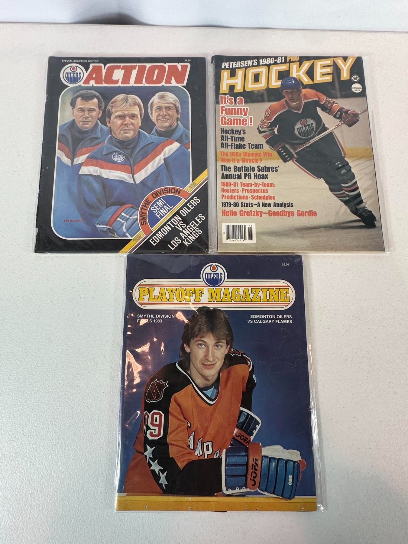 Group of three Edmonton Oilers programs and magazines from the early 1980s dynasty era. Includes 'Oilers Action' Smythe Division Semi-Final vs Los Angeles Kings, Petersen’s 1980–81 Pro Hockey magazine featuring an Oilers cover, and Oilers Playoff Magazine (1983) featuring Wayne Gretzky. A great lot highlighting the rise of the Oilers and Gretzky era.