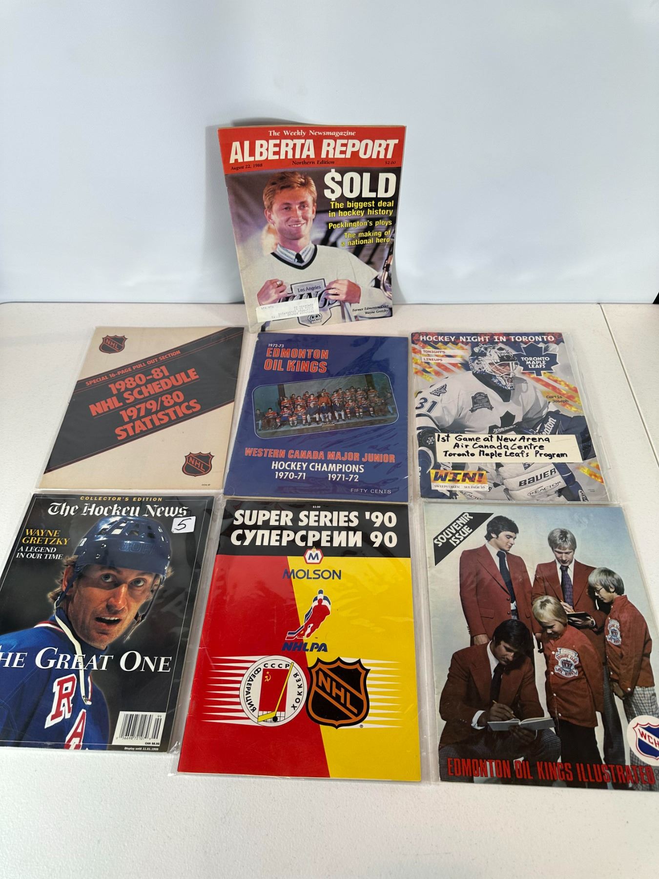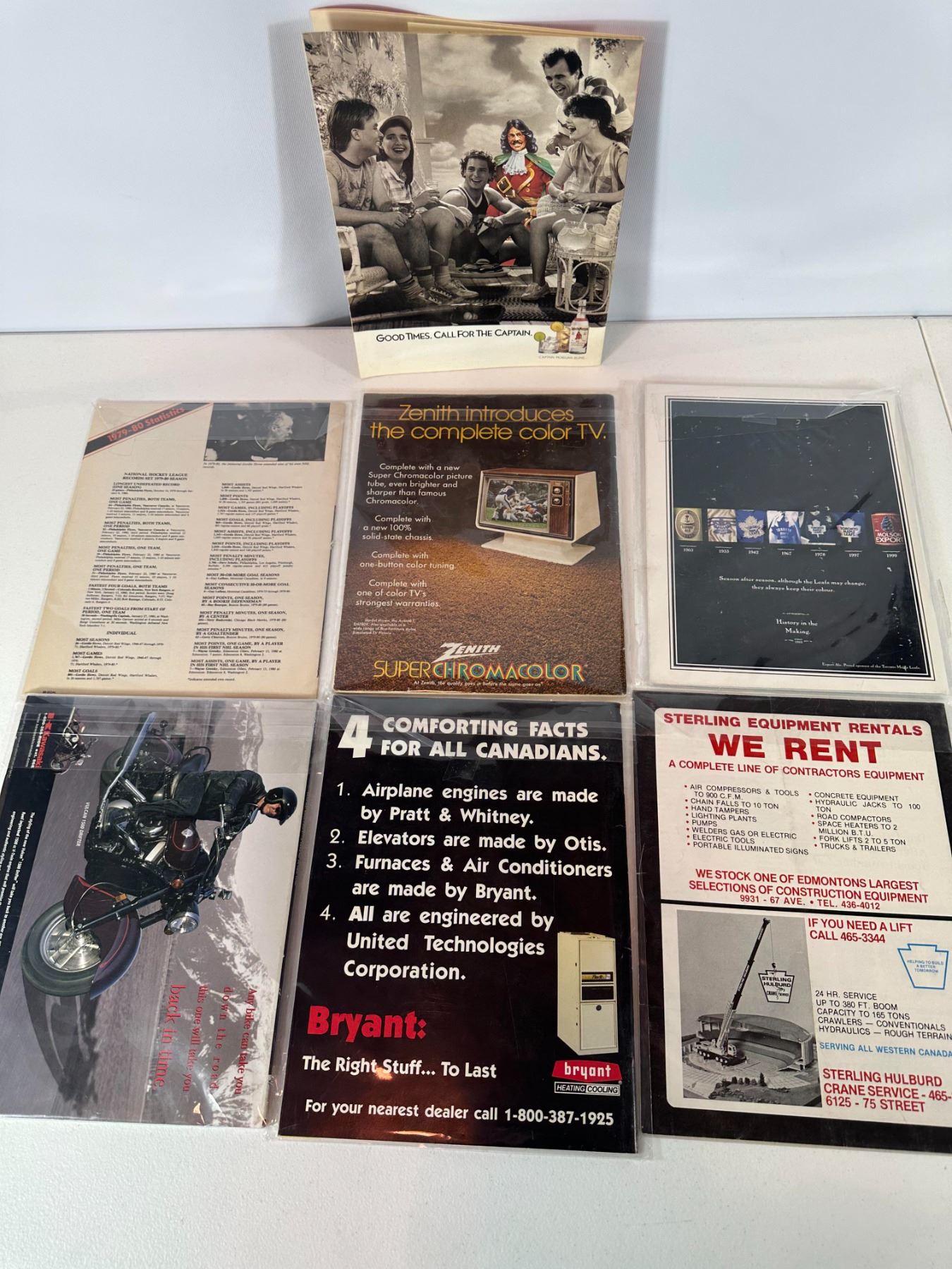 Collection of seven vintage NHL-related magazine inserts and advertising pages, including league statistics, team promotional material, and period advertisements. Features a mix of hockey content and commercial print pieces from the era. An interesting ephemera lot for hockey memorabilia collectors and vintage advertising enthusiasts.
