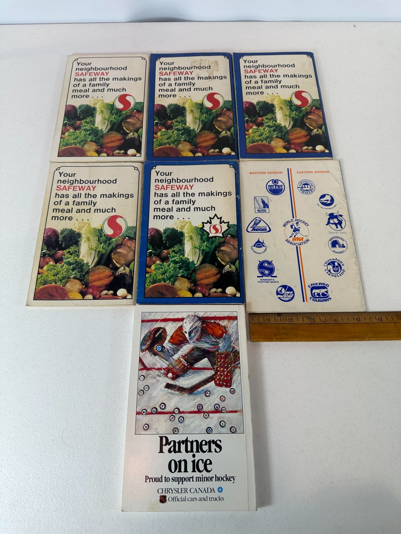 Collection of 7 early Edmonton Oilers media/guide books including seasons from the WHA era through early NHL years (1970s–1980s). Includes duplicates and various editions such as 1973-74 guide, 1979-80, 1980-81, 1981-82, 1983-84 and others. Good vintage condition with some wear. Great lot for Oilers collectors.