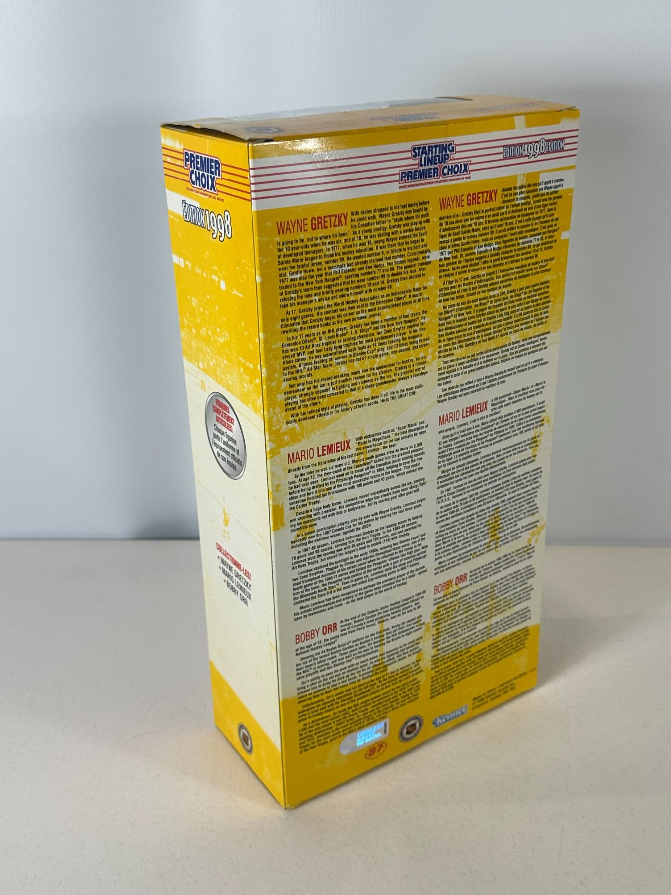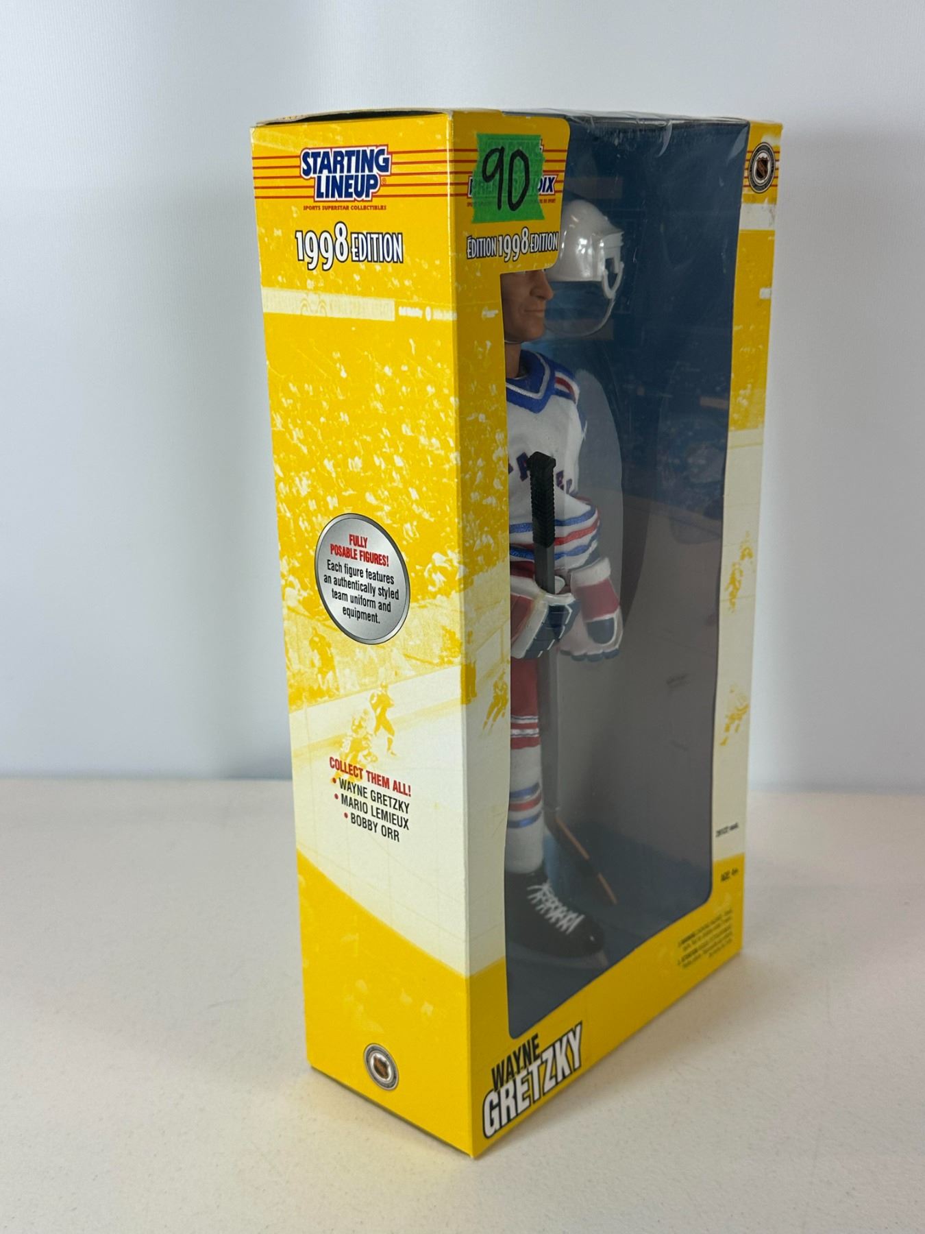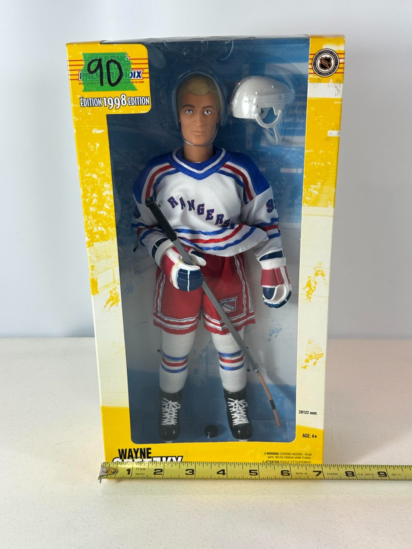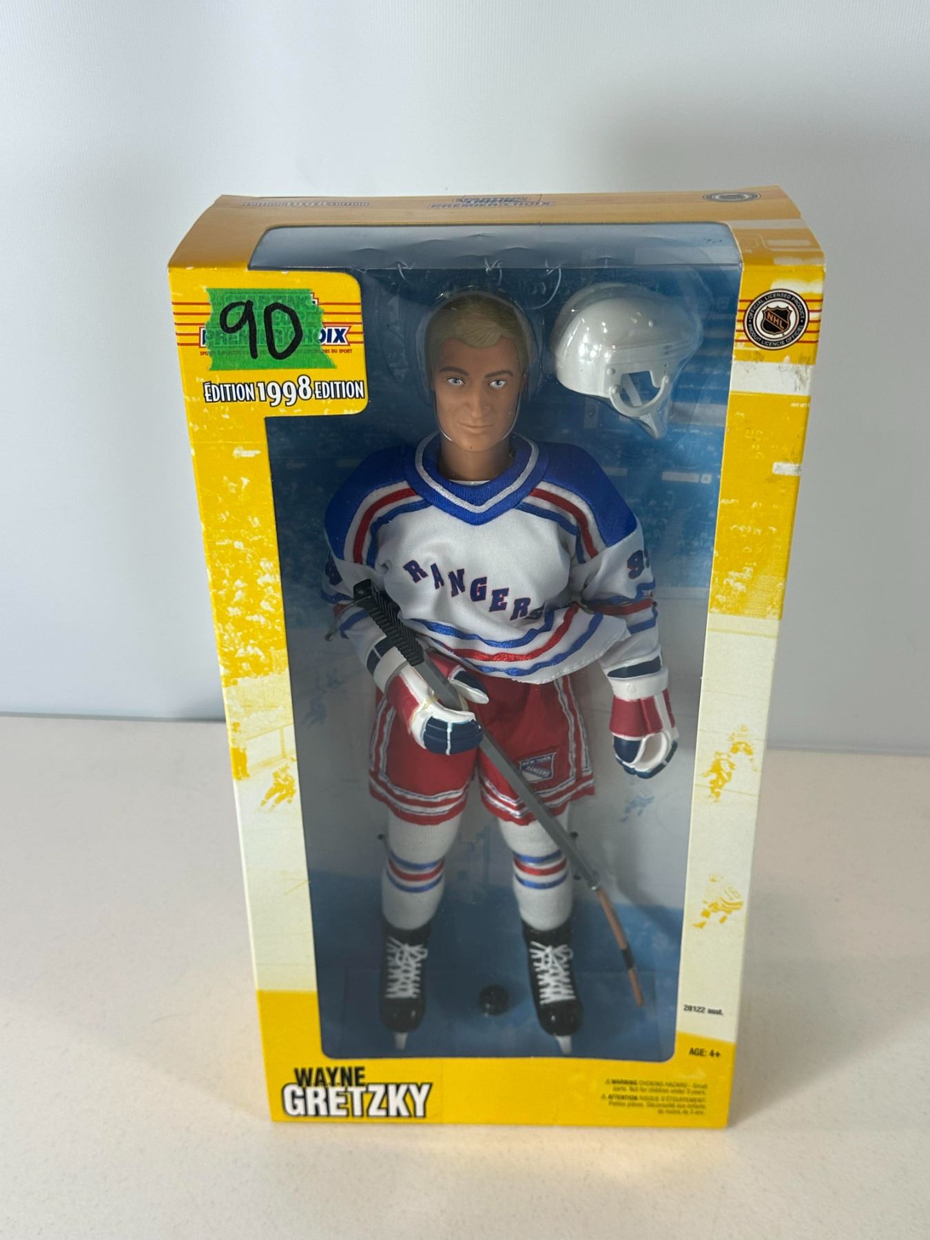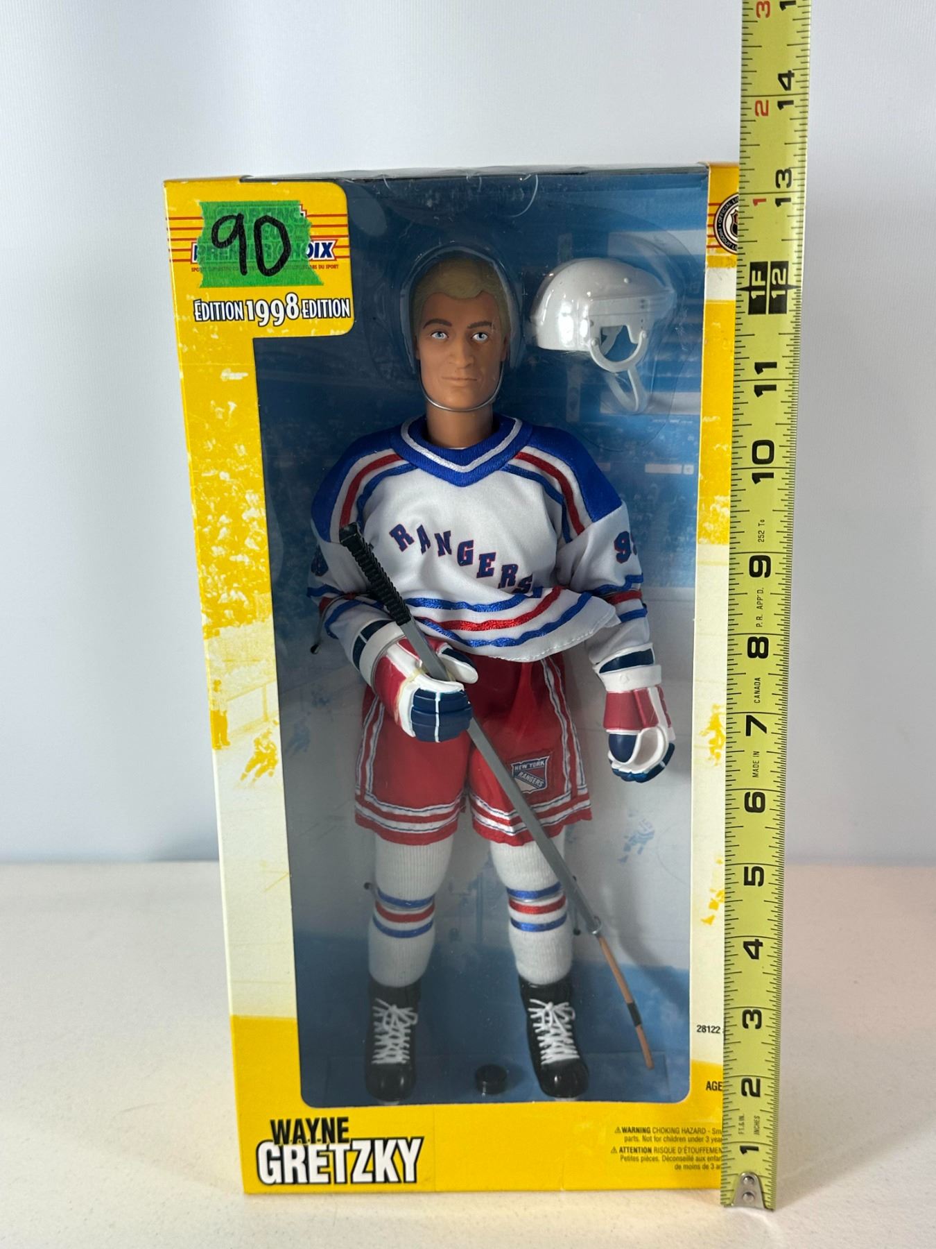 New old stock (NOS) 12-inch limited edition Wayne Gretzky action figure in New York Rangers uniform, commemorating his retirement era. Officially licensed NHL collectible, complete with original packaging and accessories including helmet and stick. A standout piece for collectors honoring the final chapter of 'The Great One’s' legendary career.