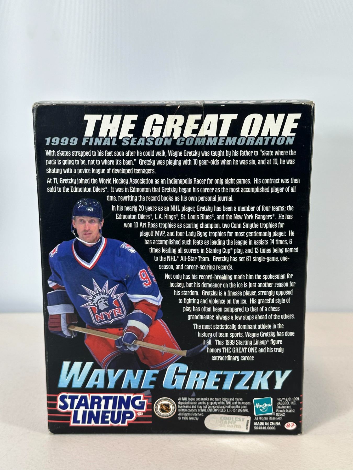 New old stock (NOS) Starting Lineup Wayne Gretzky 'Final Season' figure featuring him in New York Rangers uniform. Displayed in original packaging with rink-style base, commemorating Gretzky’s final NHL season. A collectible tribute piece for fans of 'The Great One' and hockey memorabilia collectors.