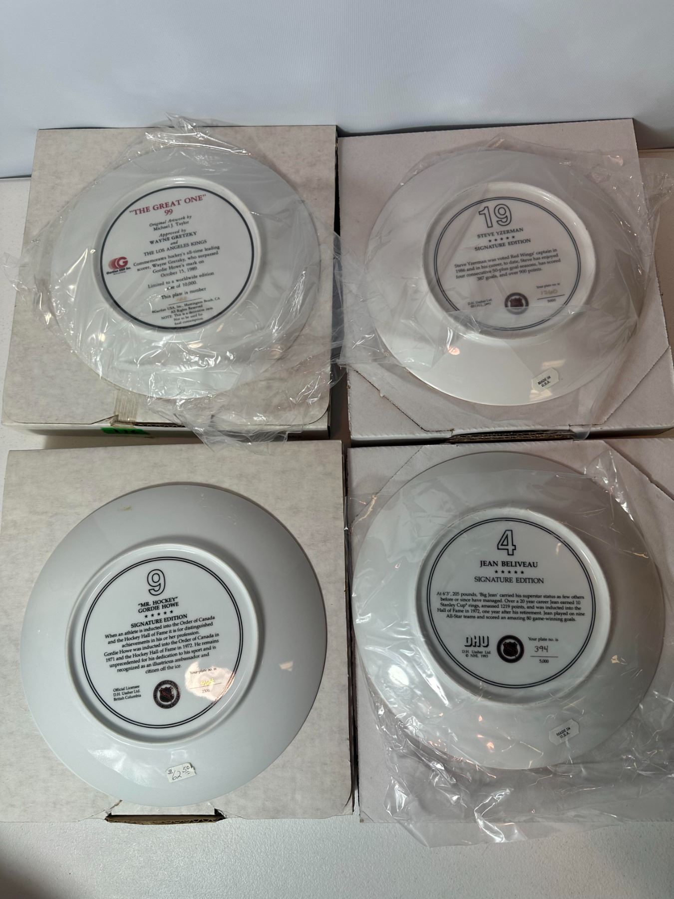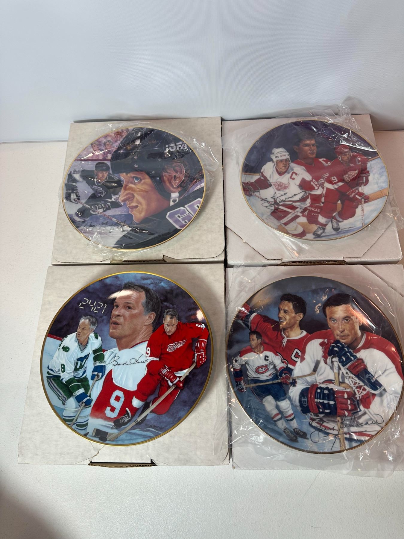 Set of 4 decorative hockey collector plates featuring legendary NHL players, including Detroit Red Wings icons. Each plate has detailed artwork with printed signatures and gold trim.