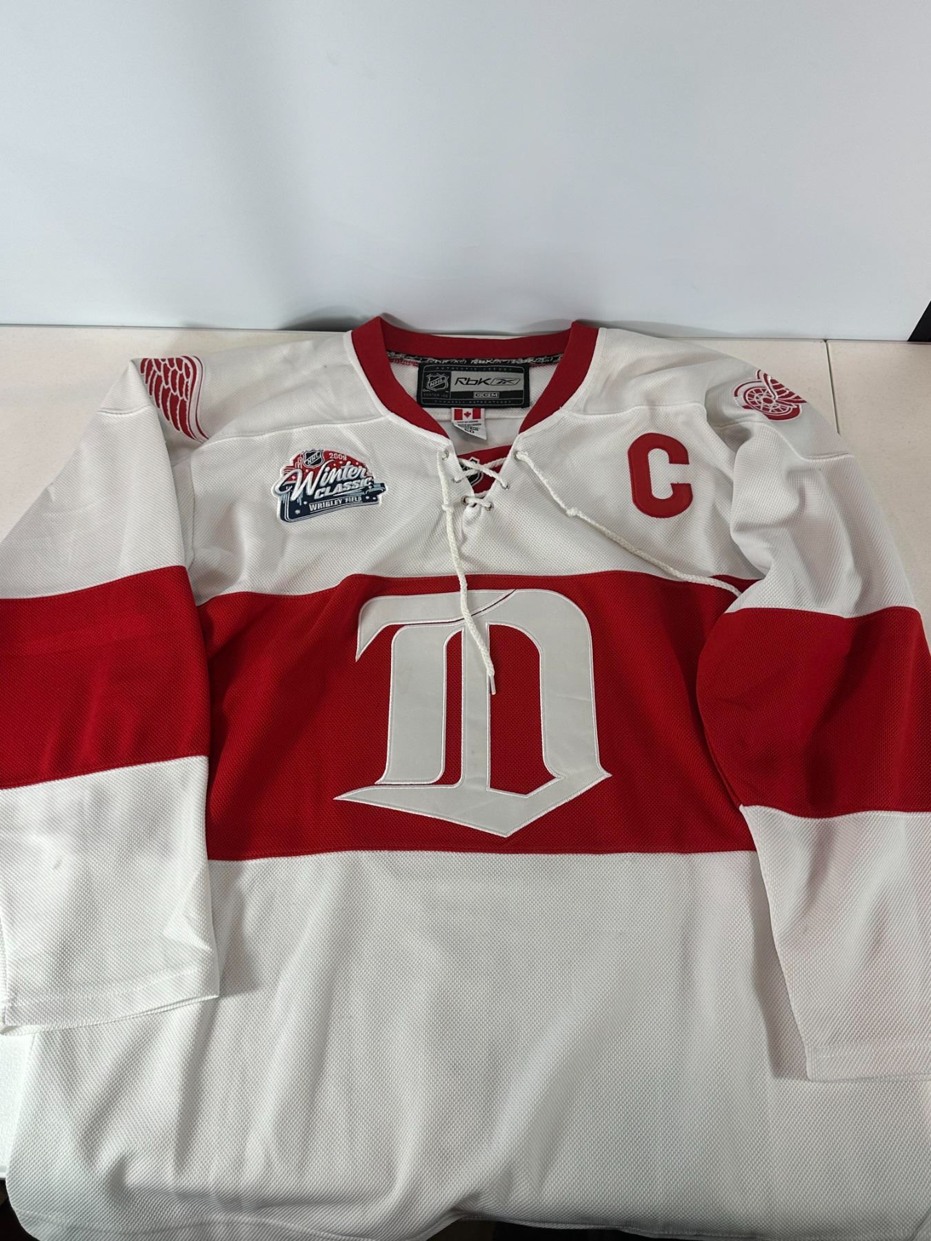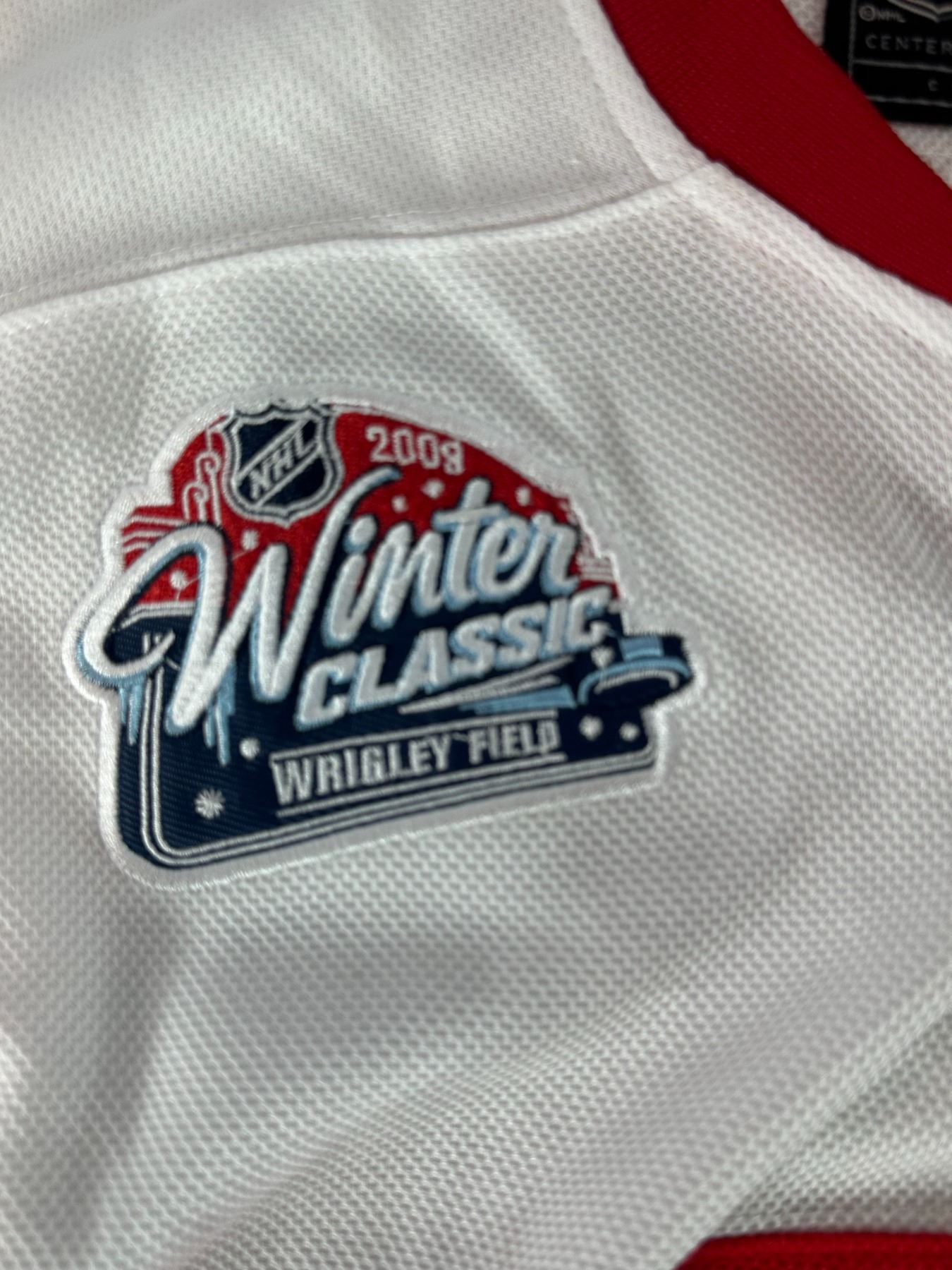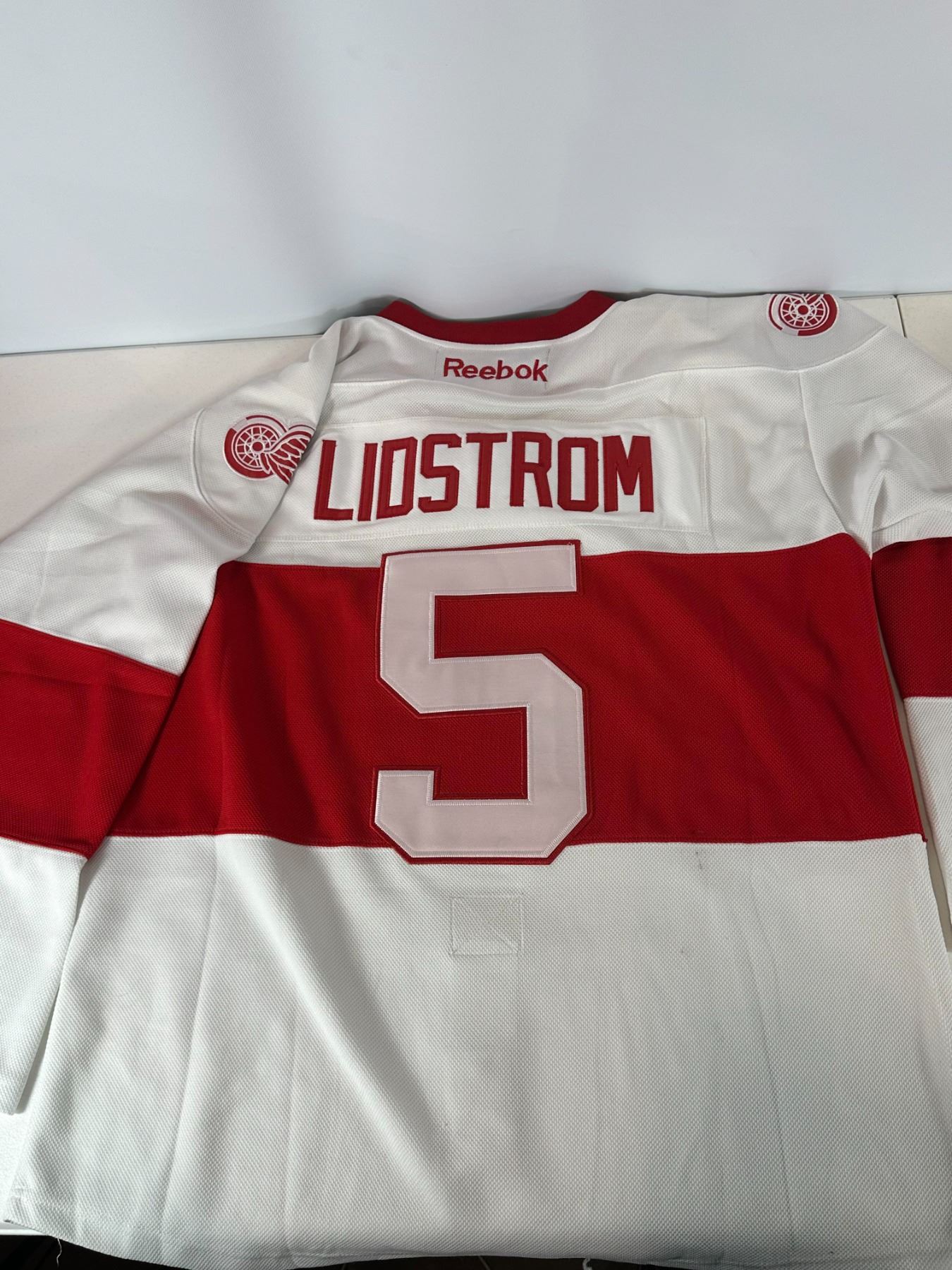 Detroit Red Wings Nicklas Lidstrom #5 jersey from the 2009 NHL Winter Classic. Features captain 'C' patch, Winter Classic shoulder patch, Reebok branding, and classic Detroit striping. Includes fight strap. Jersey appears in very good condition with minor signs of wear. Highly collectible piece from a historic outdoor NHL game.