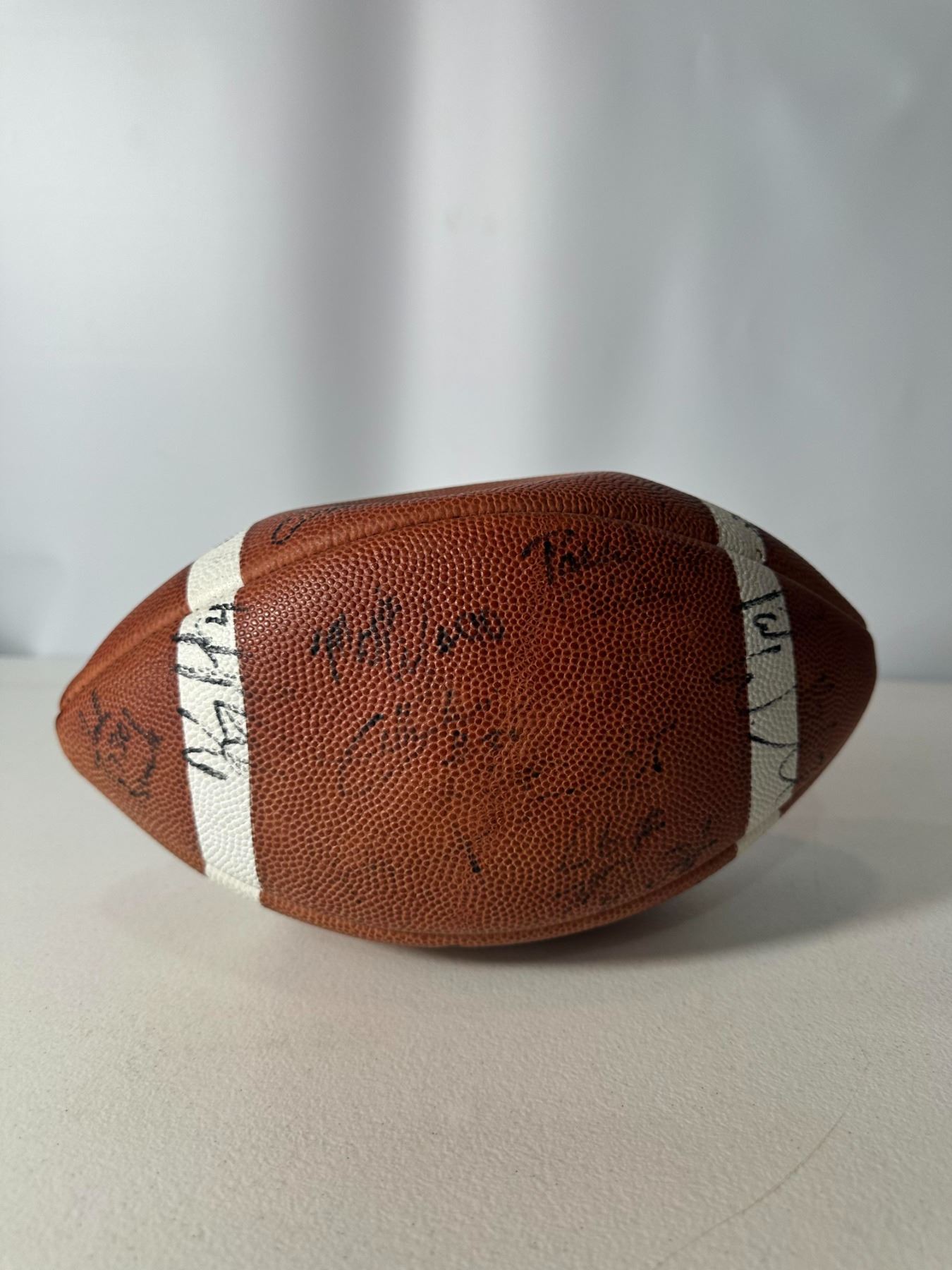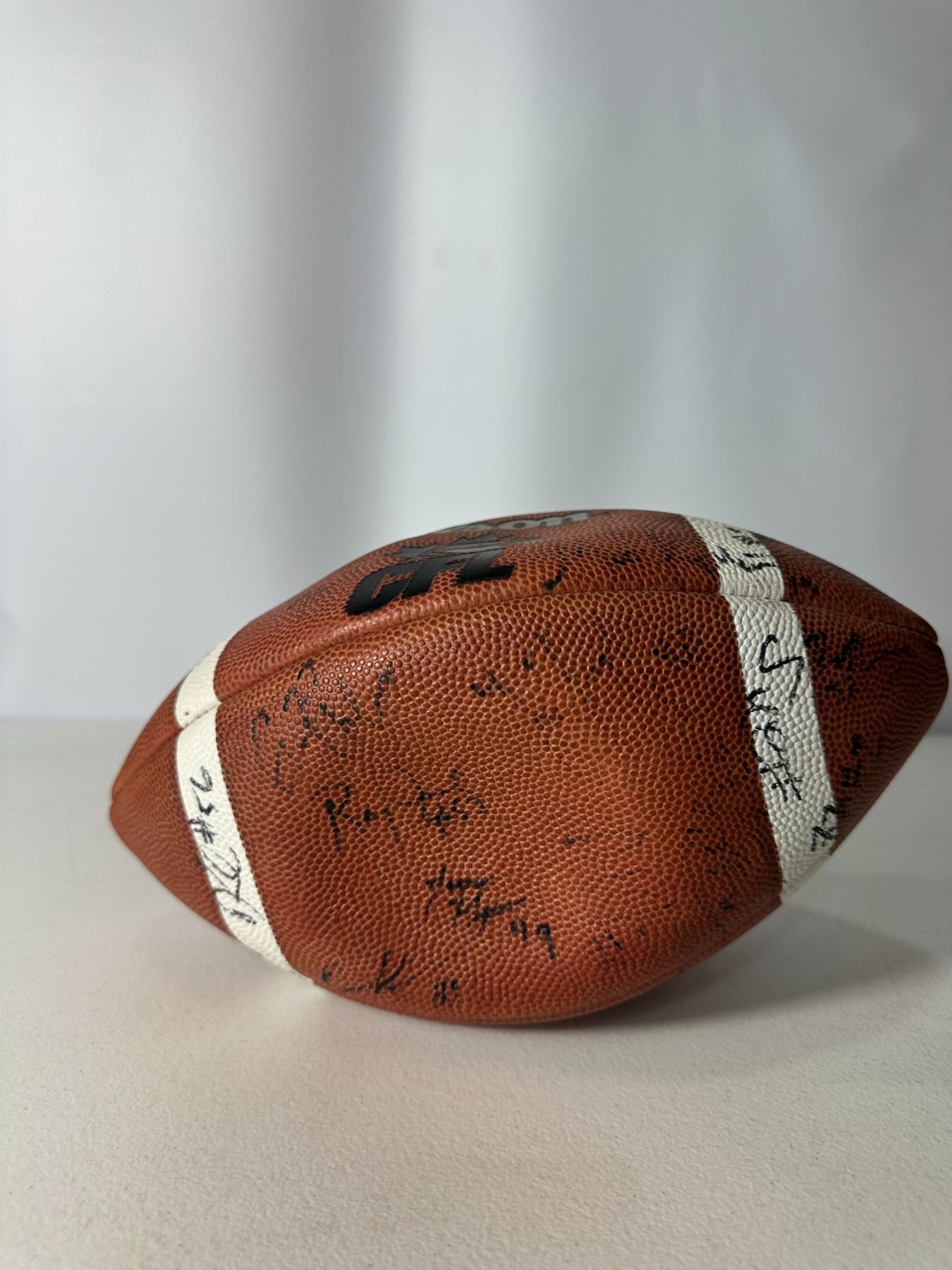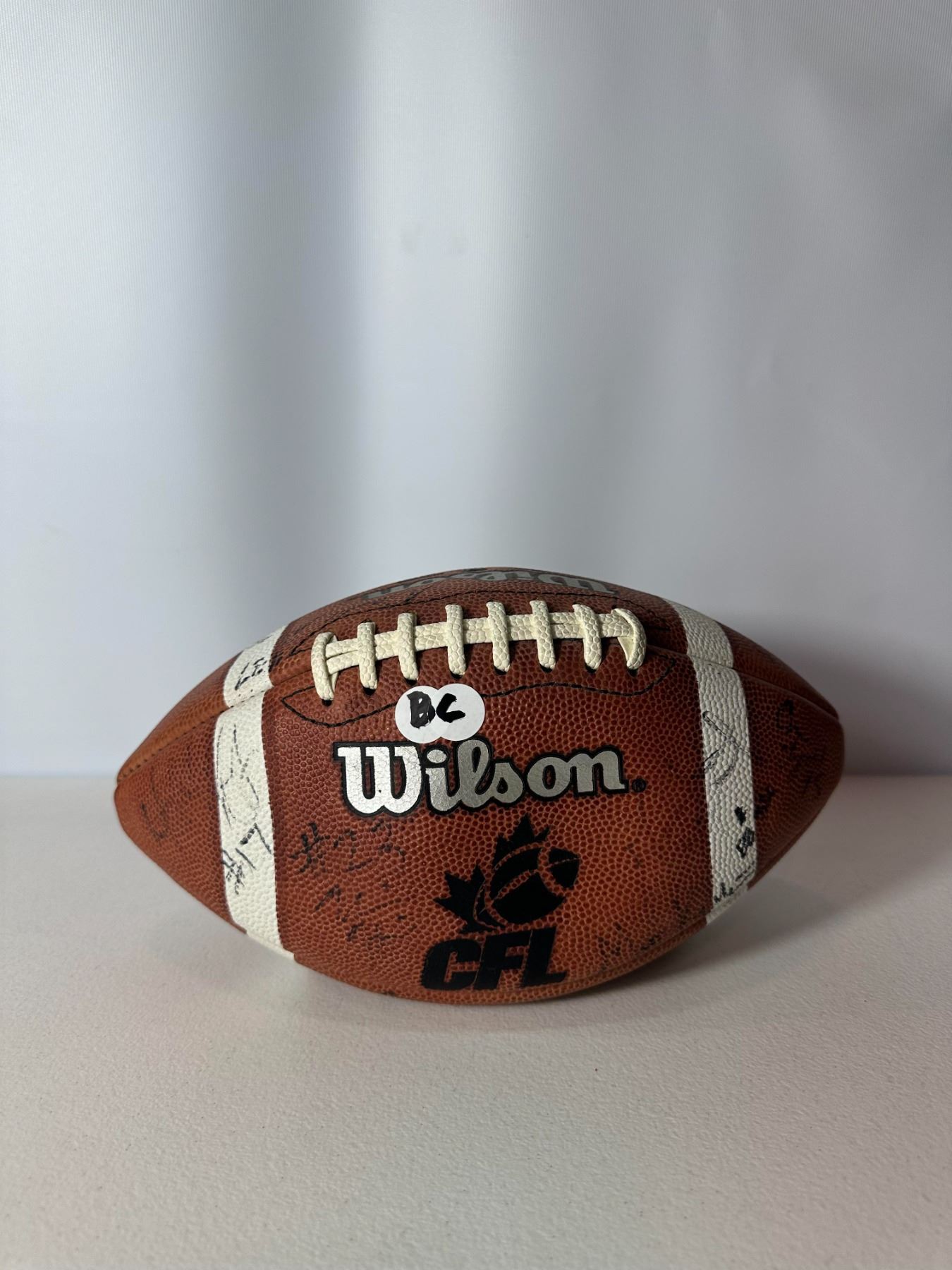Wilson CFL football featuring multiple player autographs from the B.C. Lions, circa late 1990s. Brown leather ball with white laces and CFL branding. Signatures appear throughout the surface. Displays well and makes a great collectible for Canadian football fans.