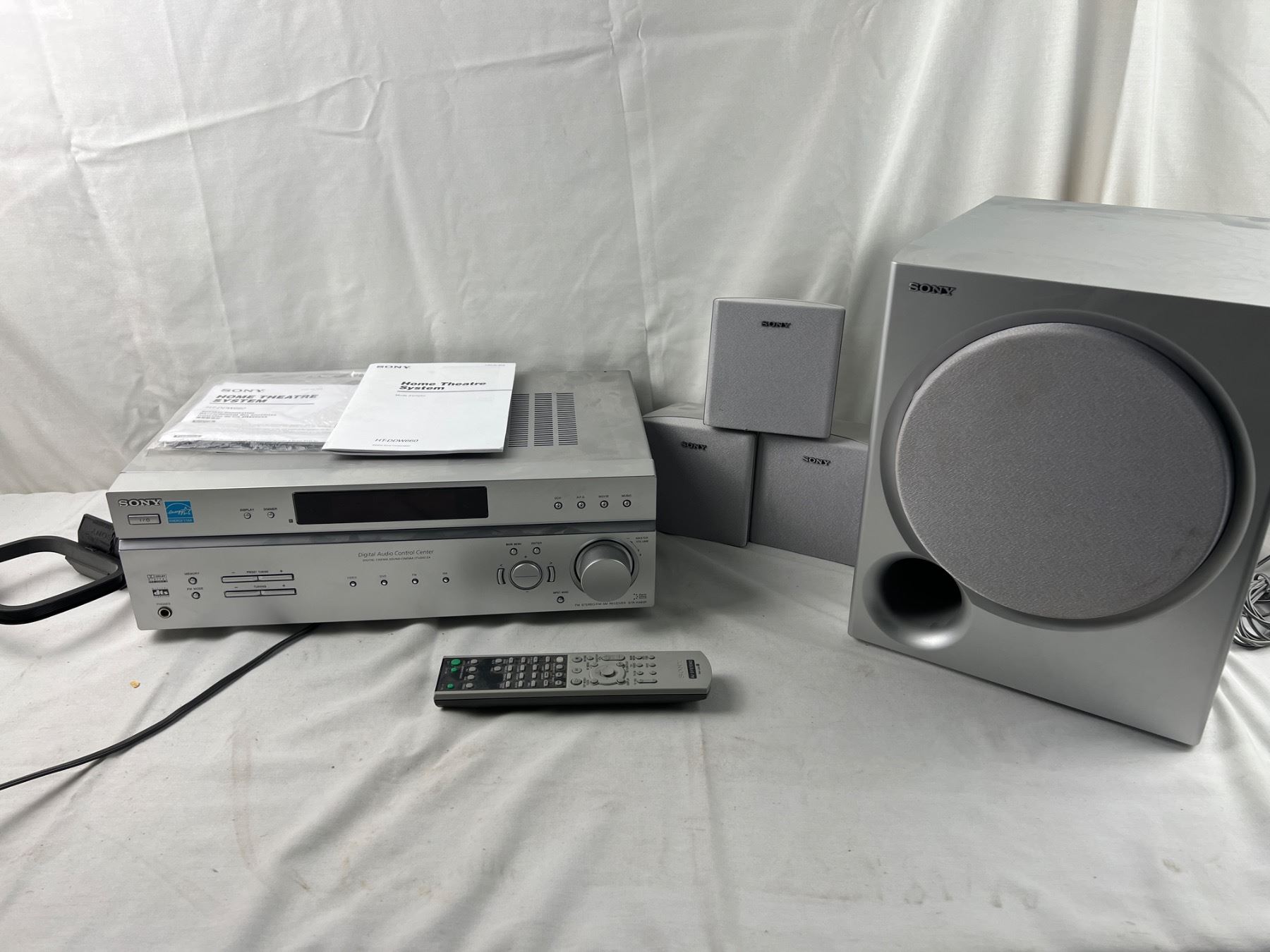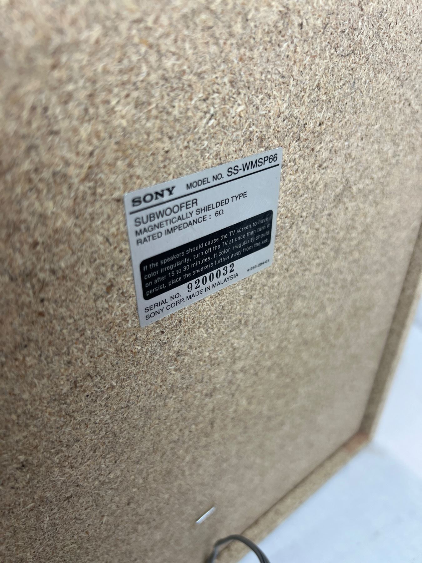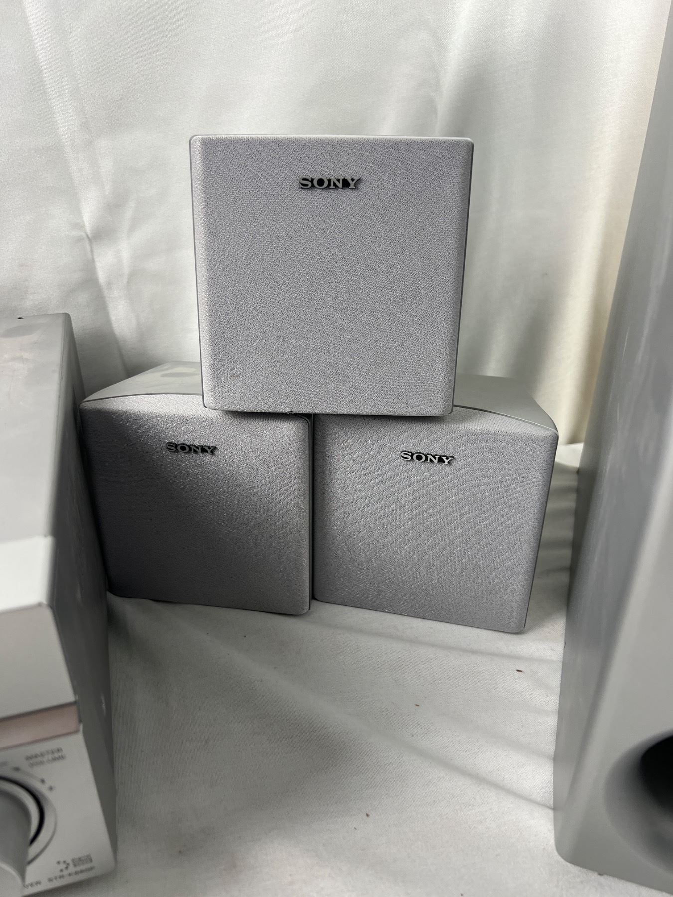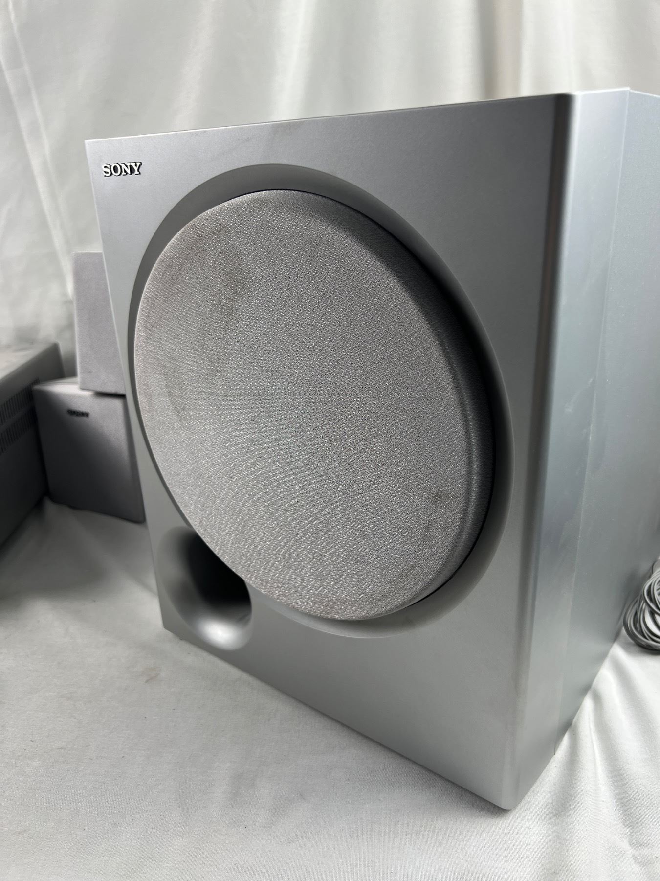 Includes three speakers, one subwoofer (13"L x 11"W x 13"H), receiver (powers on), and one remote