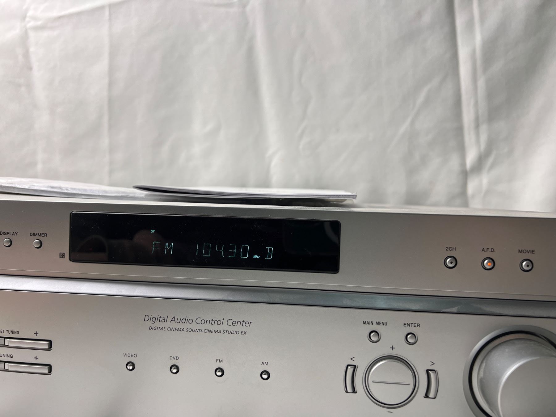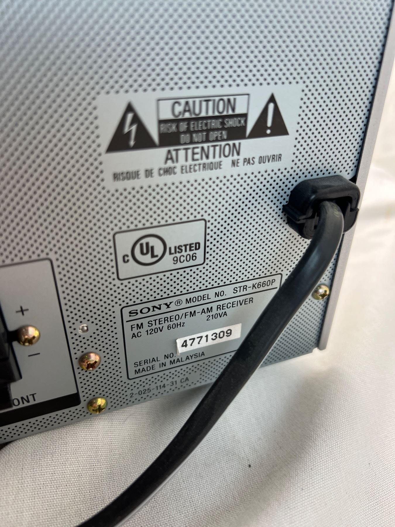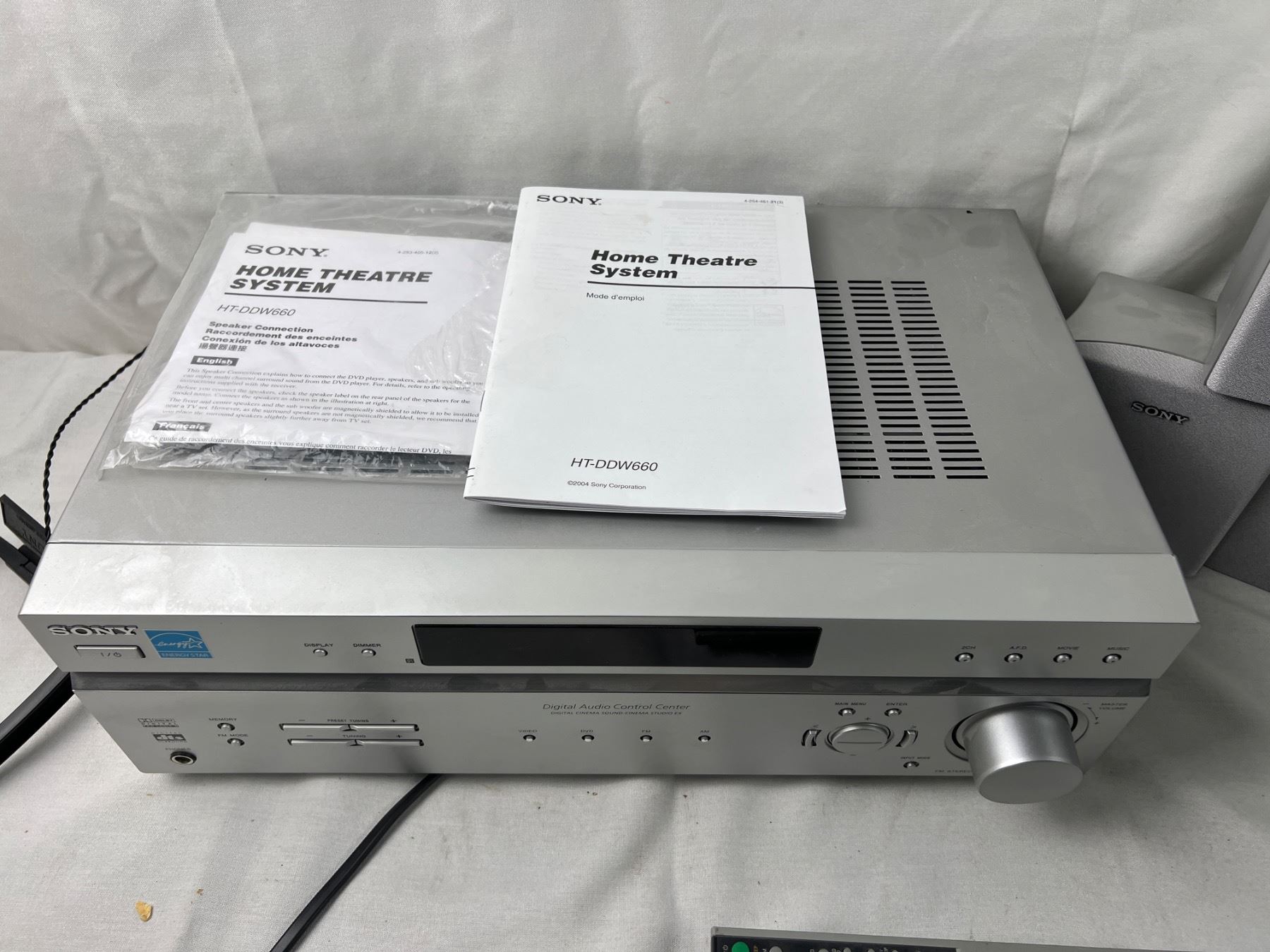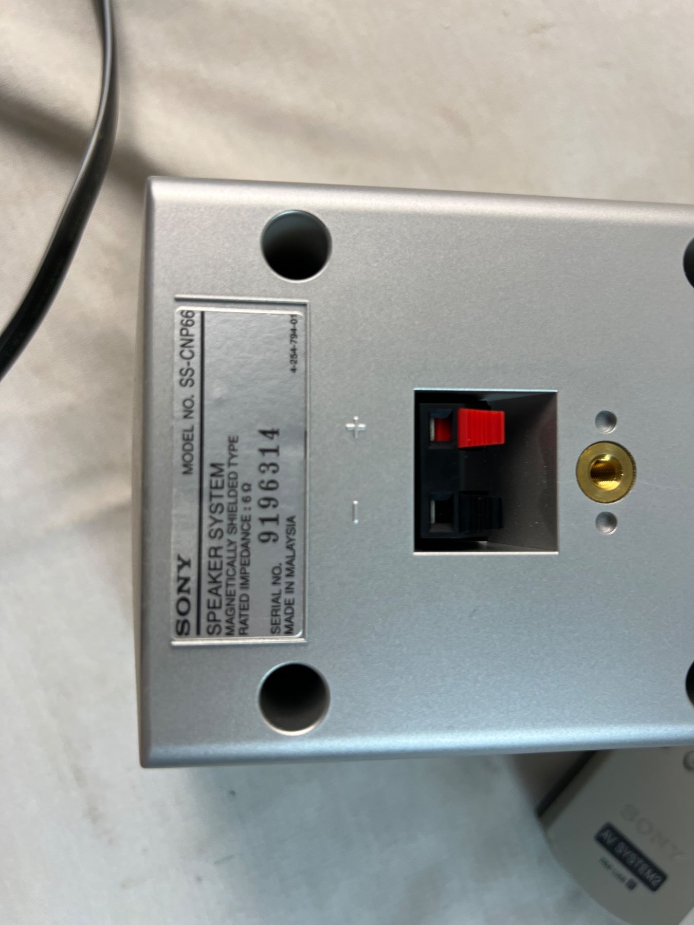 Includes three speakers, one subwoofer (13"L x 11"W x 13"H), receiver (powers on), and one remote
