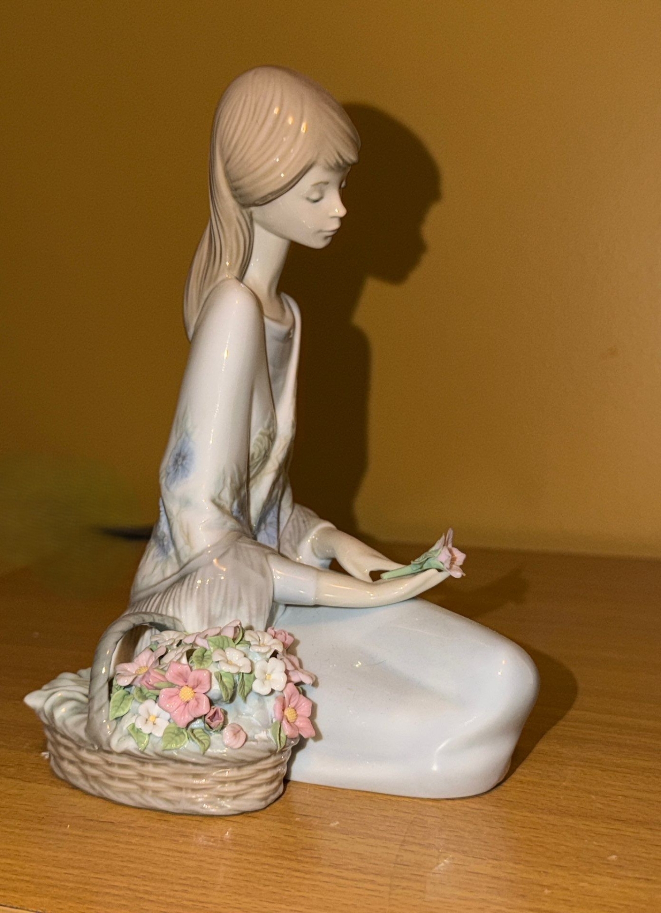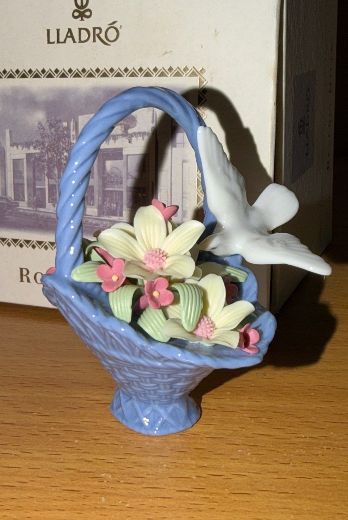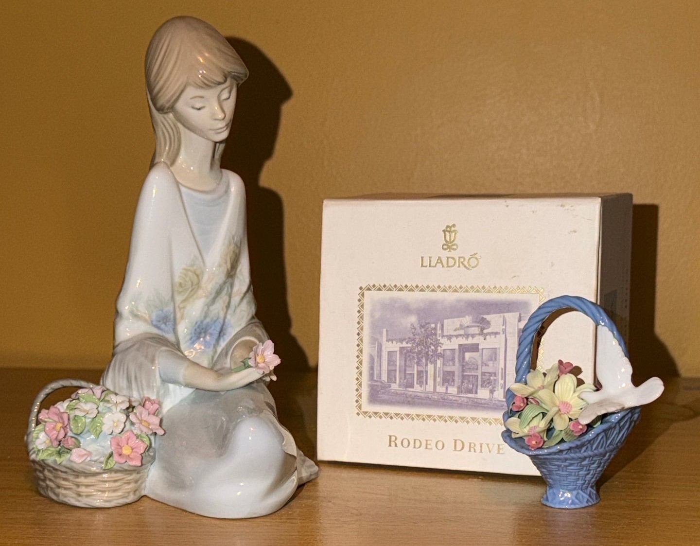 Lot 147 Lladro Figurines: Female w/ Flowers 4 W, 5 D, 7.5 T, Mini Flower Basket w/ Bird 3 T