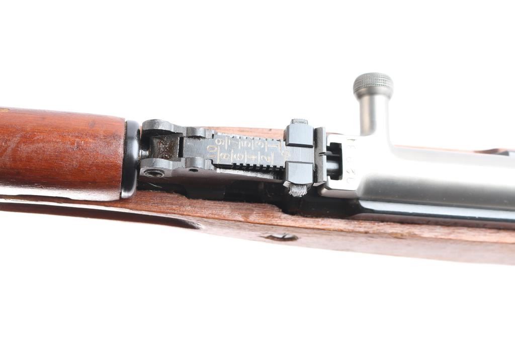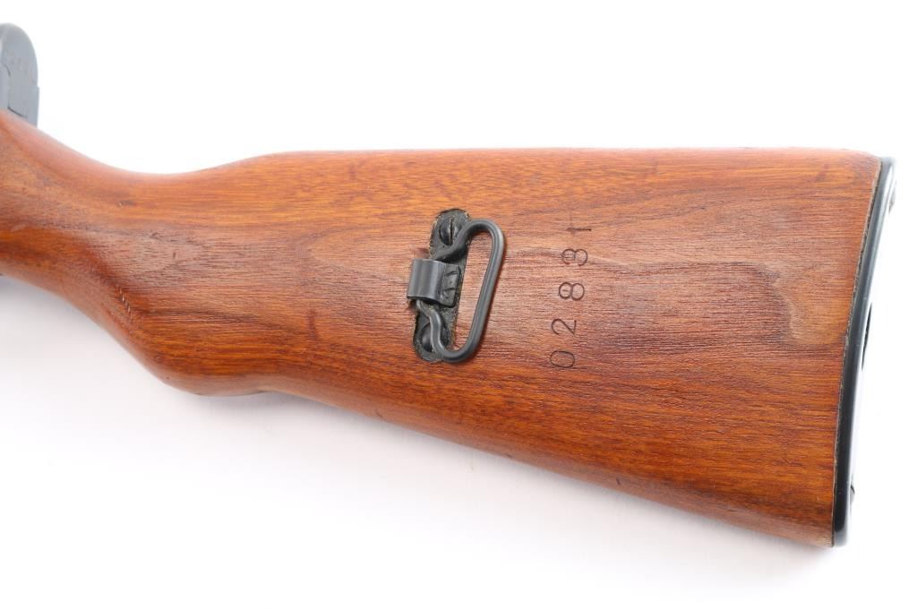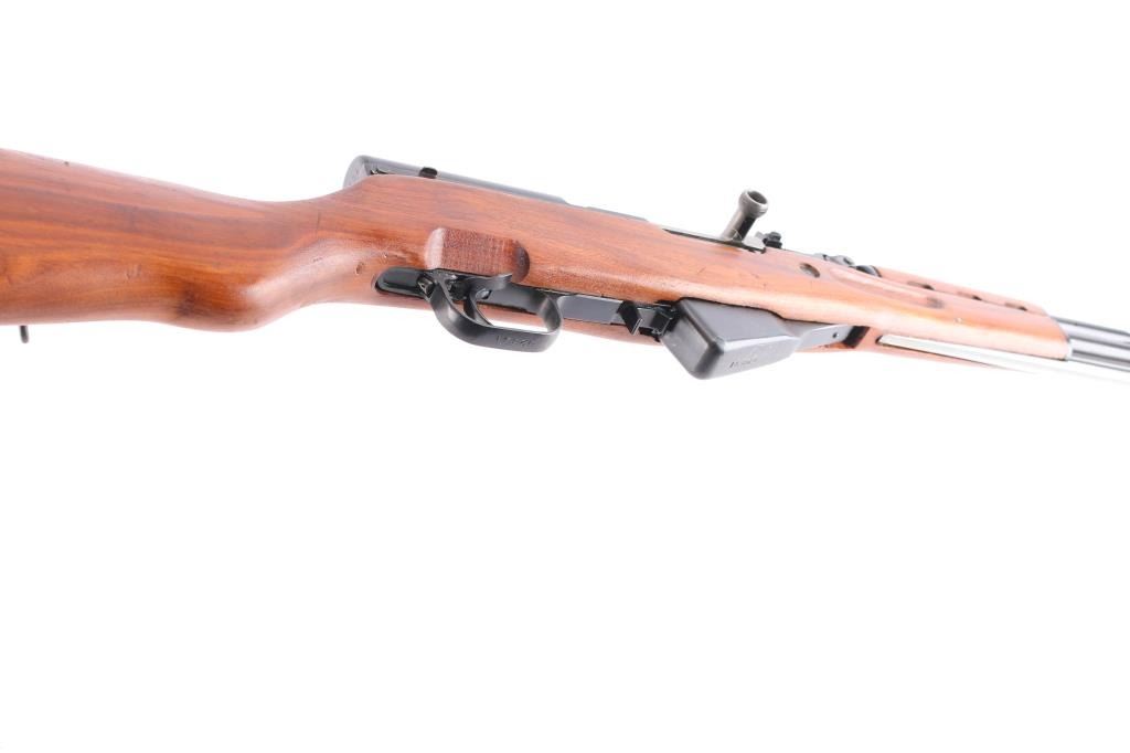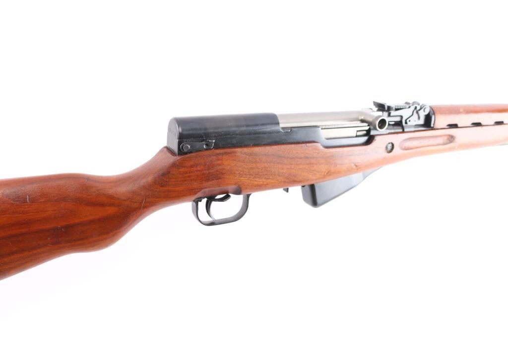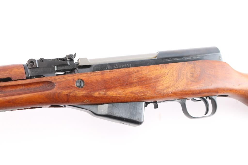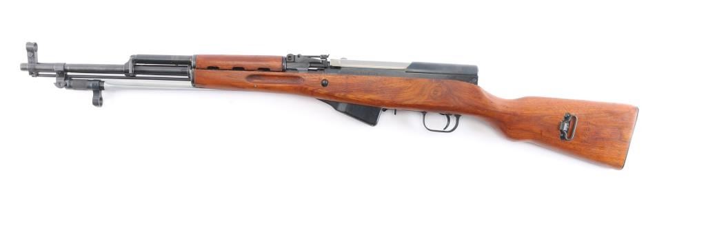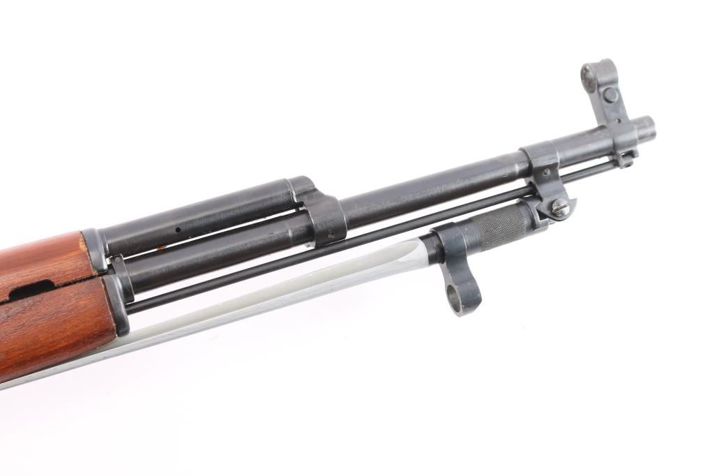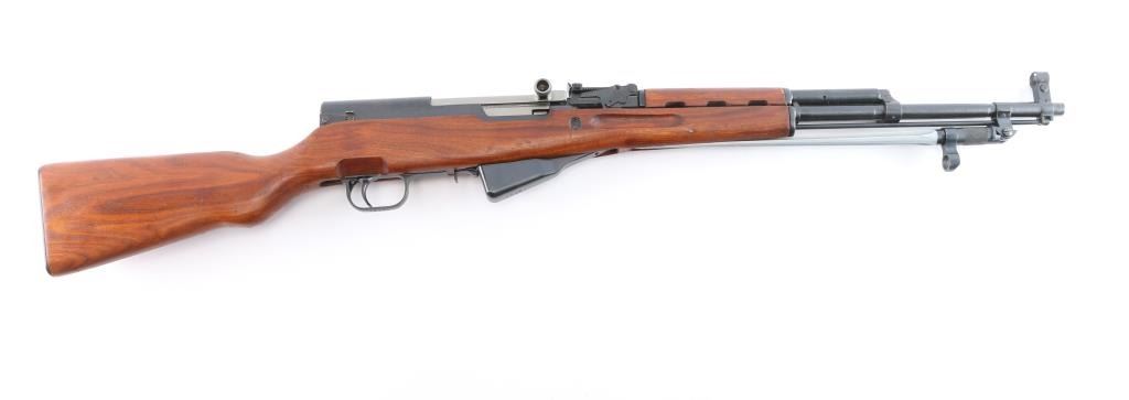 Chinese short stroke semi-automatic rifle chambered in 7.62x39mm, imported by B-West from Tucson, AZ. Importer stamped "7.62x39 SPORTER MADE IN CHINA BY NORINCO" on the left receiver rail. It features an approximately 20.5" barrel, folding spike bayonet, cleaning rod under barrel, protected post front sight, tangent rear sight graduated to 1000 meters, fixed 10 round magazine, smooth curved trigger, stamped triggerguard, manual safety, and sling swivels. The wood stock has almost a straight grip with a finger grooved forend, ventilated handguard, and trapdoor metal buttplate. Matching serial numbers on receiver, magazine floorplate, triggerguard, bolt carrier, and the stock. Cleaning gear in buttstock. The bore is bright with strong rifling. The metal retains approximately 98% of its bluing with nearly no edge wear, some uneven bluing on the receiver cover, and very minor scratches. Stock is in very good condition with few dents & scratches from storage.
