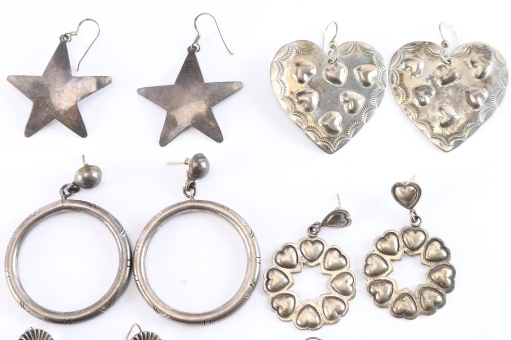 Pair of heart shaped sterling earrings, 17 grams; pair of hoops, 22 grams; pair of ornate sterling earrings, marked FL, 30 grams; pair of sterling stars; pair of round heart shaped earrings, 17 grams; pair of posted sterling hoops, 22 grams.