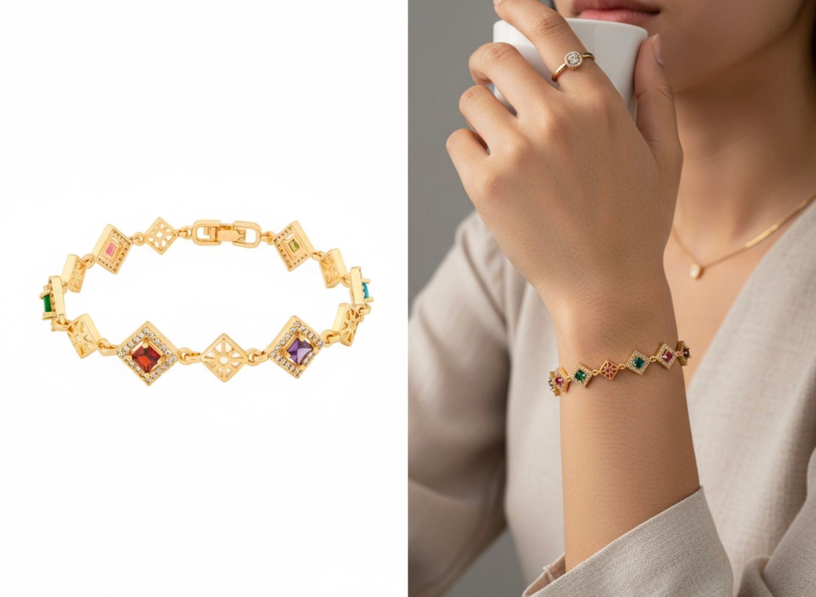 18kt Oro LaminadoBracelet ,6 Square Cut Colour Stones w/ Halos (20cm) Ð 1452