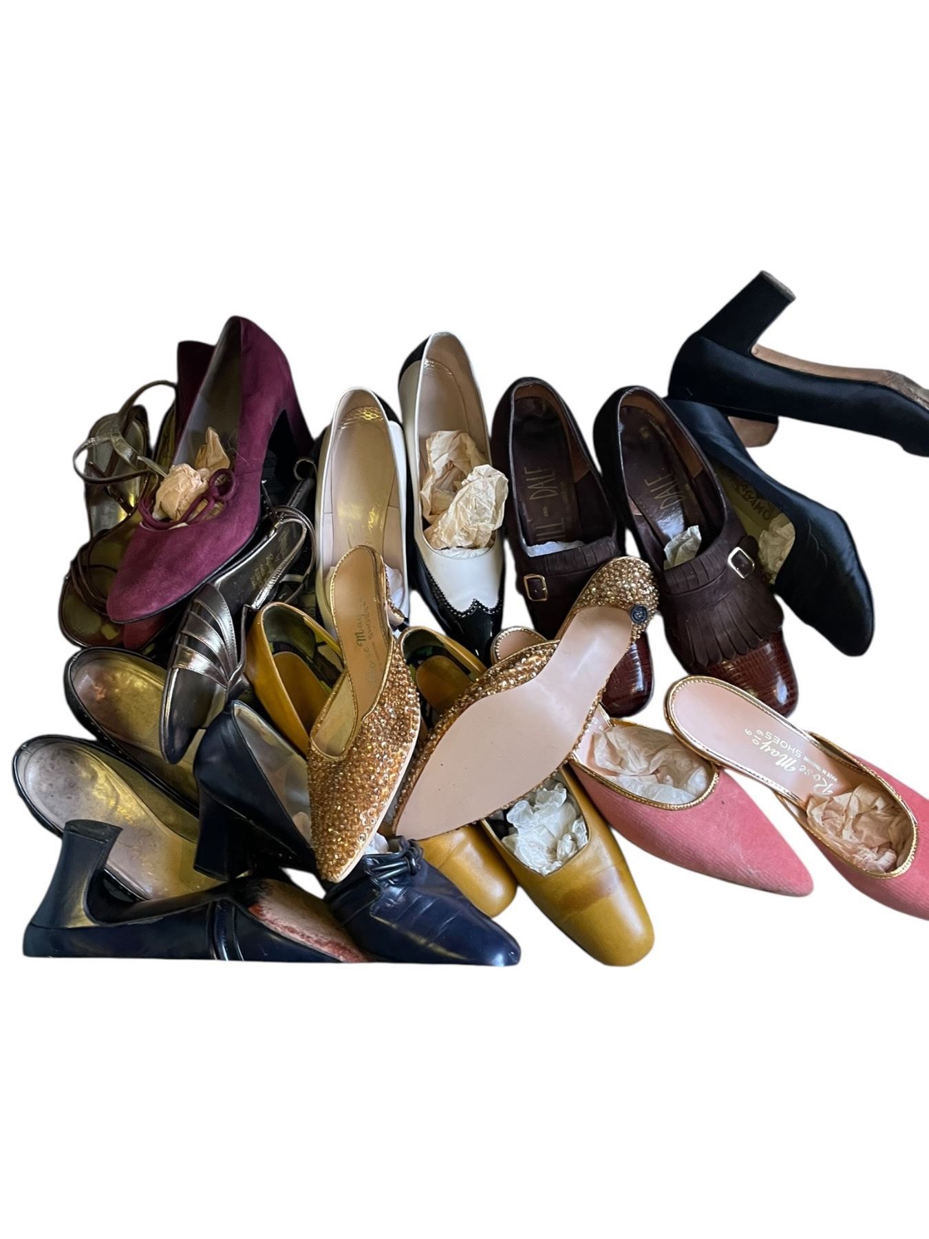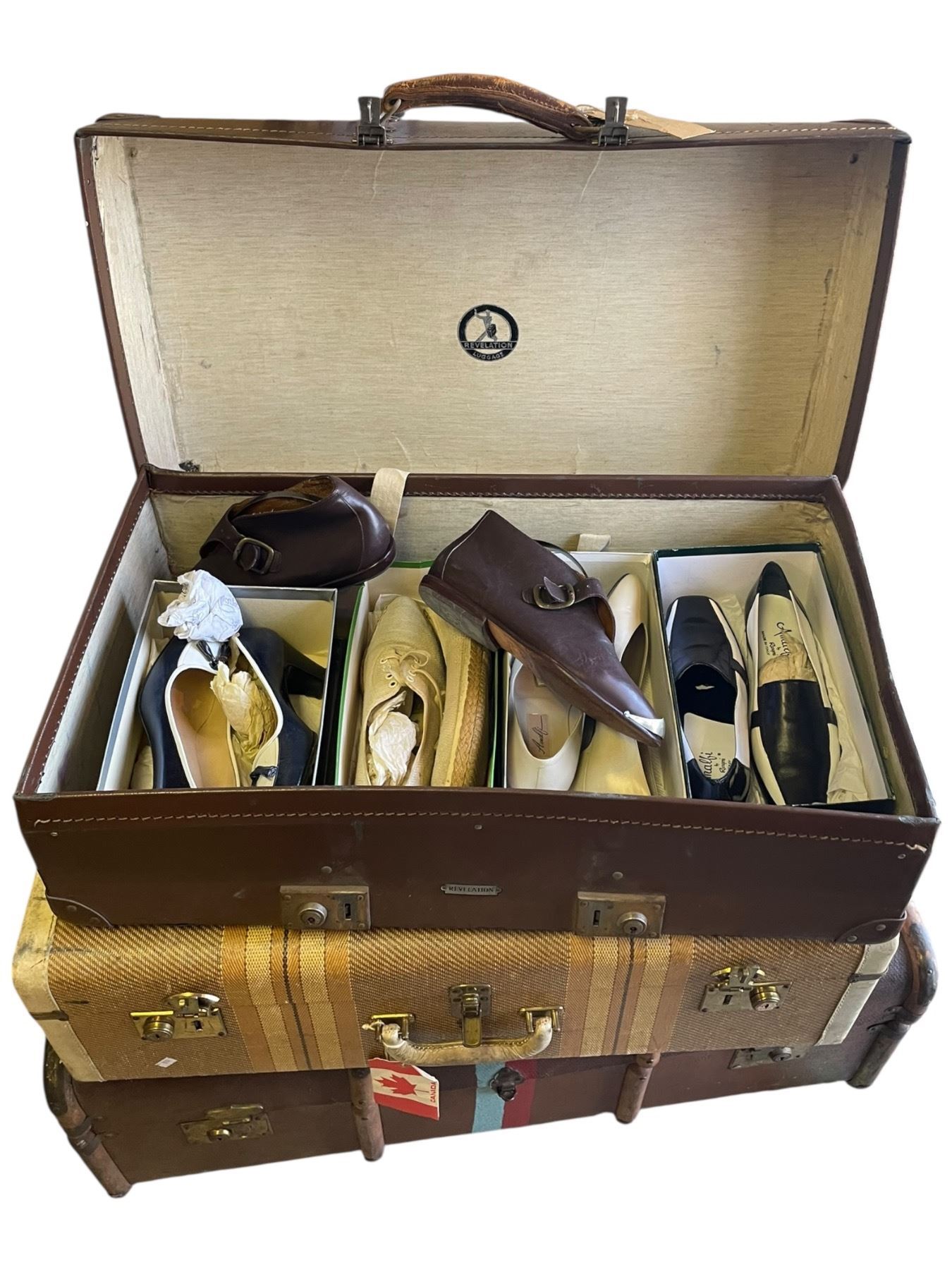 Large Quantity of Assorted Women's Shoes in 3 Large Vintage Suitcases and 1 Box