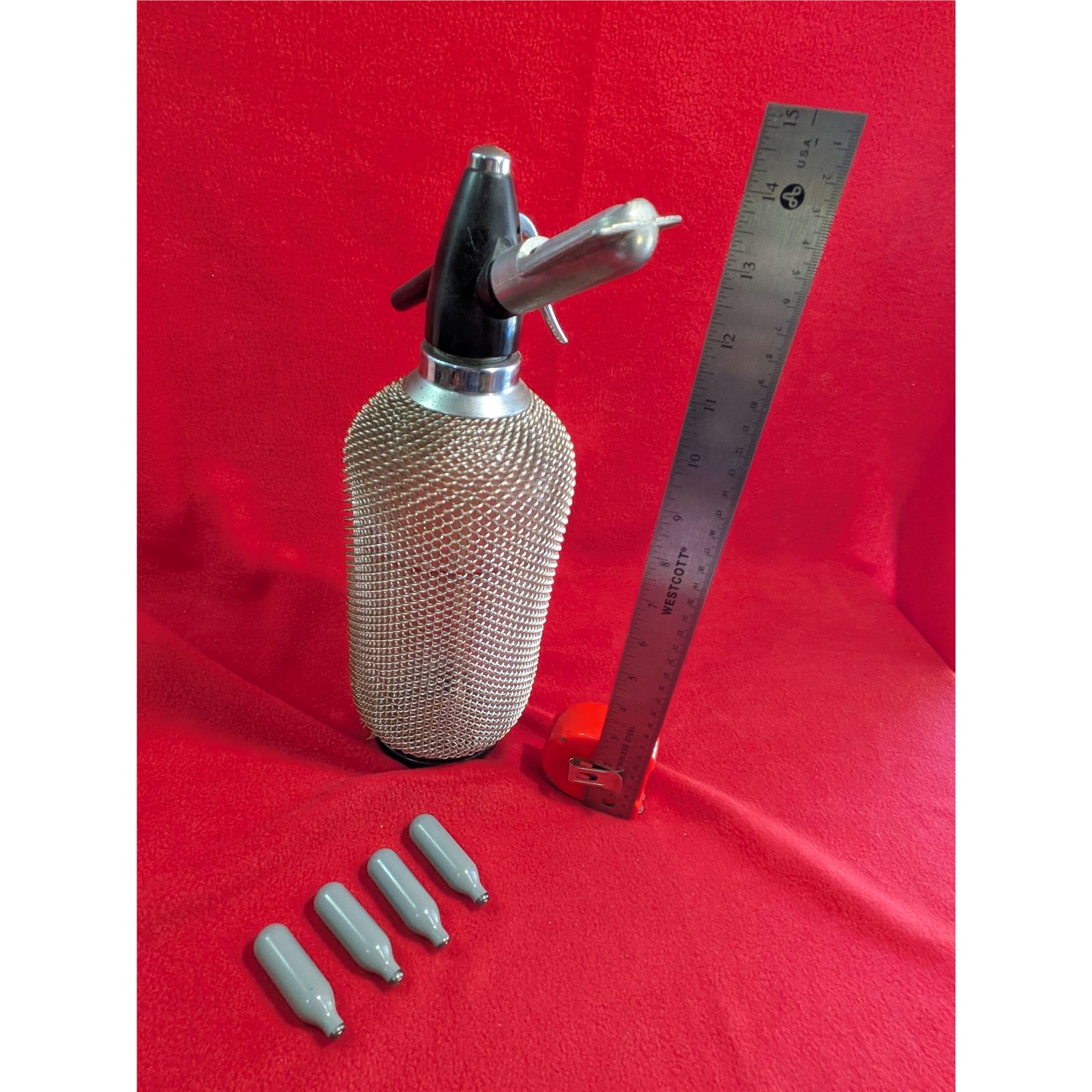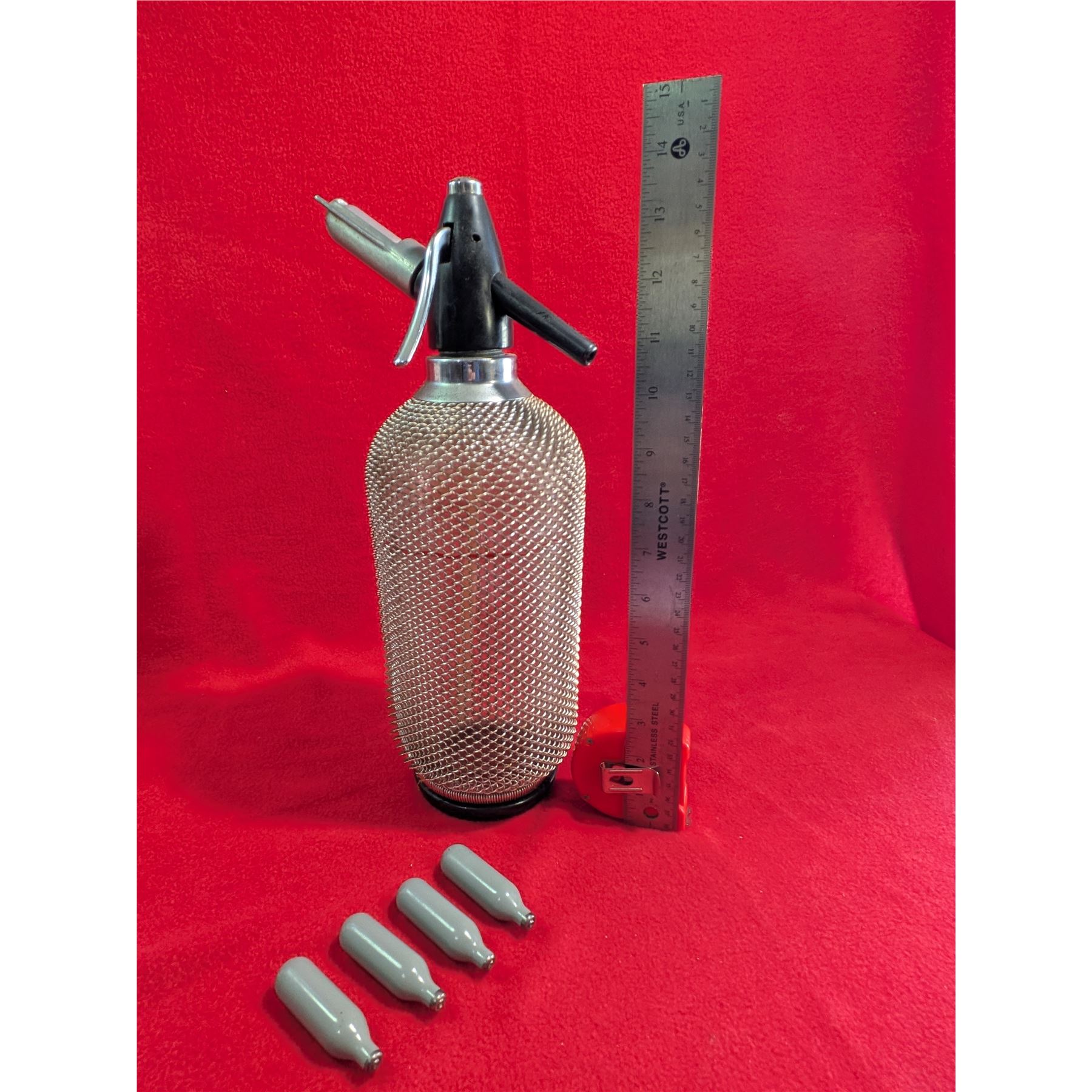 Vintage soda siphon (also known as a seltzer bottle) featuring a glass bottle encased in a protective metal wire mesh.
