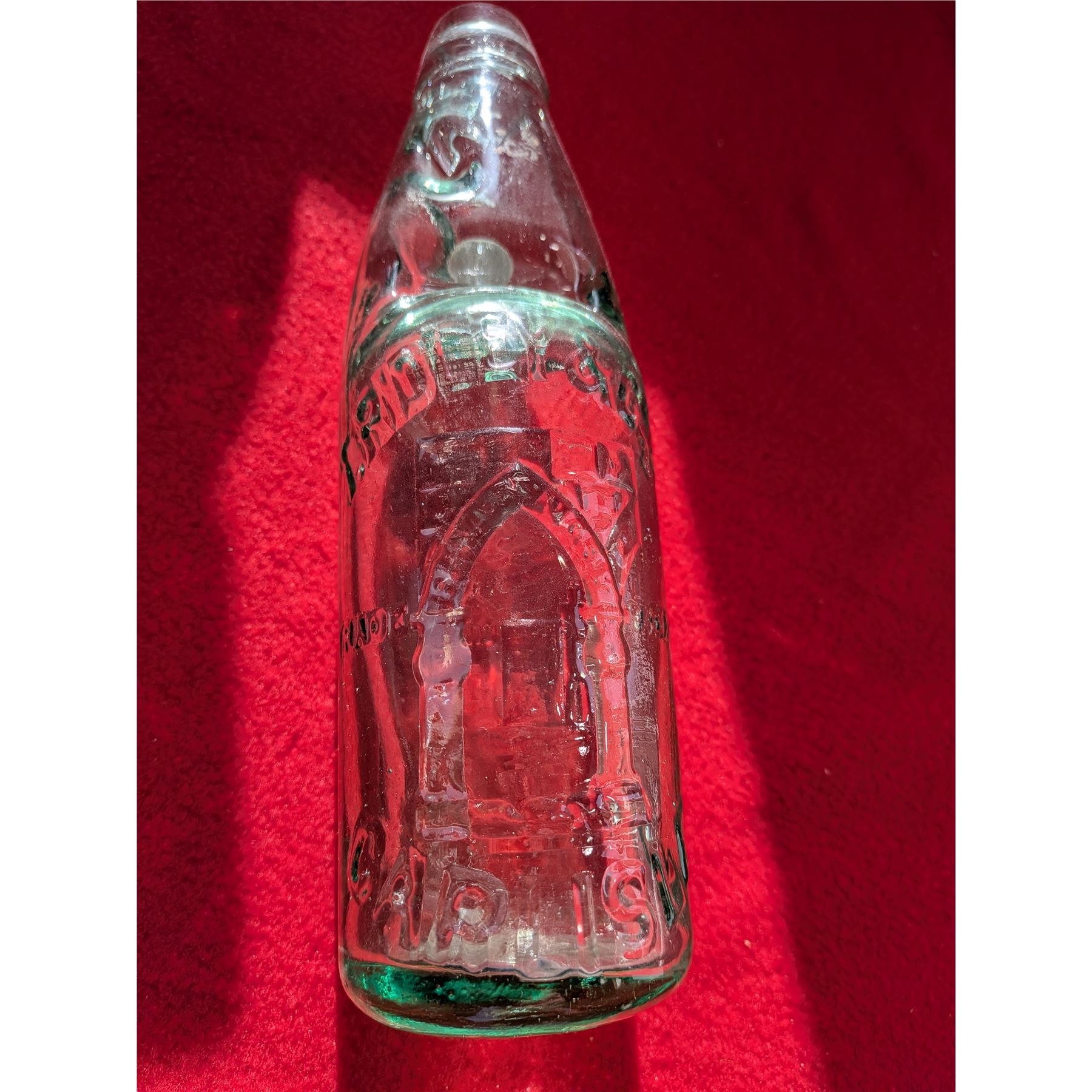 Antique Codd-neck bottle, a soda bottle patented in 1872 by Hiram Codd. Licensed to TRIDLEY & CO LTD. Trade Mark CARISLE