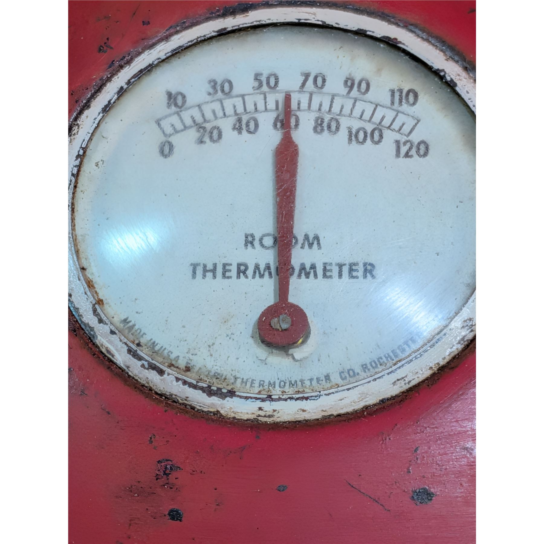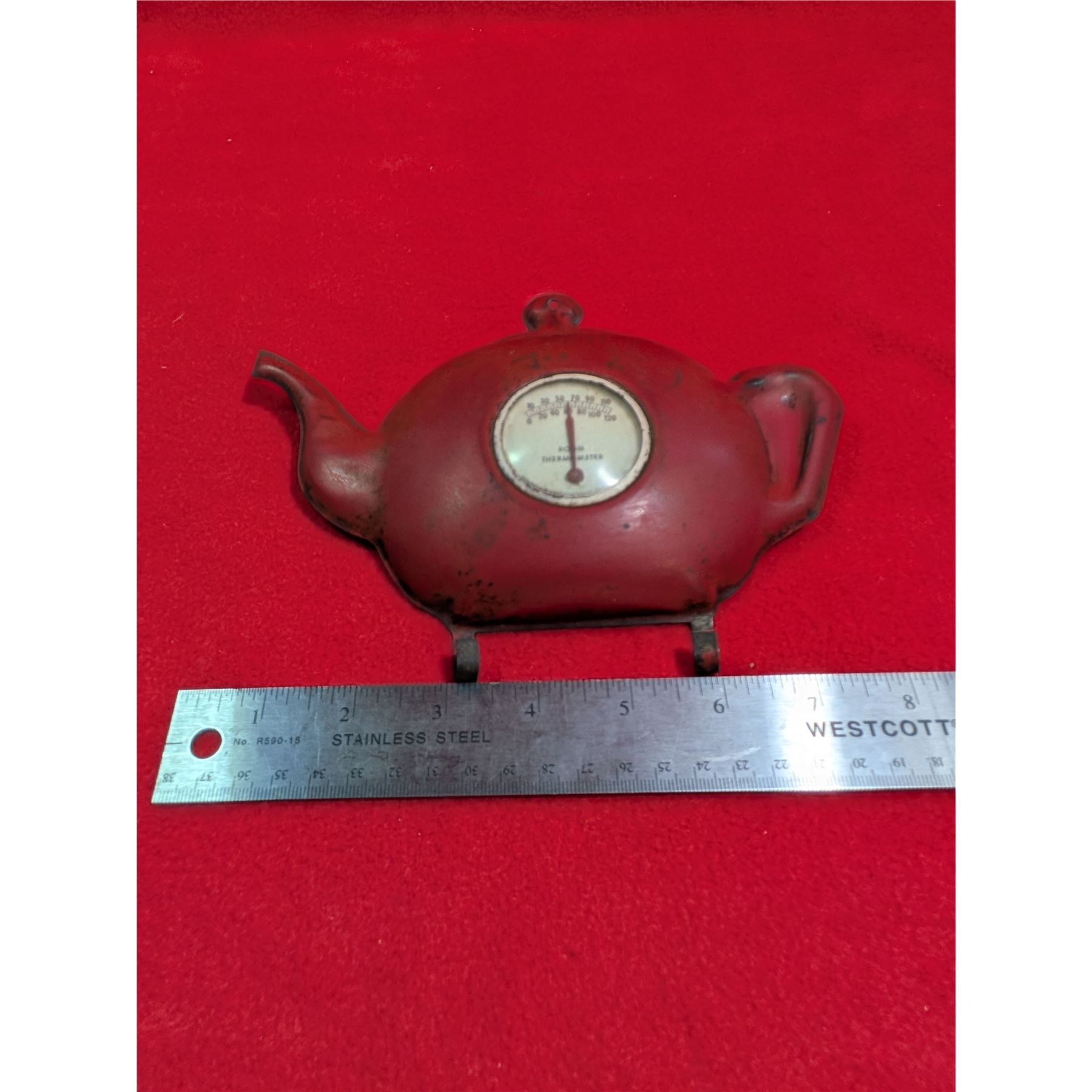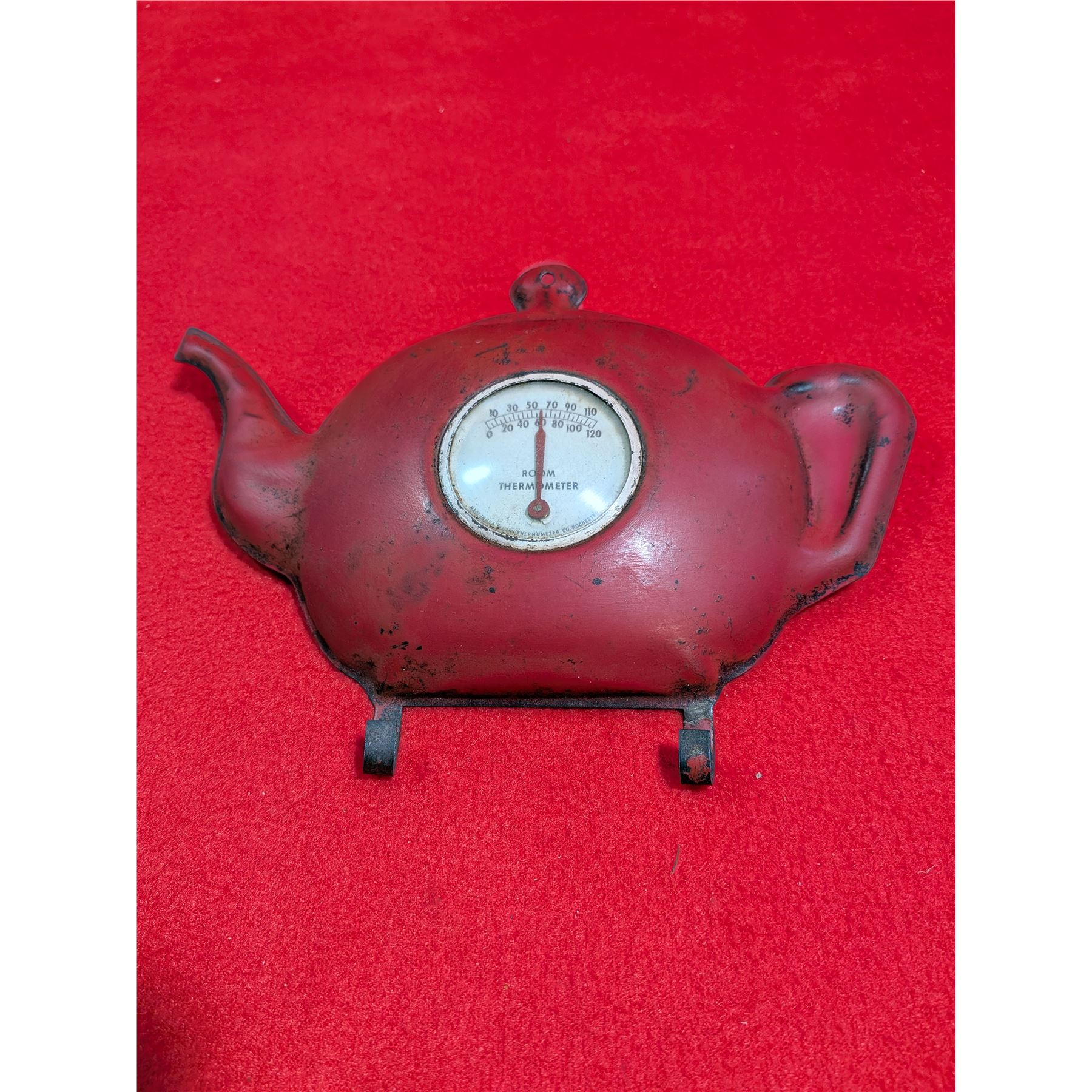 Vintage Tel-Tru room thermometer designed to look like a red teapot.