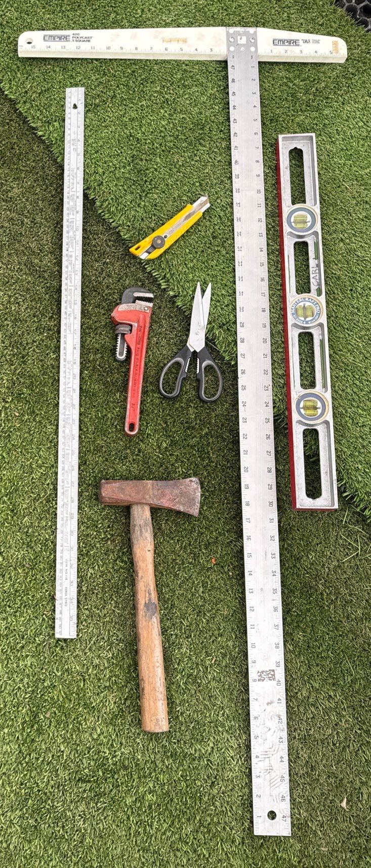 Lot 115 Collection Of Hand Tools & Construction Measuring Devices - Pipe Wrench Mini Sledge & more