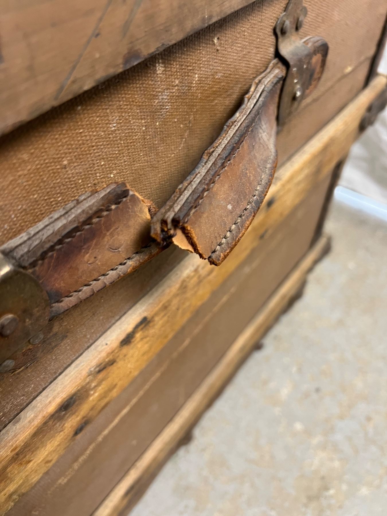 One of the leather handles is torn, has wear and tear, no key, 25"H x 36"L x 23"W