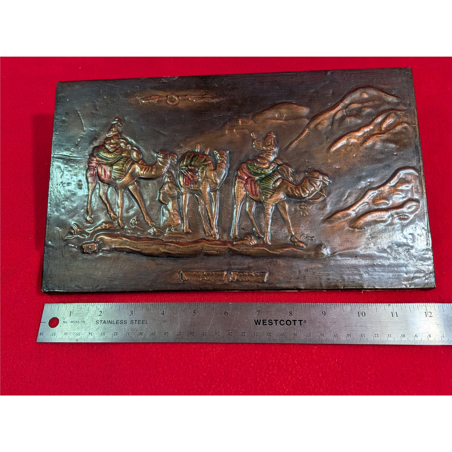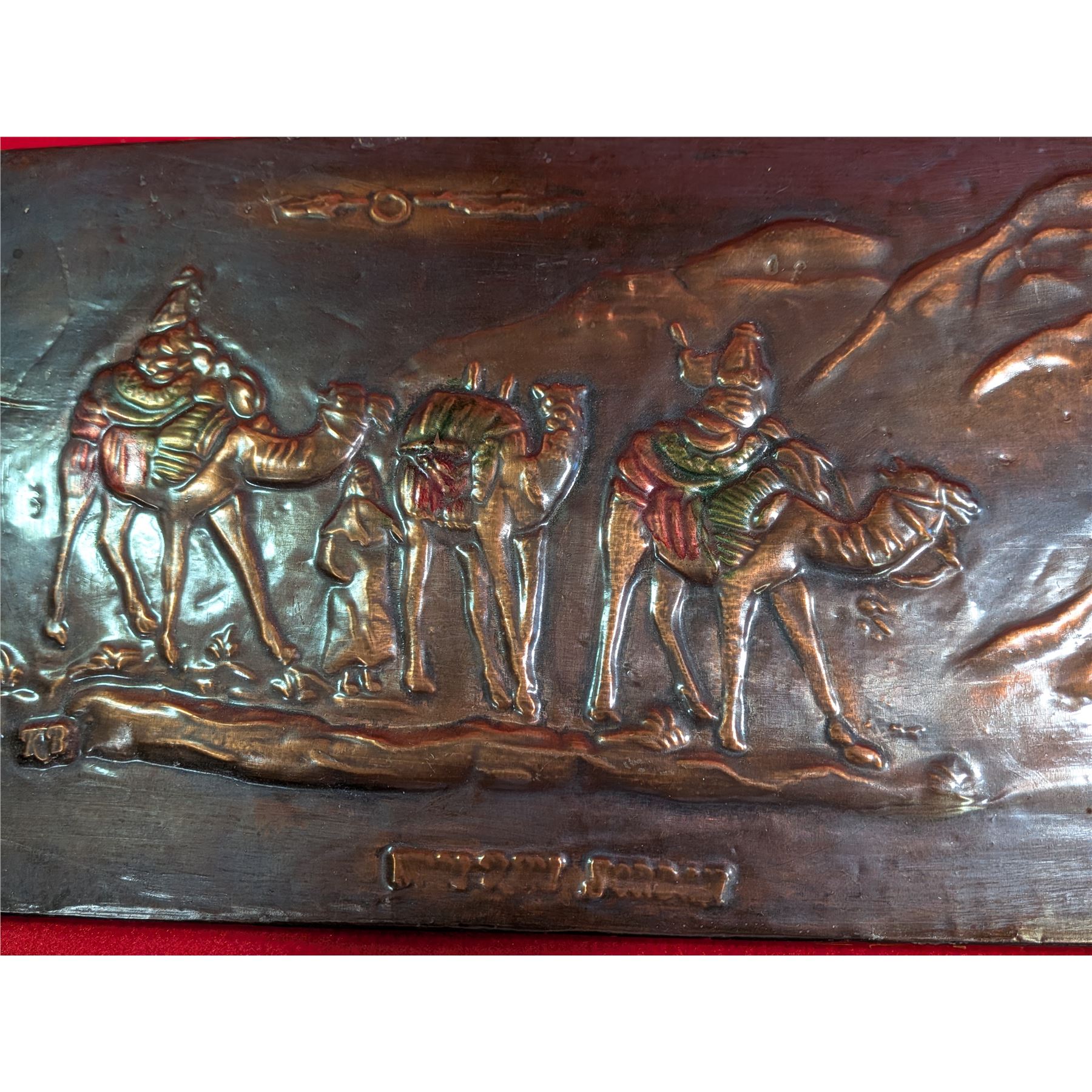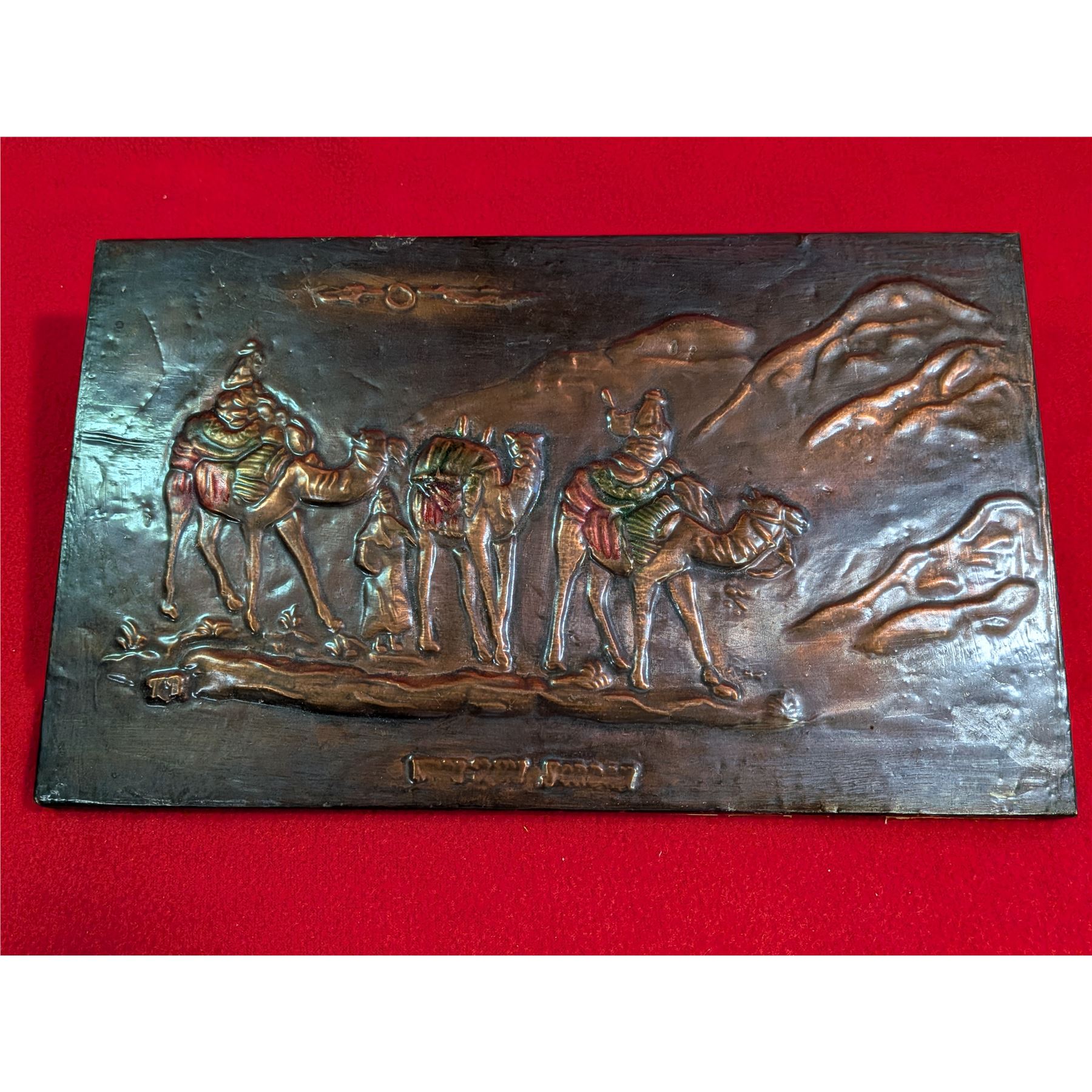 Vintage copper or brass relief plaque depicting a desert caravan scene, commonly known as "Orientalist" art.
