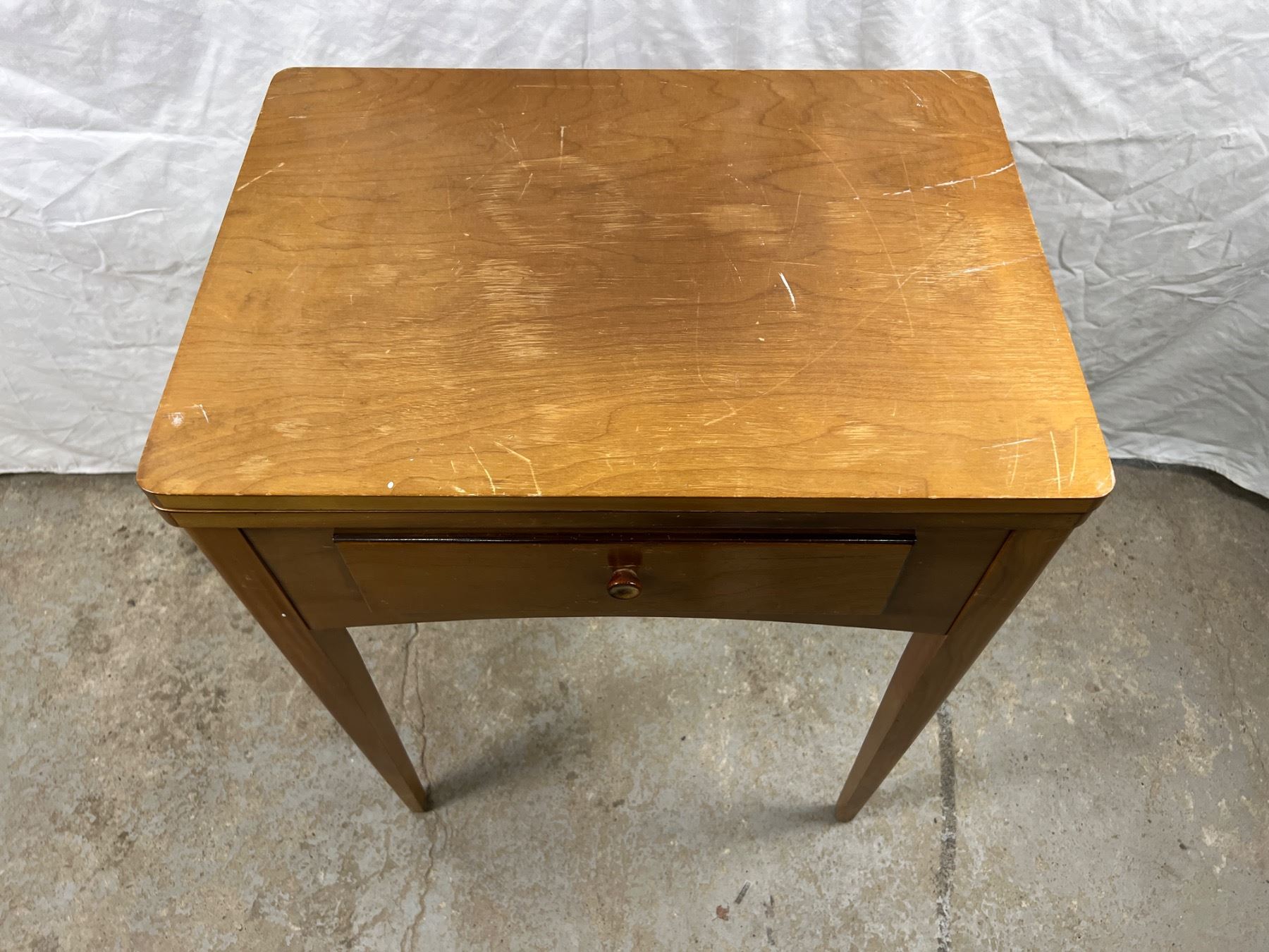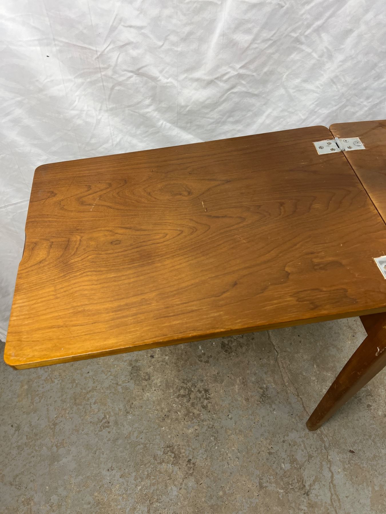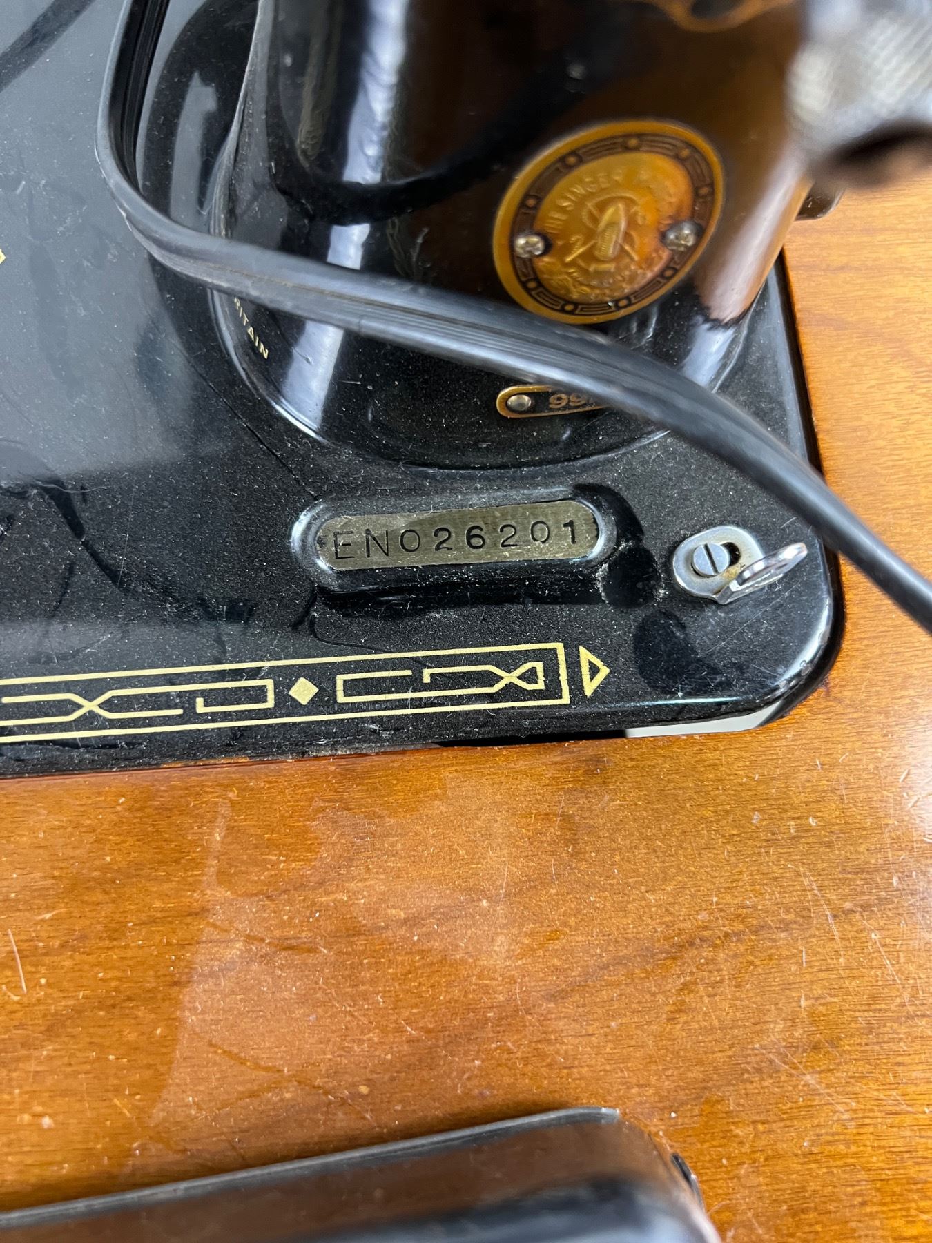 The sewing machine has power but the light does not turn on, Model No. EN026201, Table has scratches and wear, Fully opened it measures 46.5"L x 16.5"W x 30.5"H, closes it measures 23.5"L x 16.5"W x 30.5"H