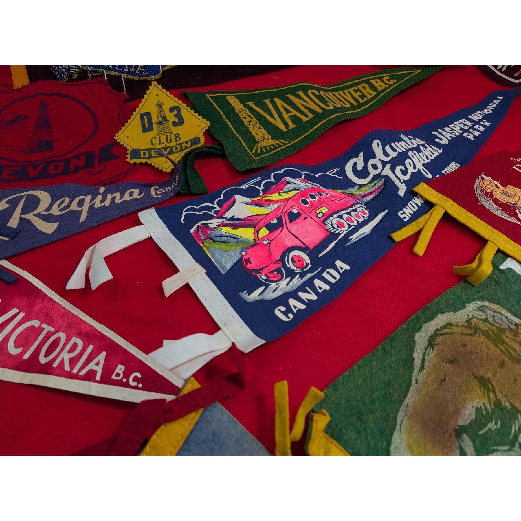 Vintage Canadian felt souvenir pennant flags from the 1960s-1970s.