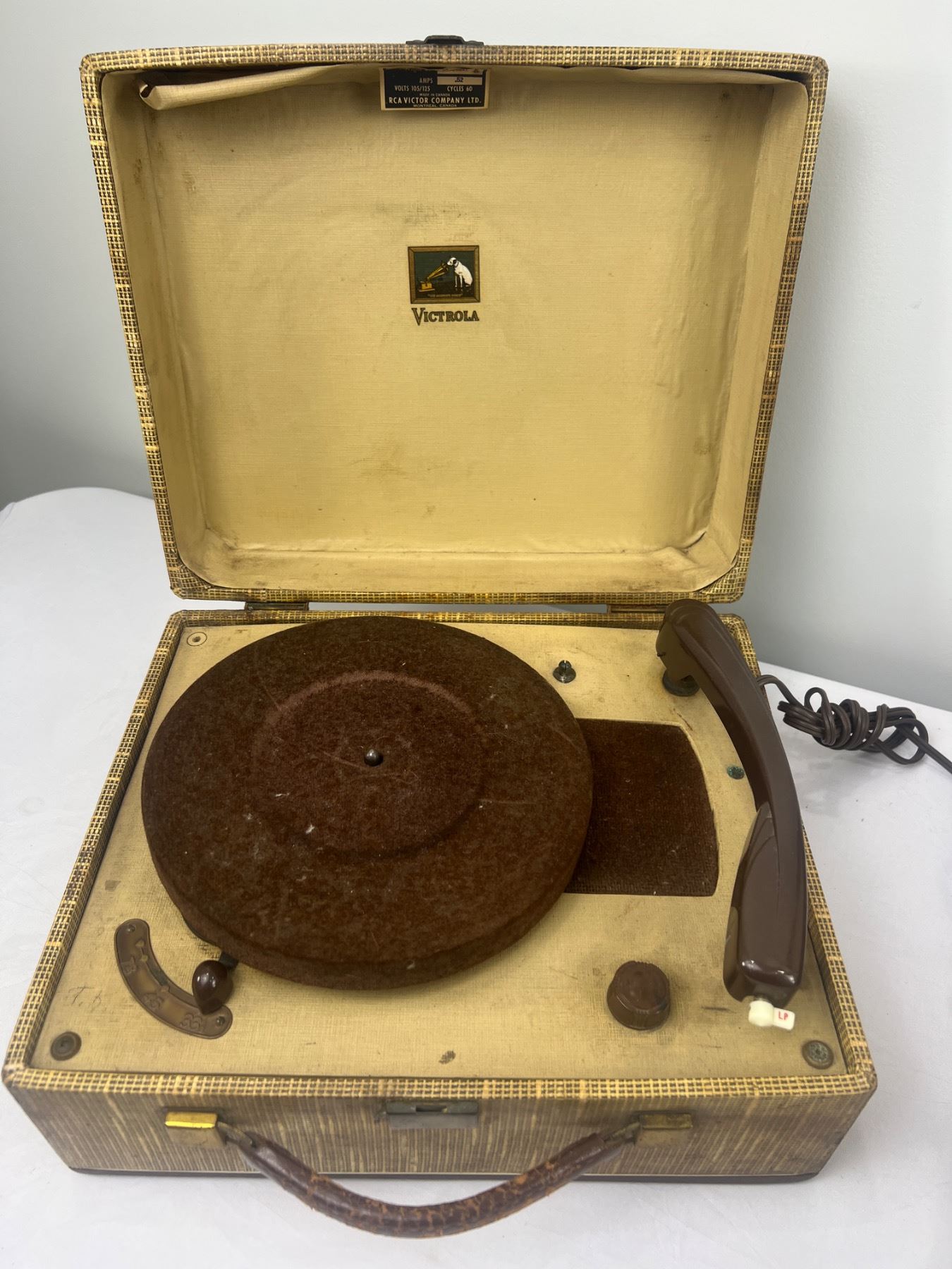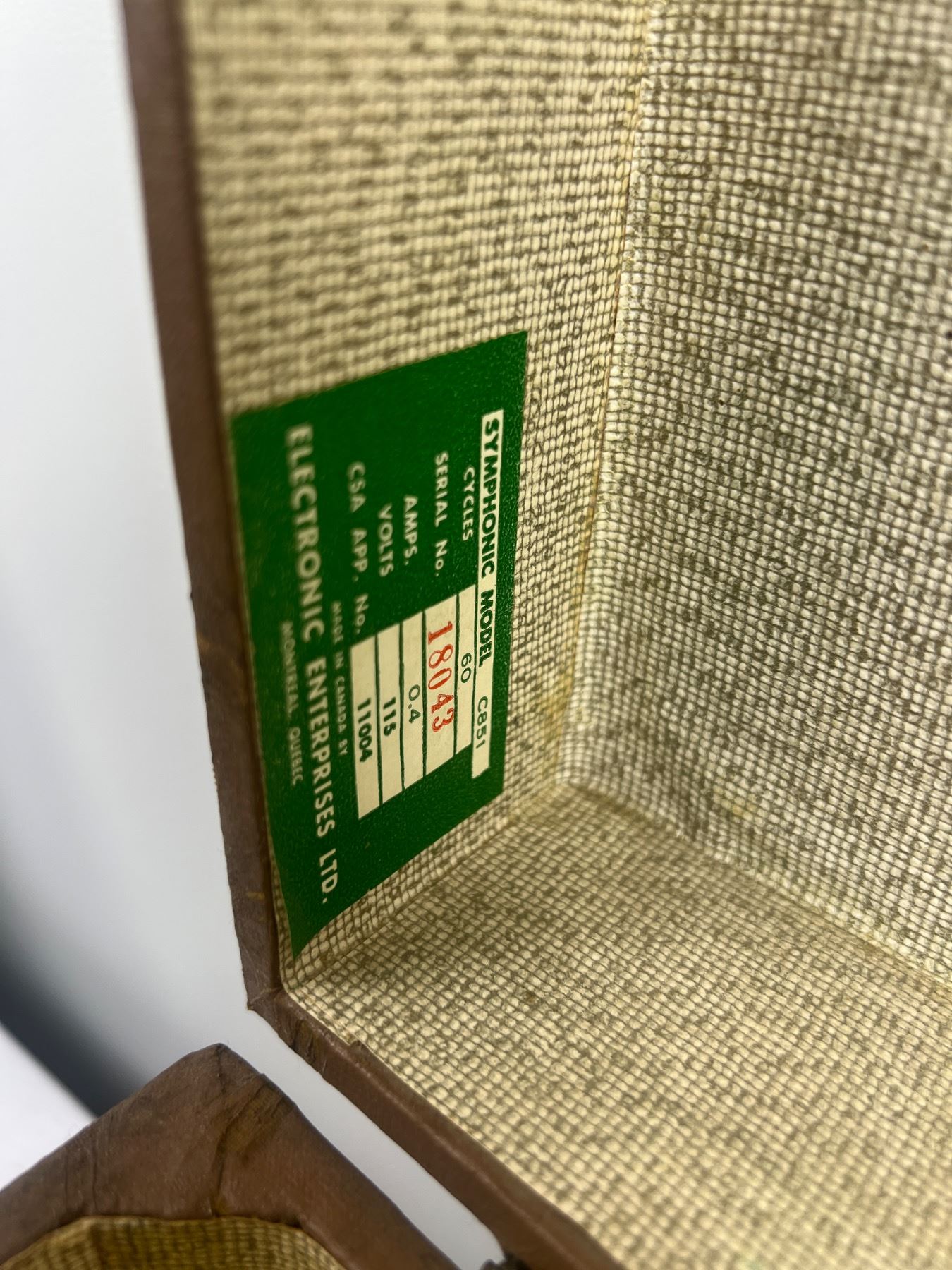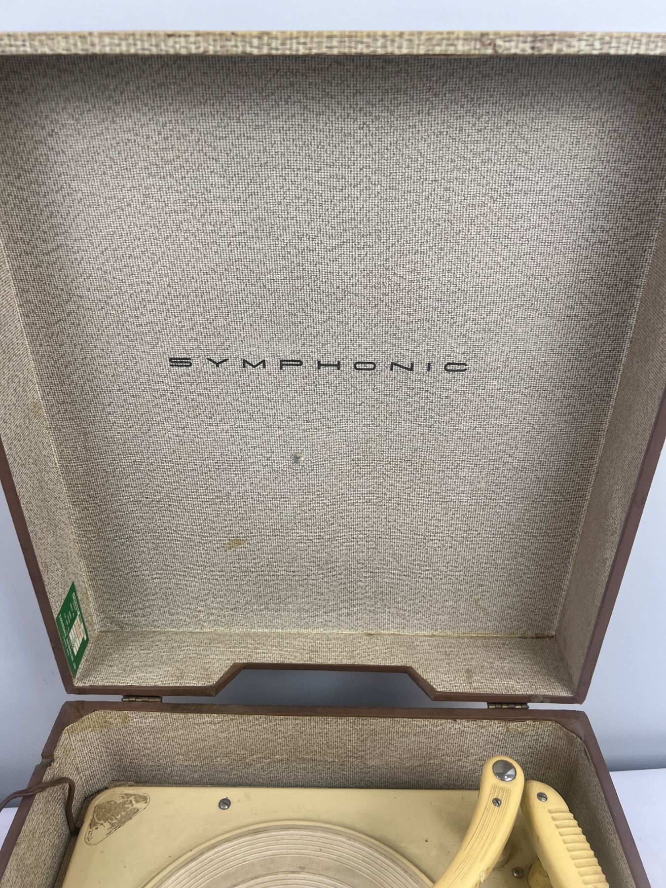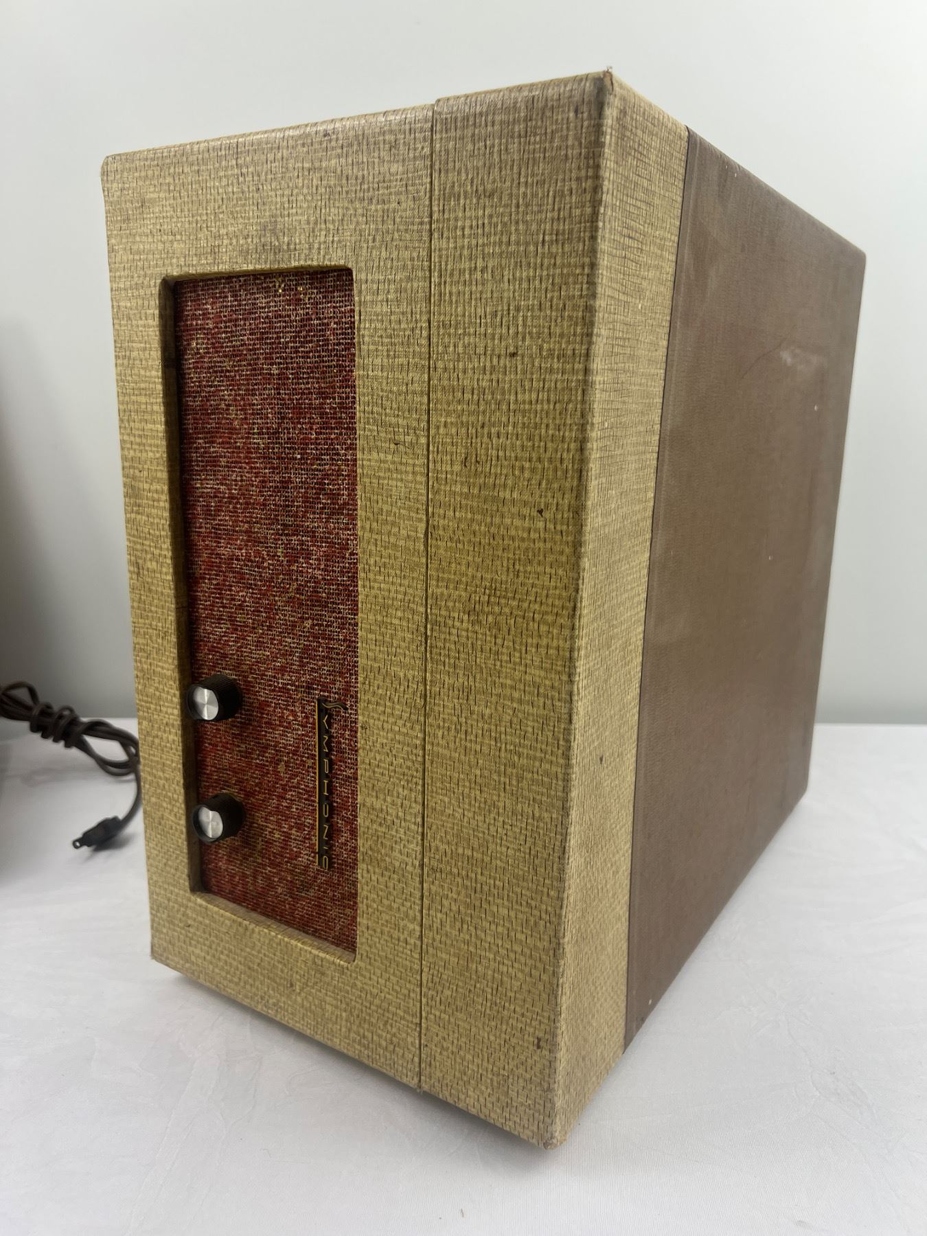 Both have some wear and tear, both have power, The Symphonic Model C851 is 16"L x 15"W x 9"H, The Victorola Model VE 42 M is 13"L x 11"W x 7.5"H