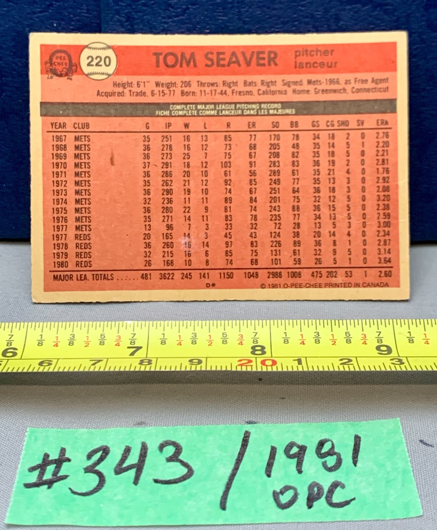 MLB Baseball Card - 1981 OPC Vintage Tom Seaver #220