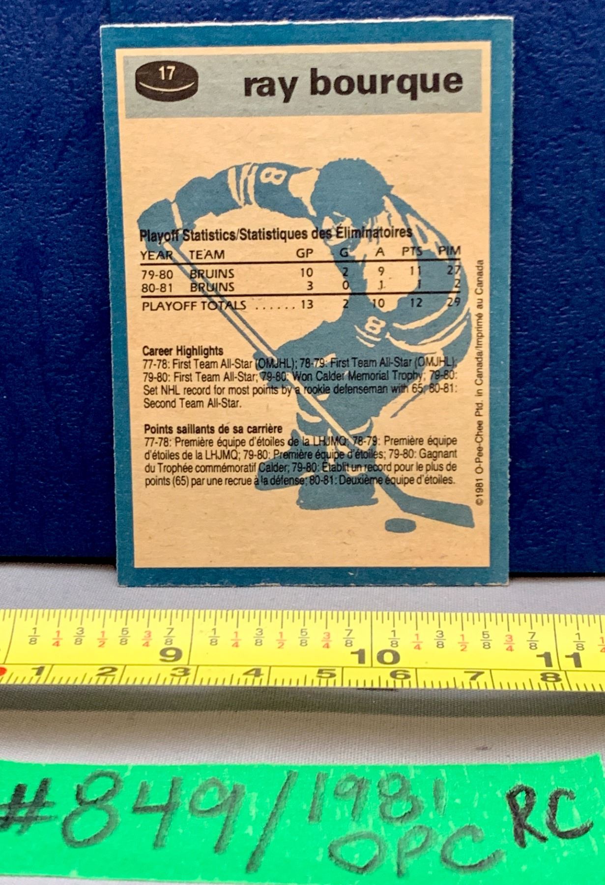 Lot 849 NHL HOCKEY - OPC Ray Bourque 1981 RC / Super Action GREAT Card!
