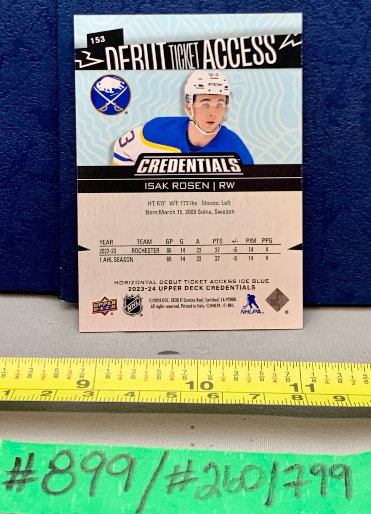 NHL HOCKEY - Credentials Debut Ticket Access Rookie Card - Isak Rosen Sabres #260/799