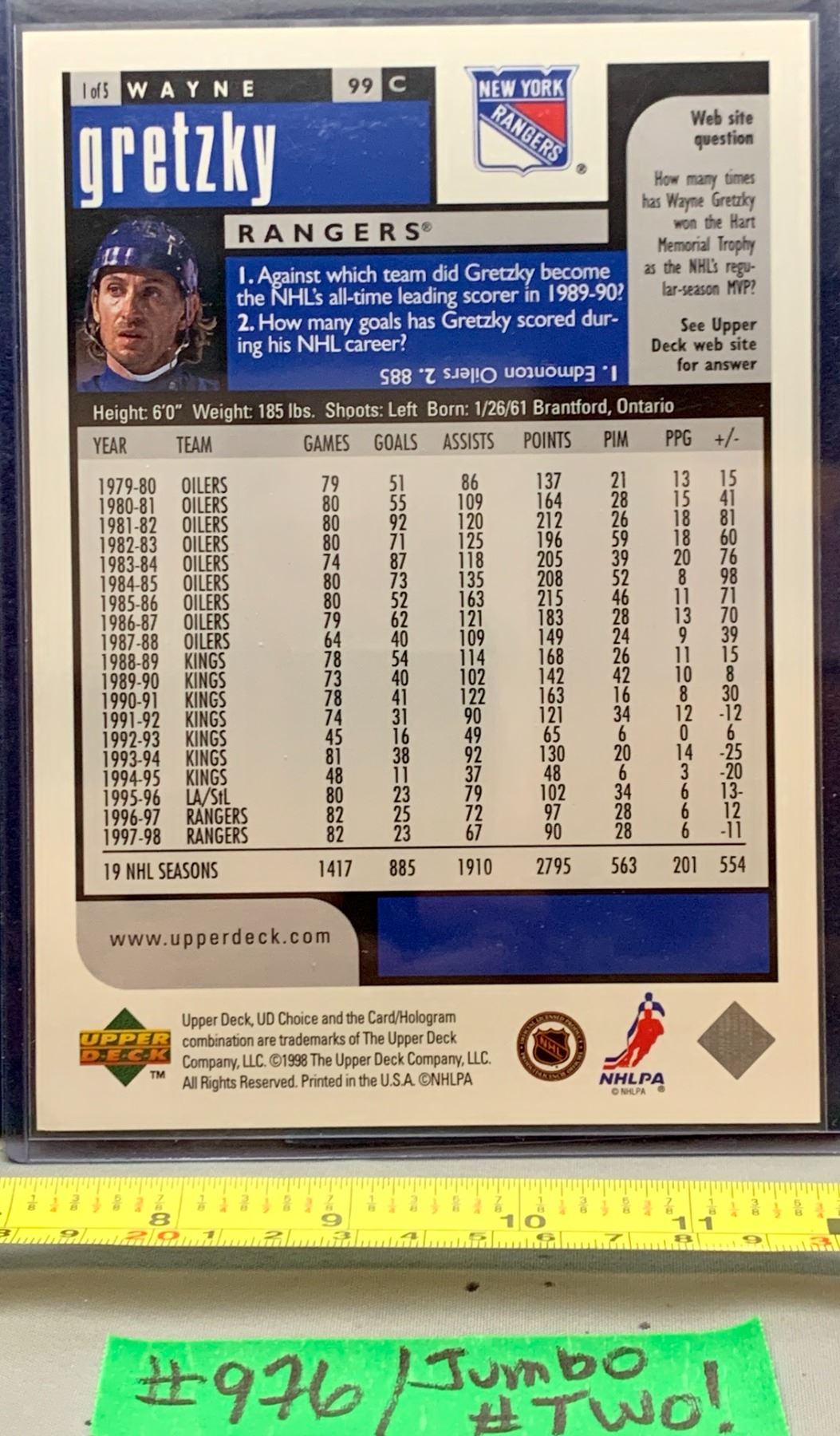 Lot 976 NHL HOCKEY - Wayne Gretzky Rare Upper Deck Choice Jumbo Card in Top Loader
