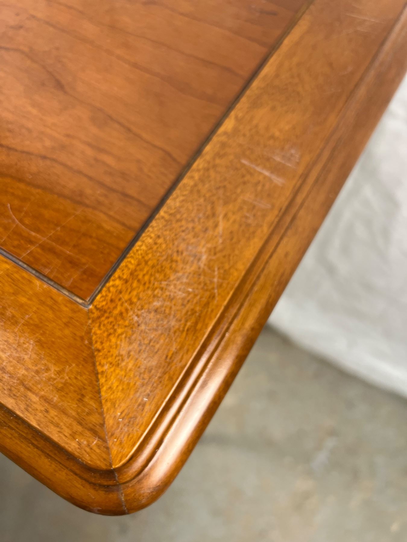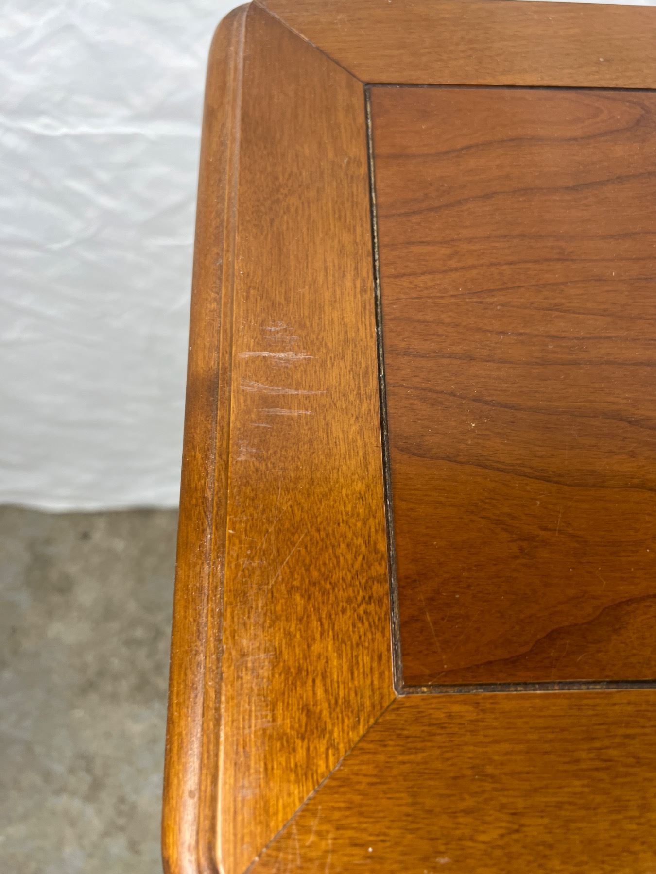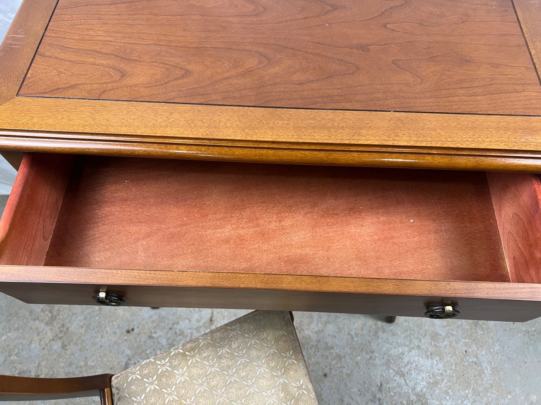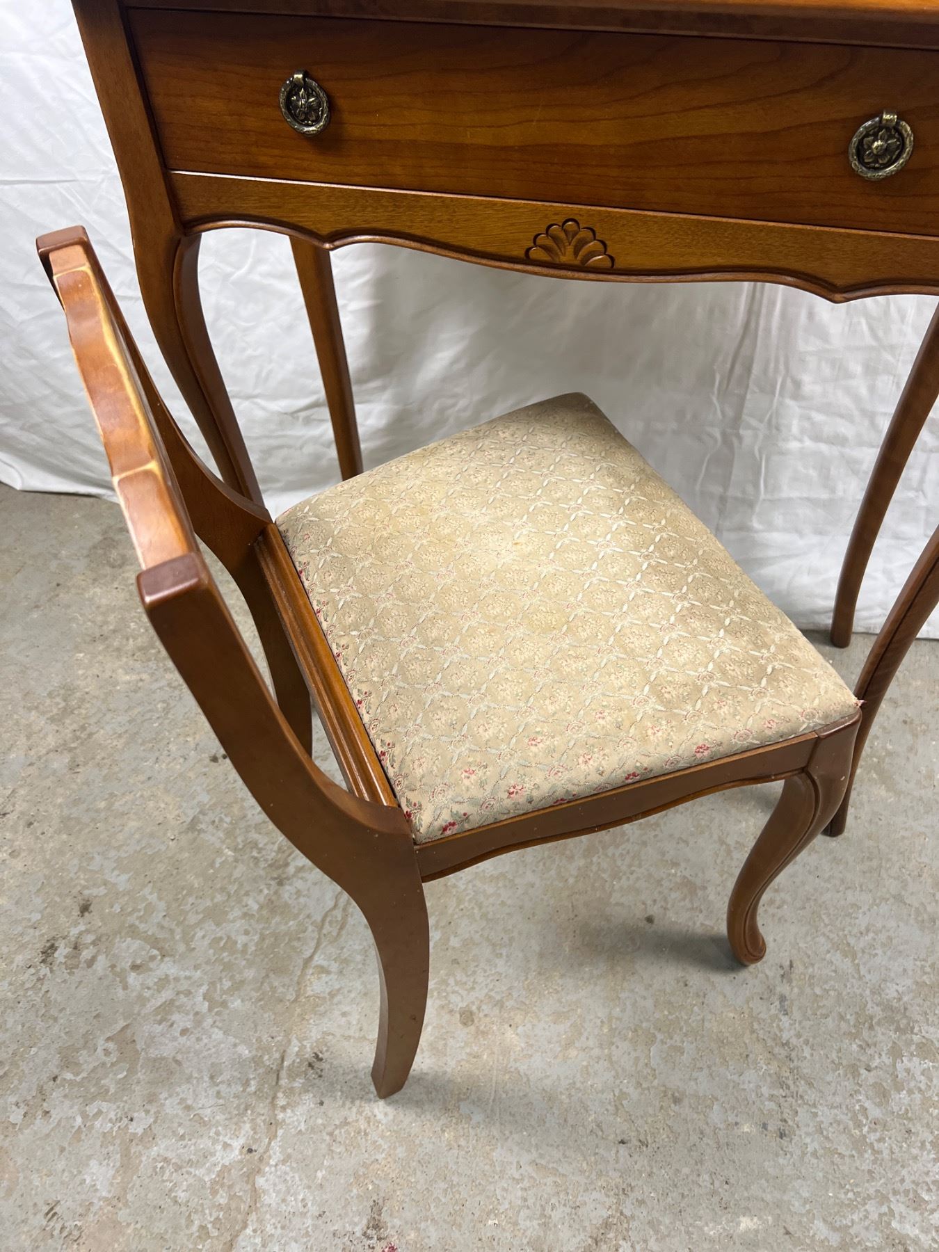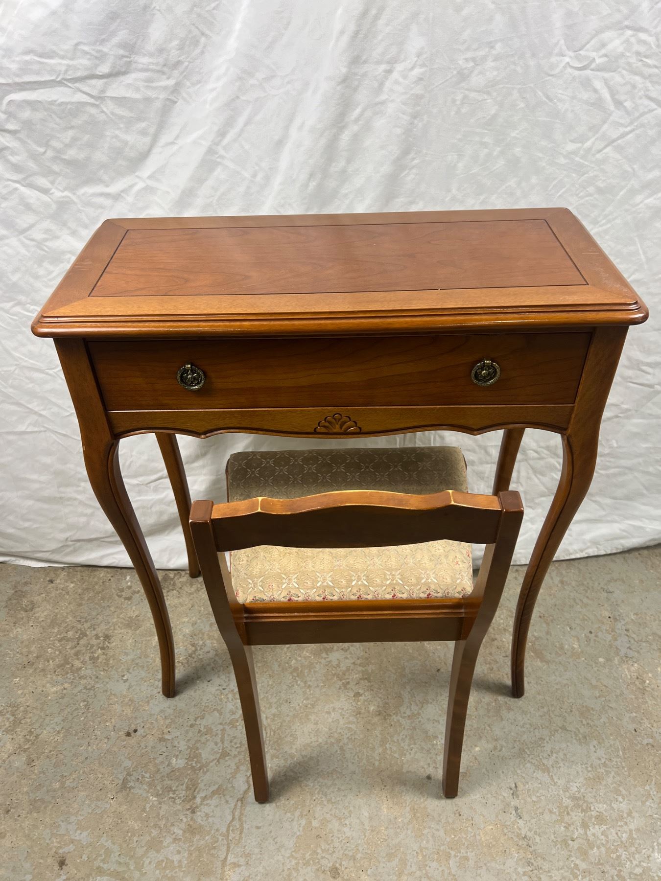 Table has one drawer, the upholstery on the chair has some discolouration, Table measures 26"L x 12"W x 30"H