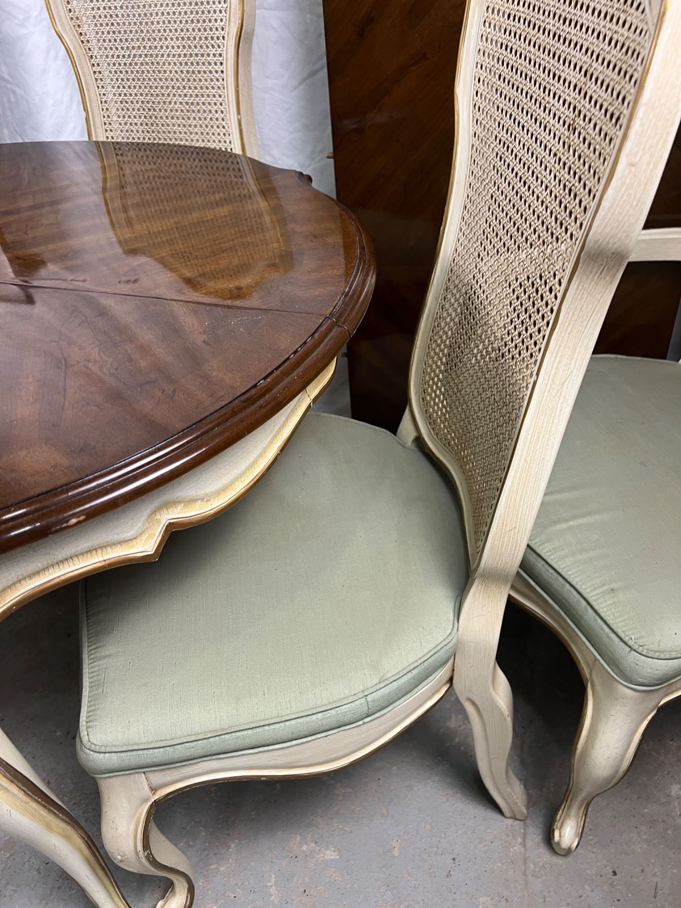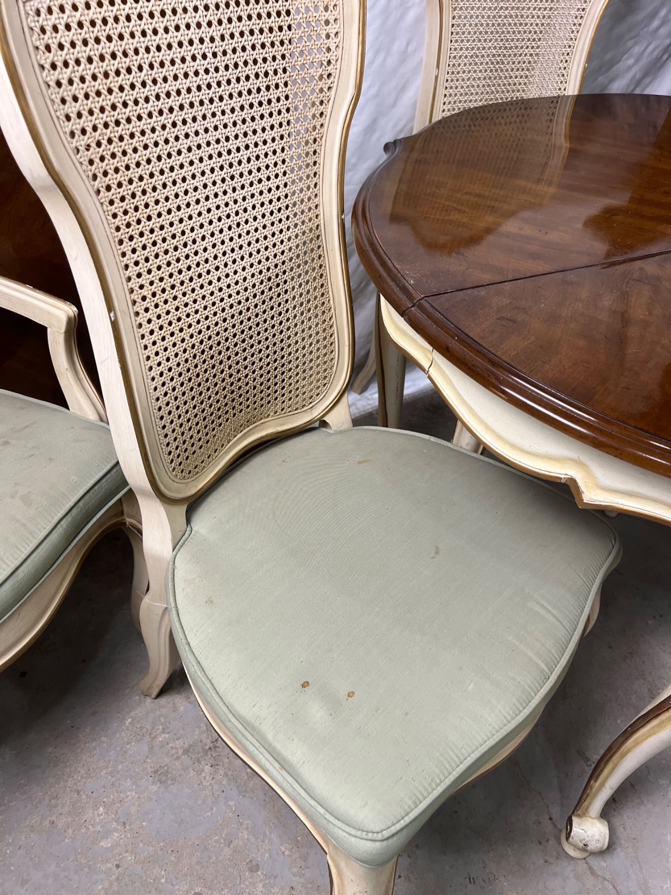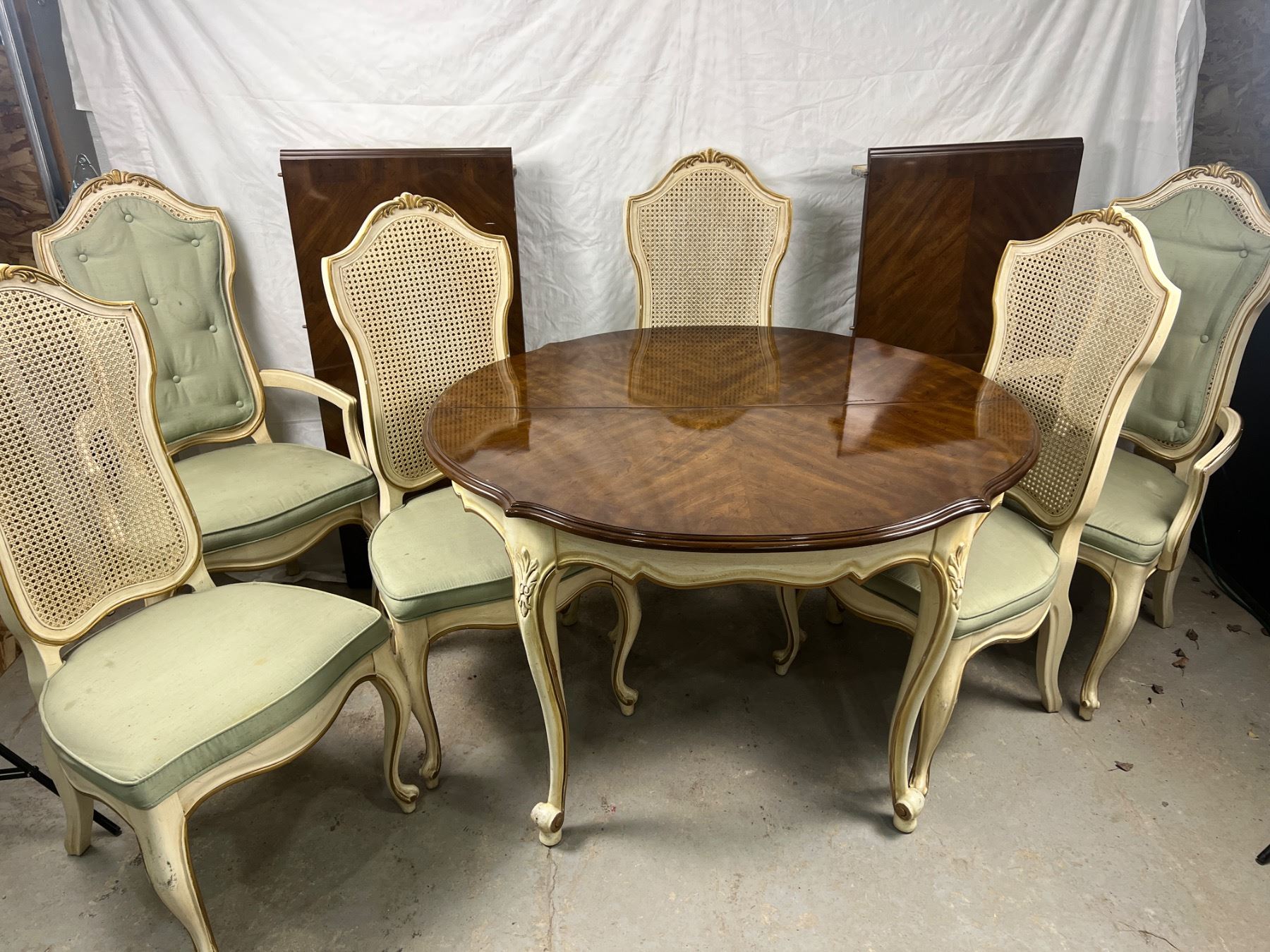 The table with no leafs measures 29.5"H x 44"L x 38"W, The chairs are 41.5"H, Includes two leafs (each is 44"L x 20"W), six chairs (some stains and wear on the upholstery and wooden frames)