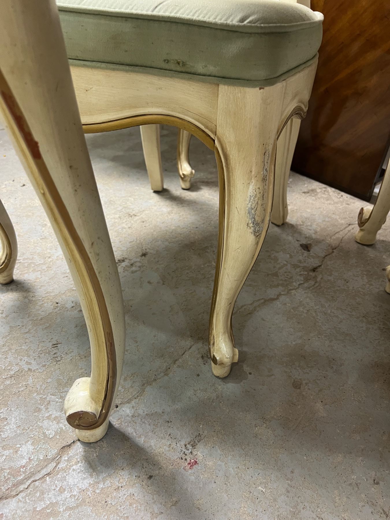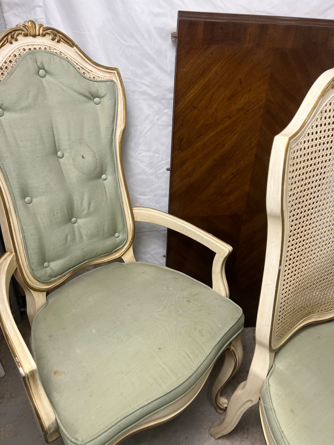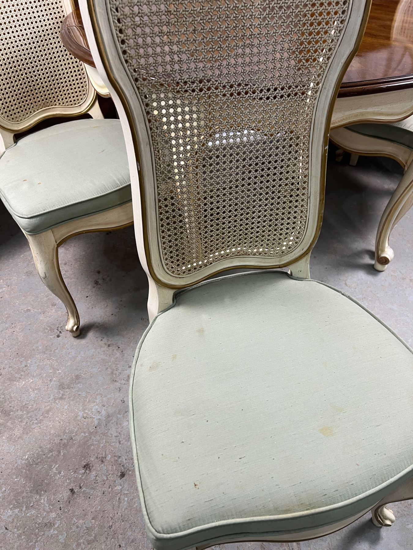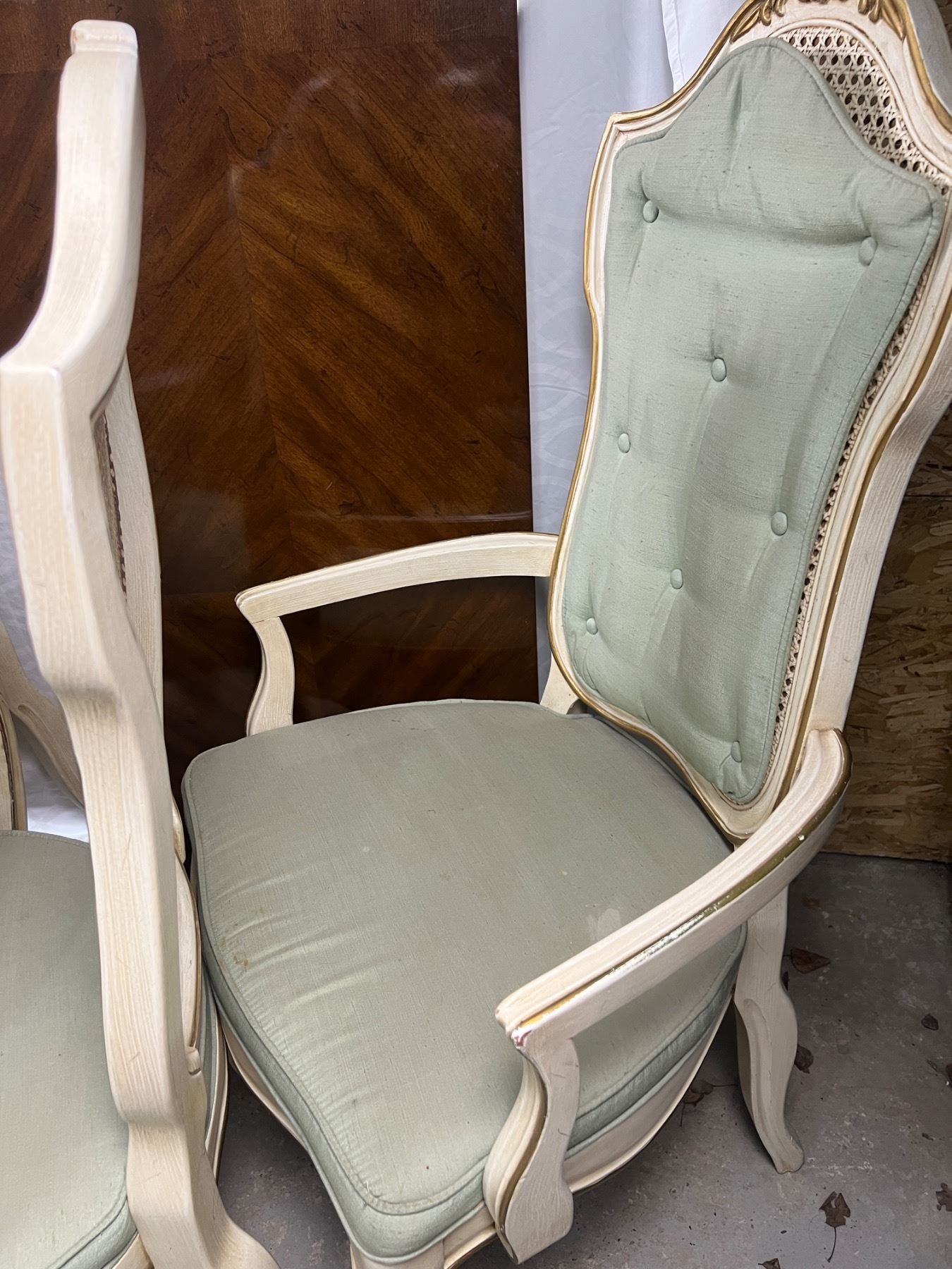The table with no leafs measures 29.5"H x 44"L x 38"W, The chairs are 41.5"H, Includes two leafs (each is 44"L x 20"W), six chairs (some stains and wear on the upholstery and wooden frames)