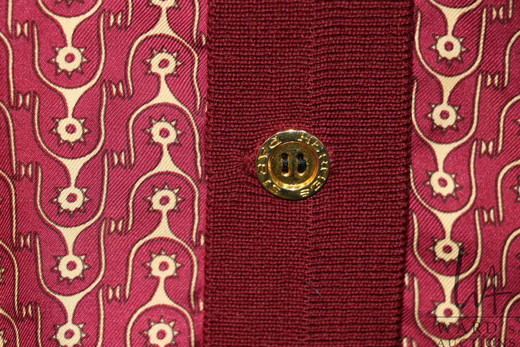 Vintage Hermes wool and stirrup printed silk cardigan, marked size 42 Note: buyers must satisfy themselves as to authenticity. Feel free to contact auction house regarding images that you require that may have been overlooked during original cataloguing and photography