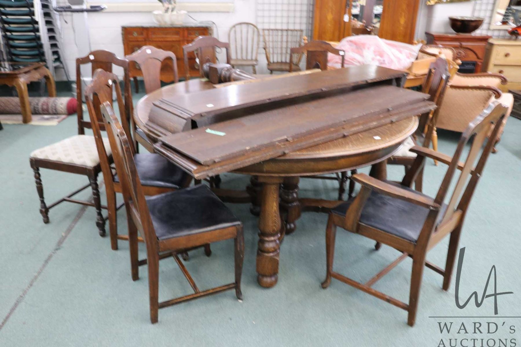 Fabulous 60" diameter, quarter cut oak antique dining table with three 12" non-skirted leaves and two 12" skirted leaves plus nine dining chairs that were used with it but do not match