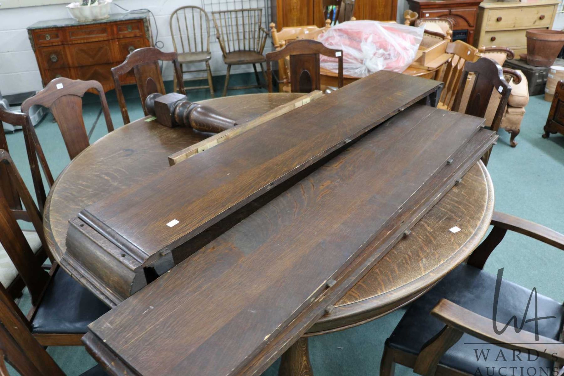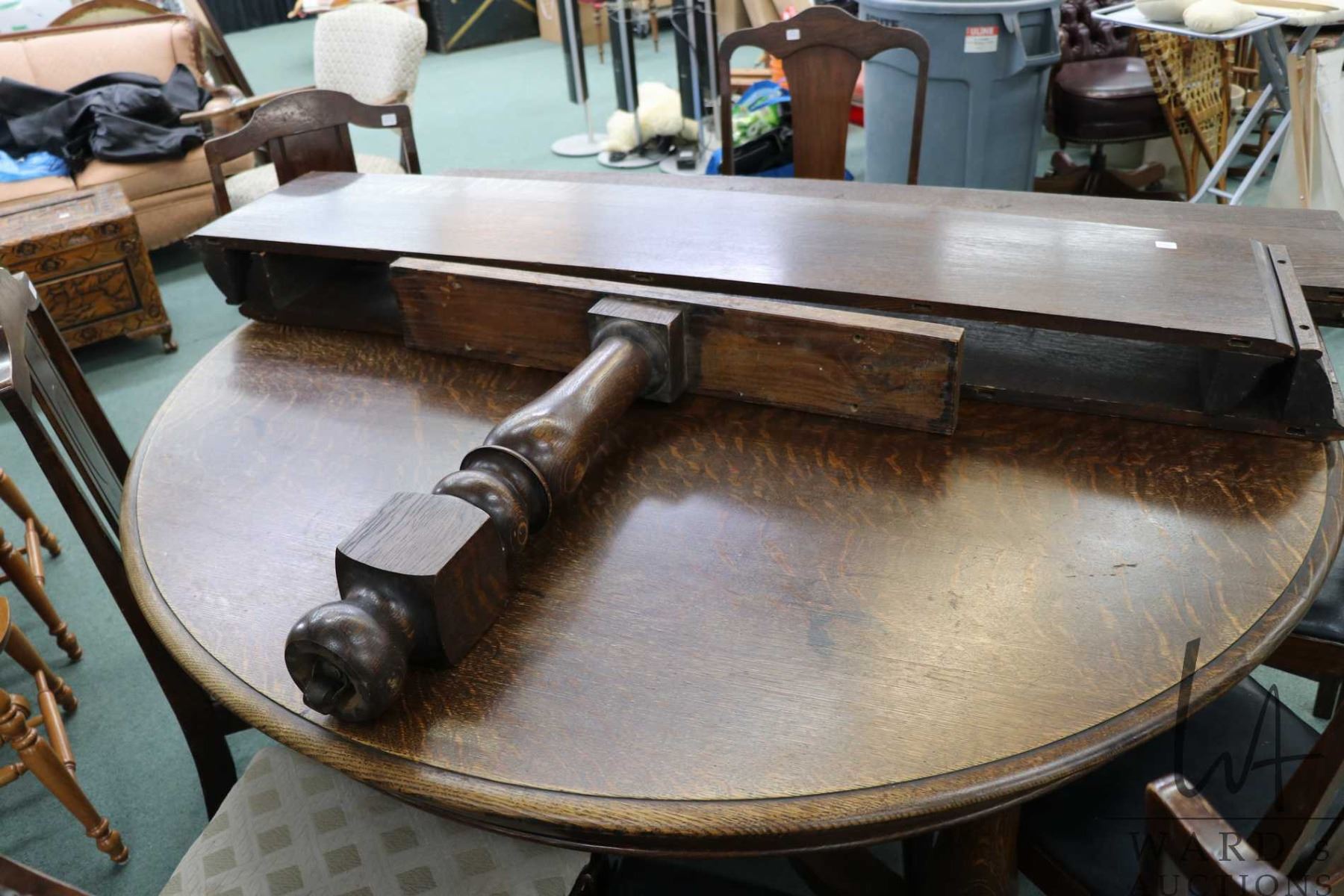 Lot 330a Fabulous 60" diameter, quarter cut oak antique dining table with three 12" non-skirted leaves and tw