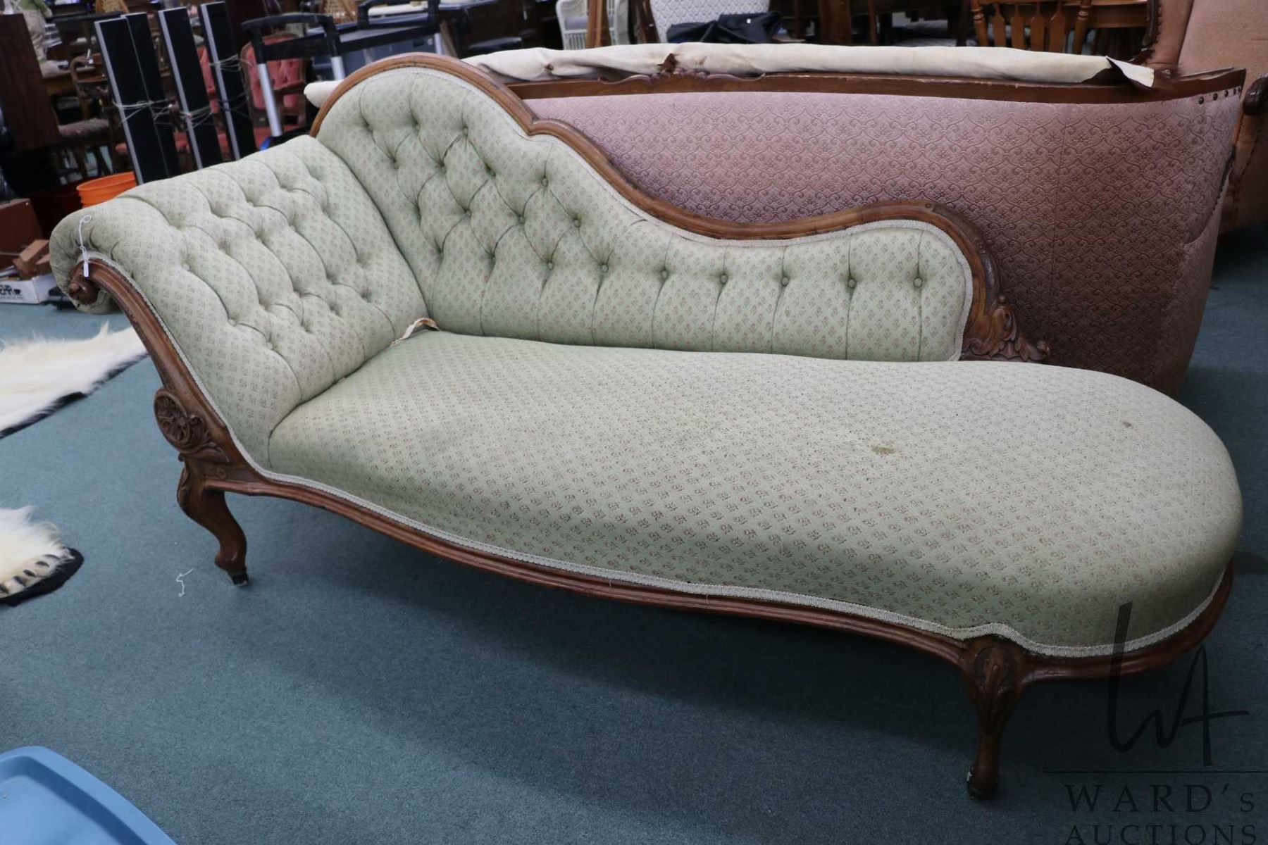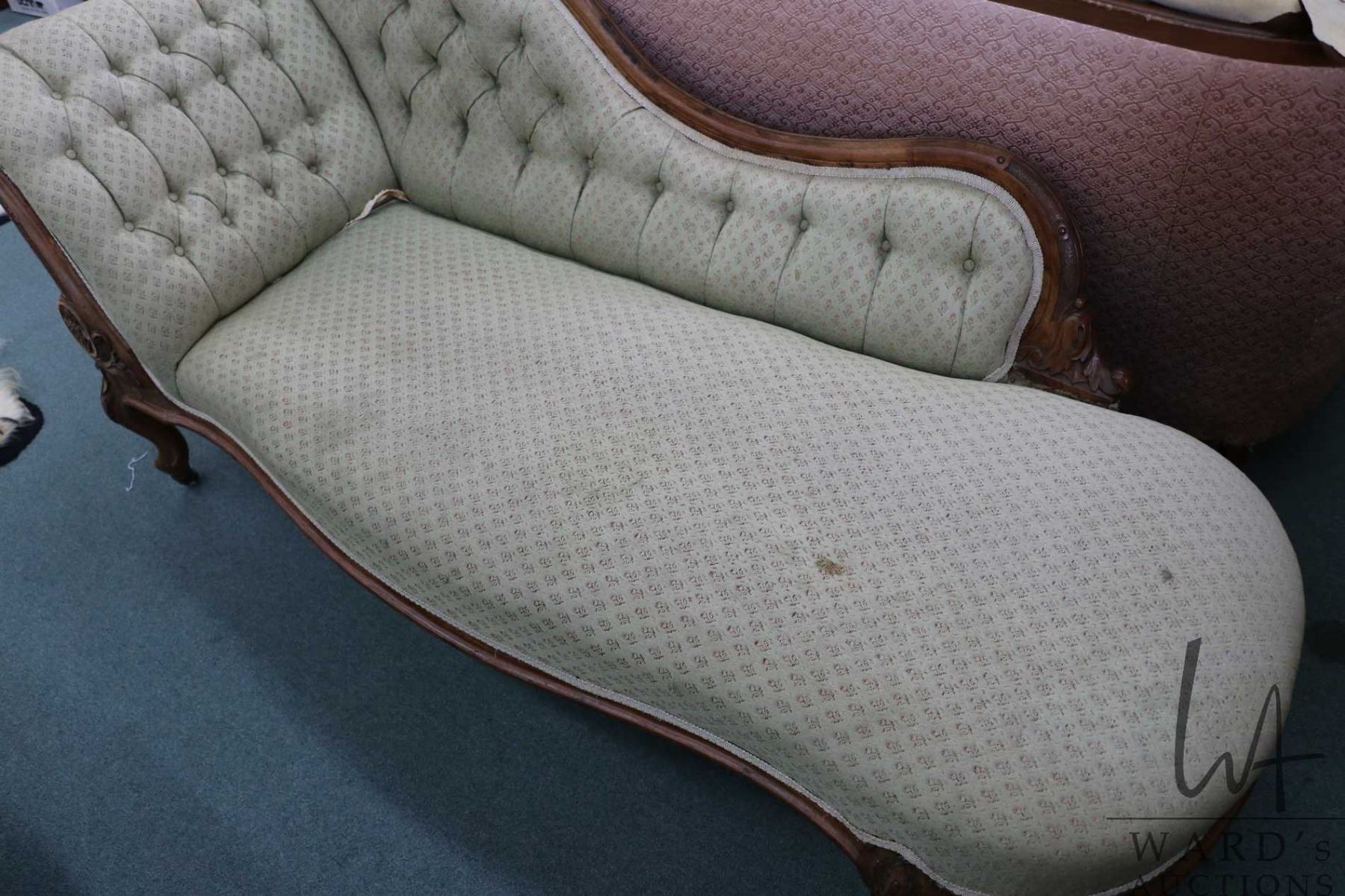Lot 387b Victorian chaise longe with button tufted upholstery, decorative show wood and porcelain castors, 77
