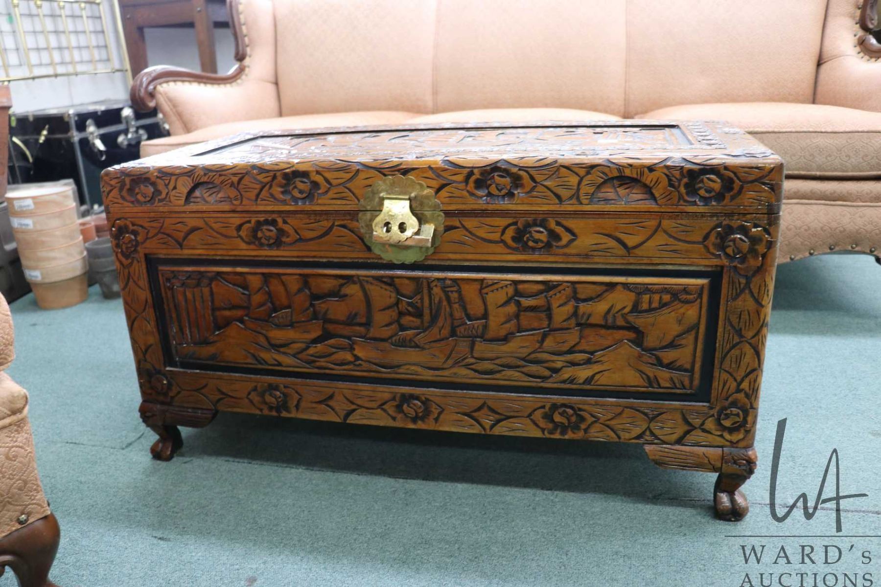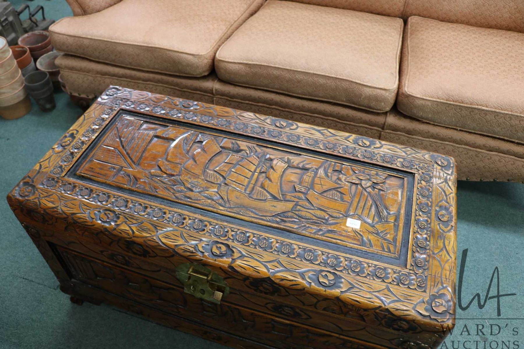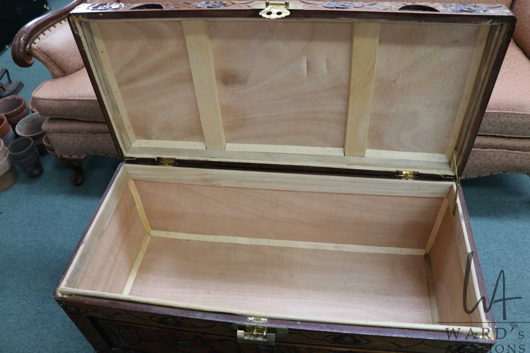 Lot 424c Carved Oriental style camphor wood hinged lid blanket box, 19" X 35" X 17"