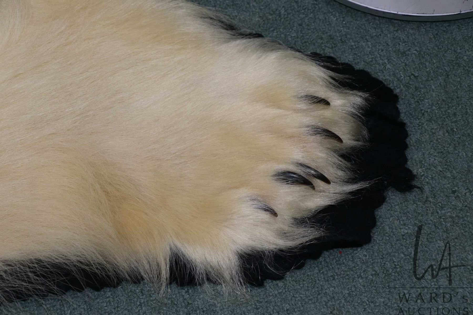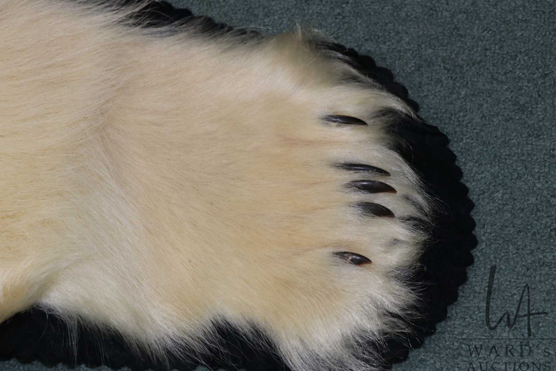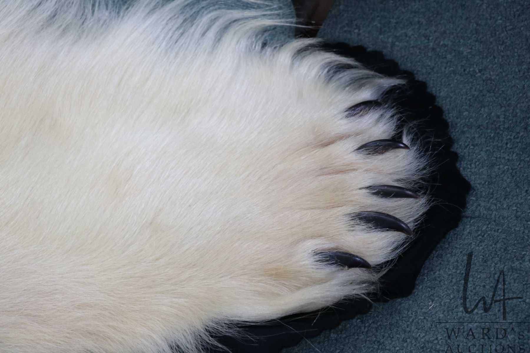 Lot 443a Polar bear rug on black wool backer, 83" tail to nose, left front paw 8" across and 5" claw to claw