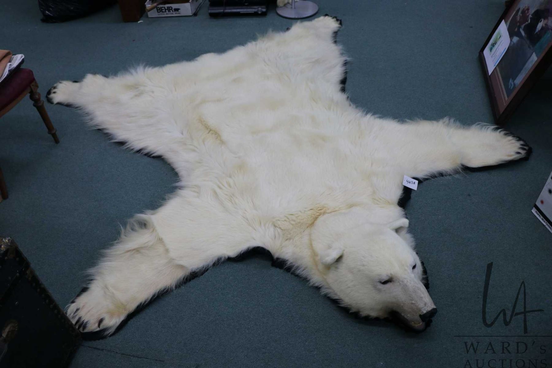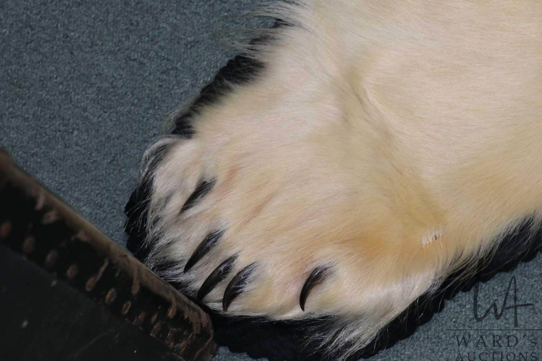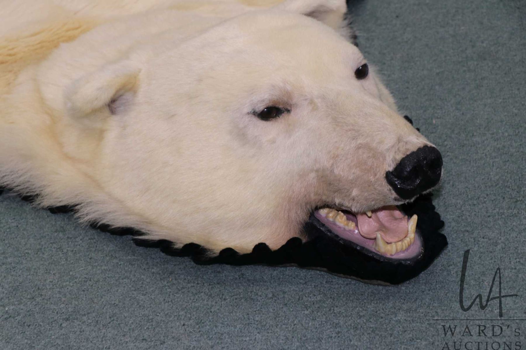Lot 443a Polar bear rug on black wool backer, 83" tail to nose, left front paw 8" across and 5" claw to claw