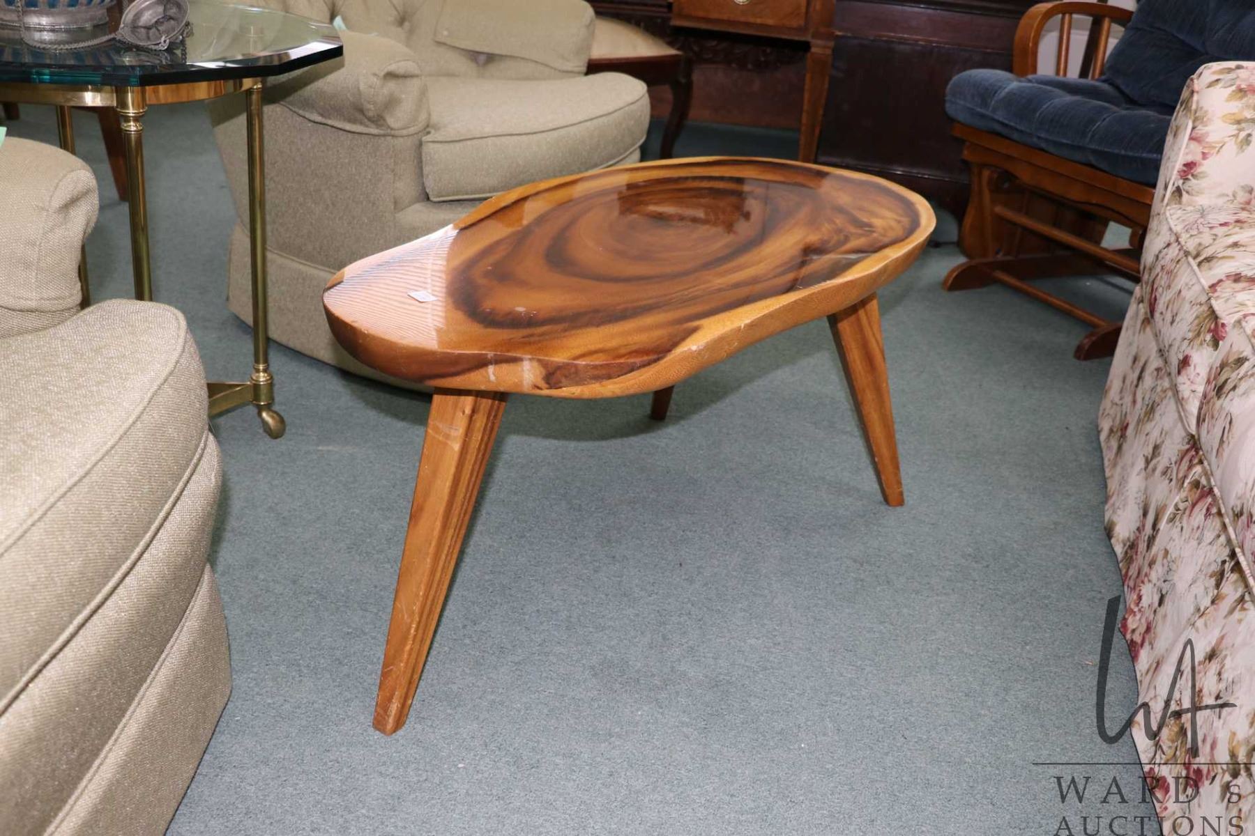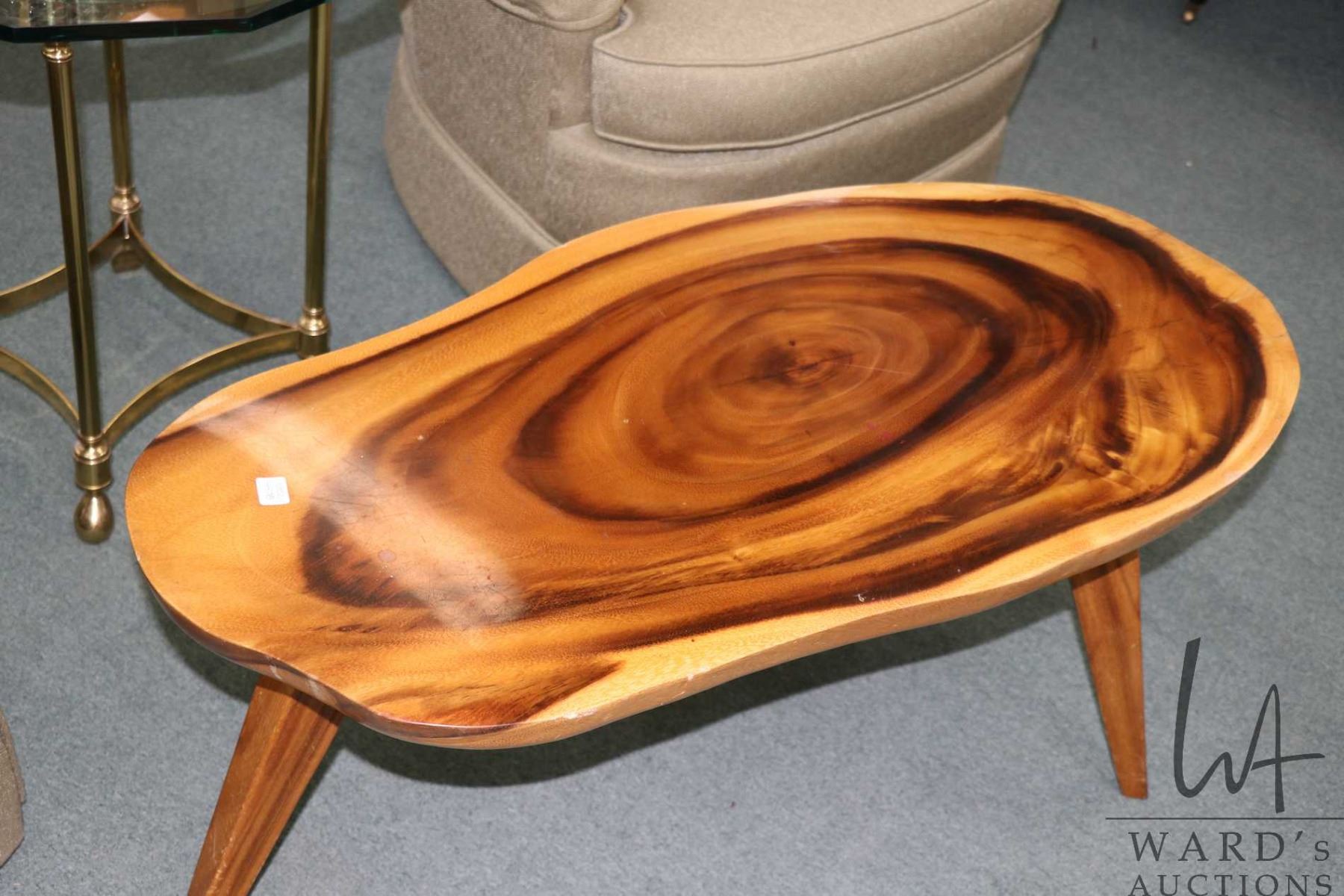Lot 457b Mid century style live edge coffee table on three tapered leg, 17" H X 37" X 18"