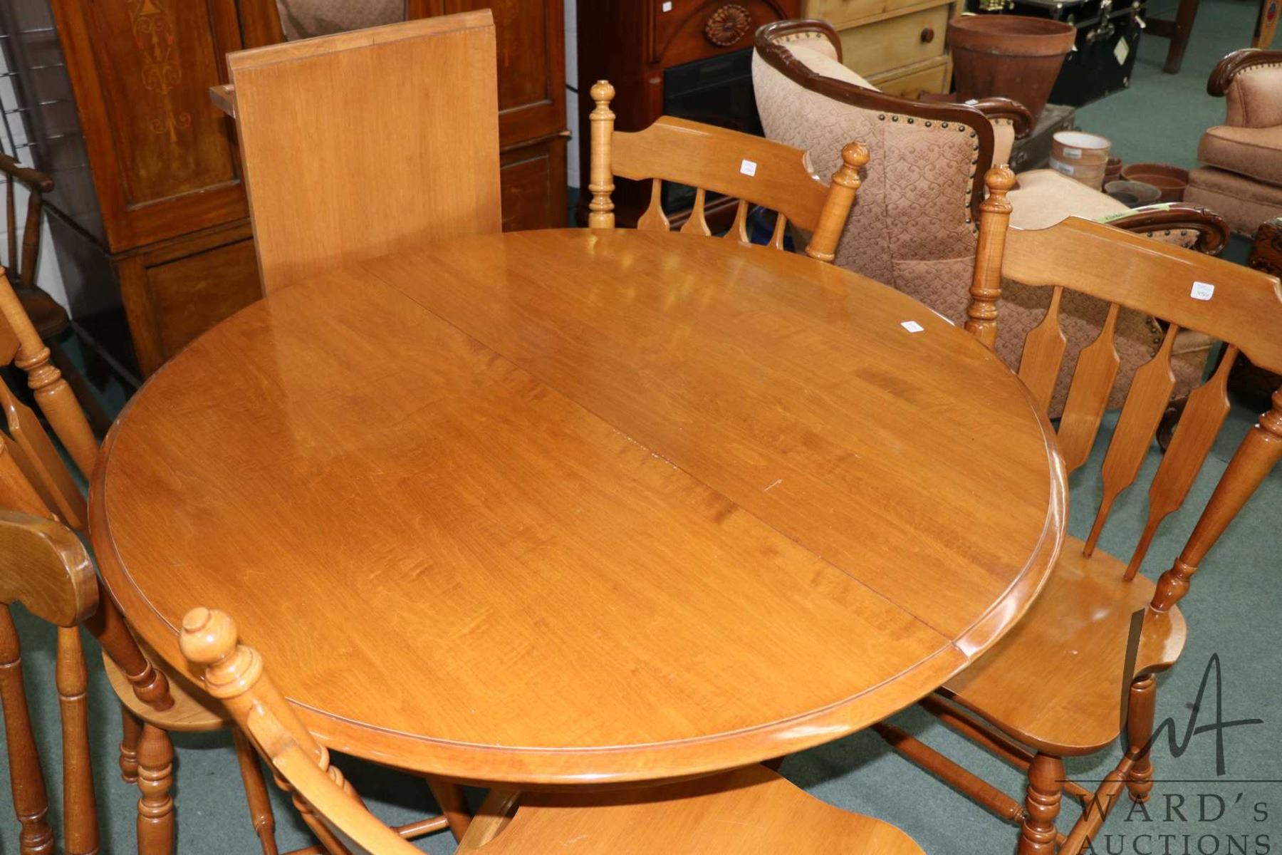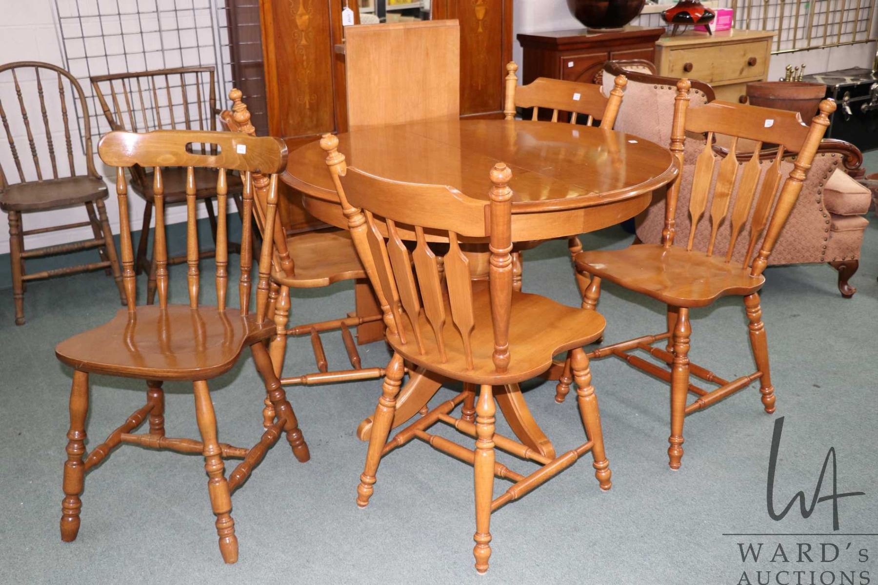Lot 496a 40" diameter center pedestal maple dinette table with one 15" skirted leaf and four arrow back chair