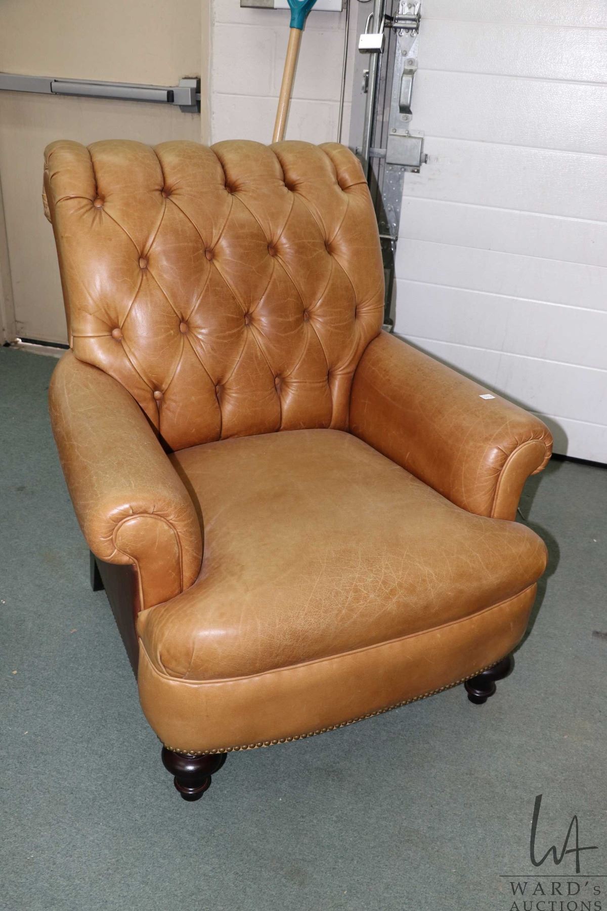 Quality two tone leather upholstered club style parlour chairs with decorative nail head beading and button tufted bascks