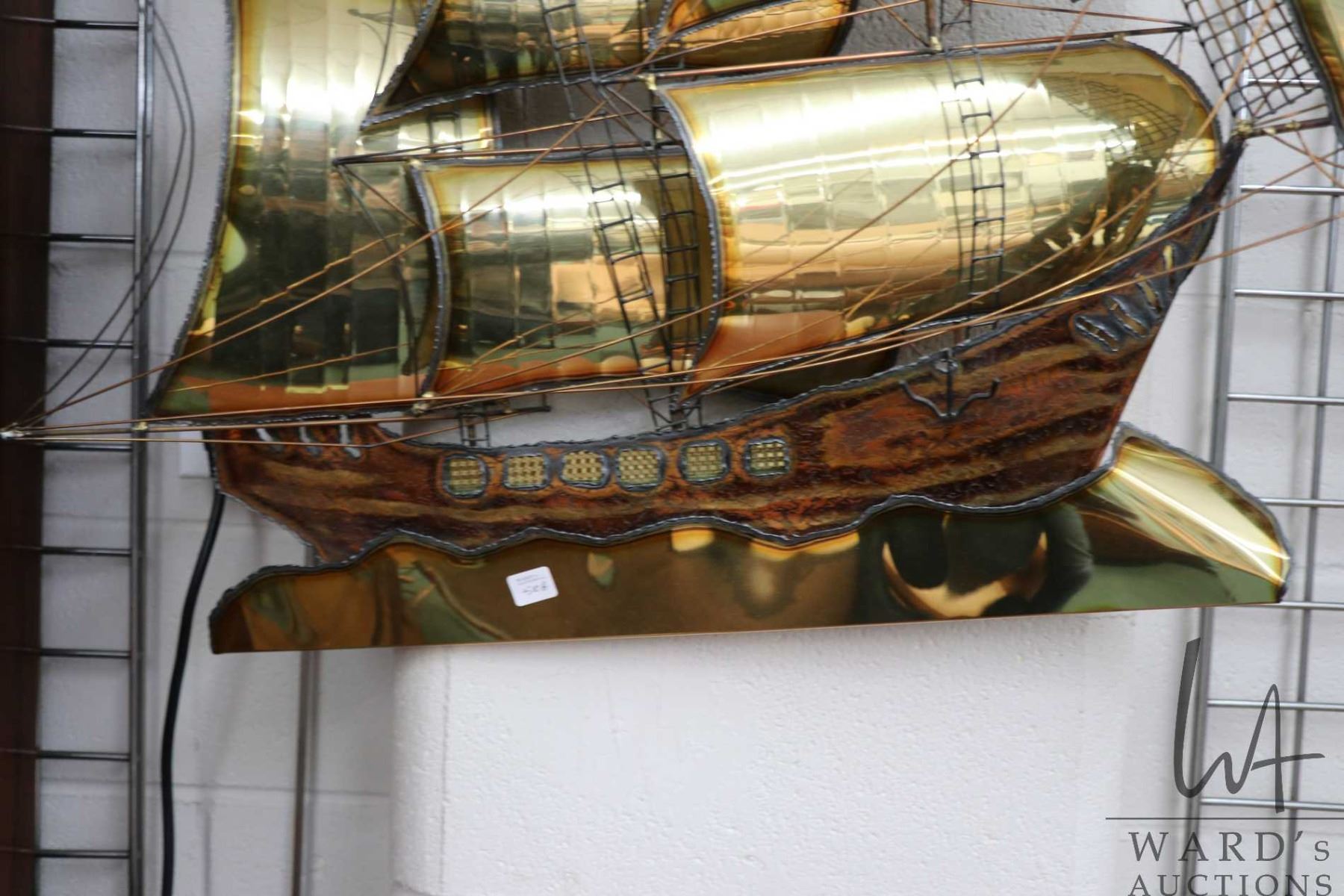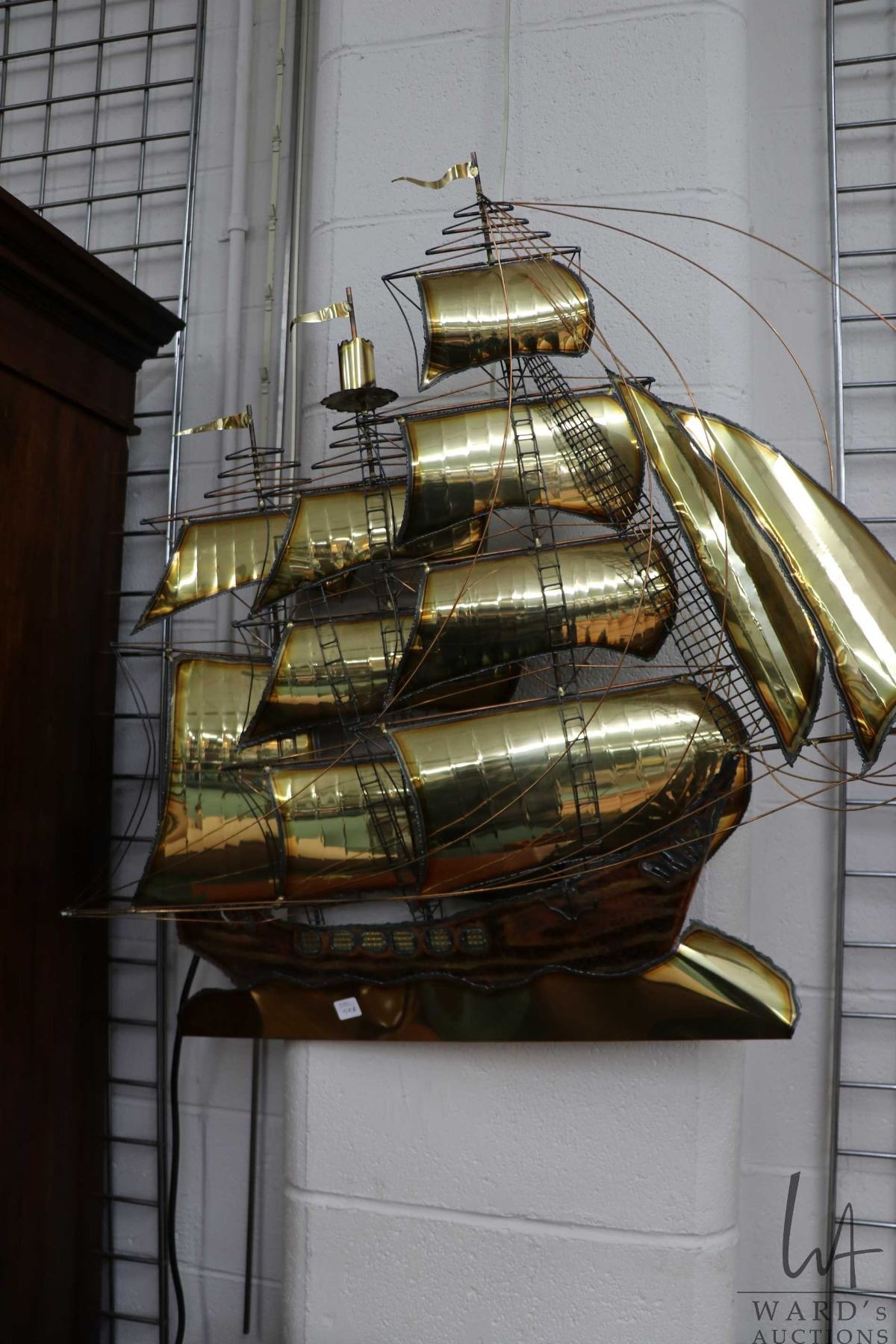 Lot 510a Mid century modern style brass and copper tall ship with full sails wall art made by Torch Art Ltd.