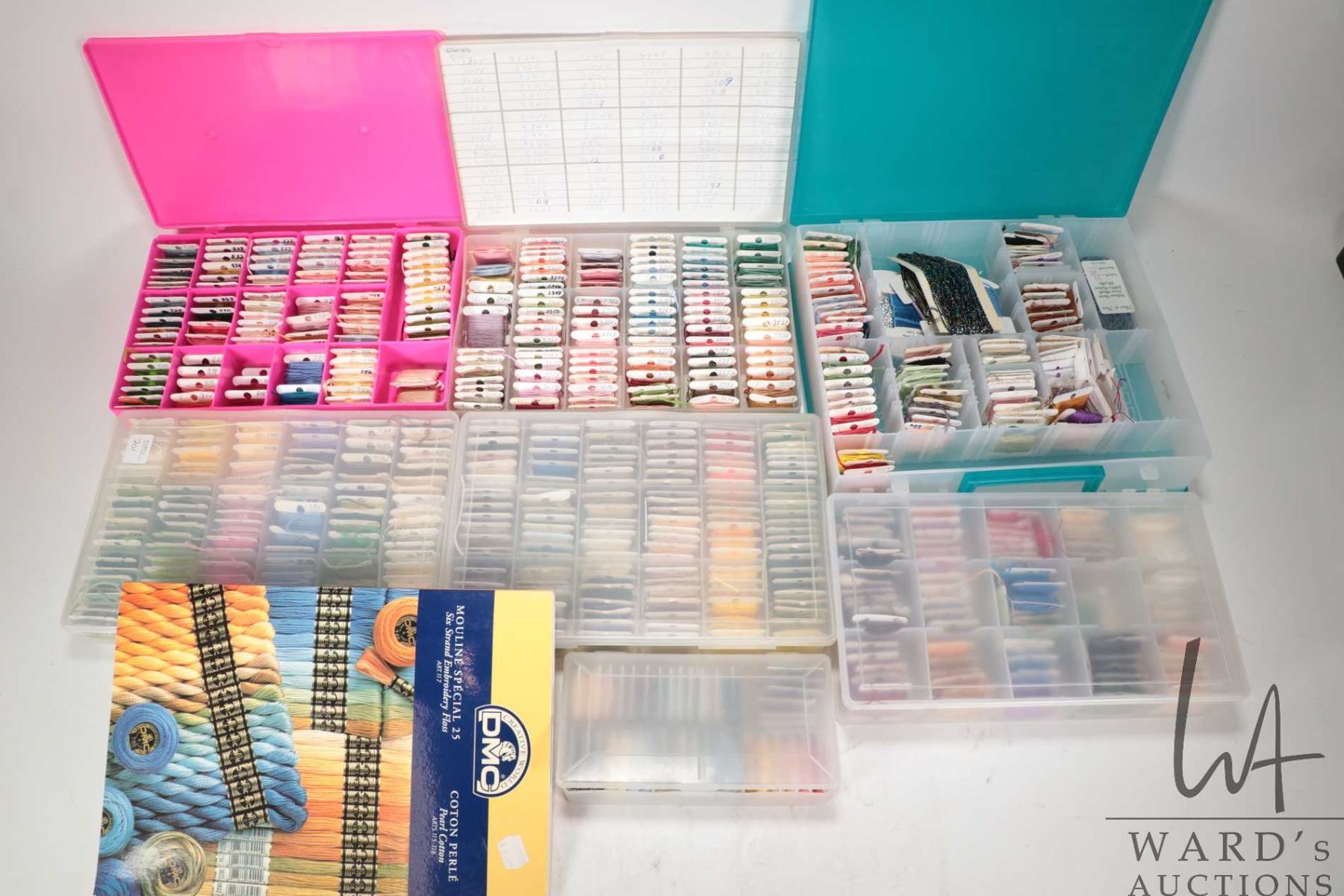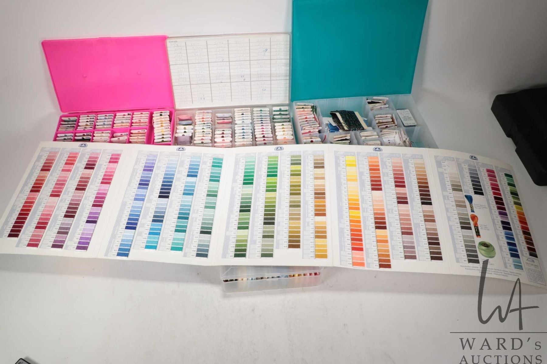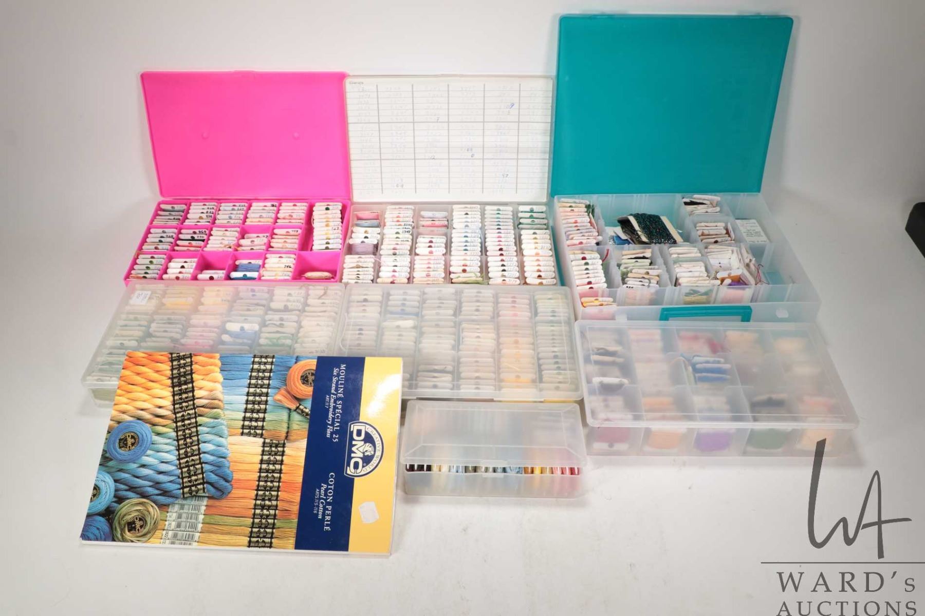 Lot 701 Six plastic floss holders filled with assorted embroidery floss plus a DMC colour guide